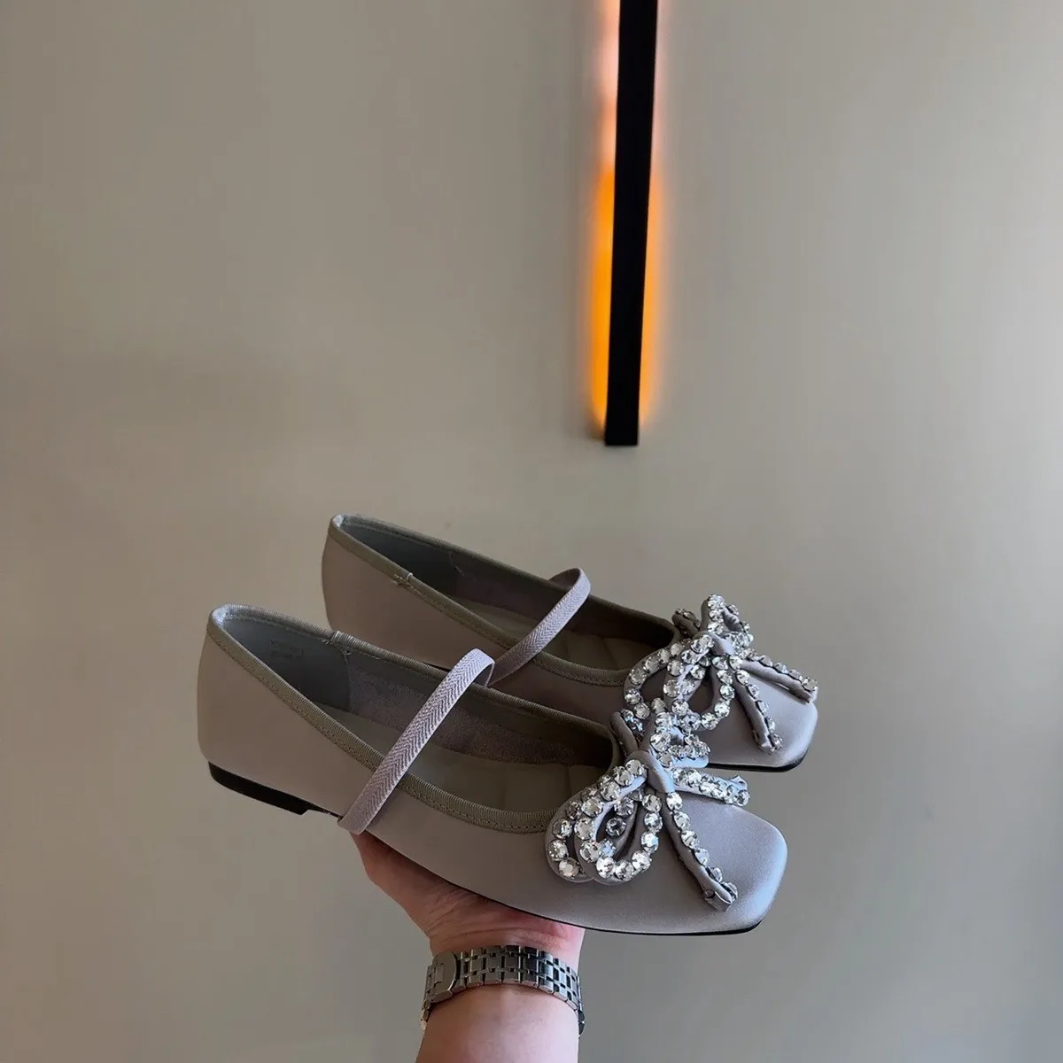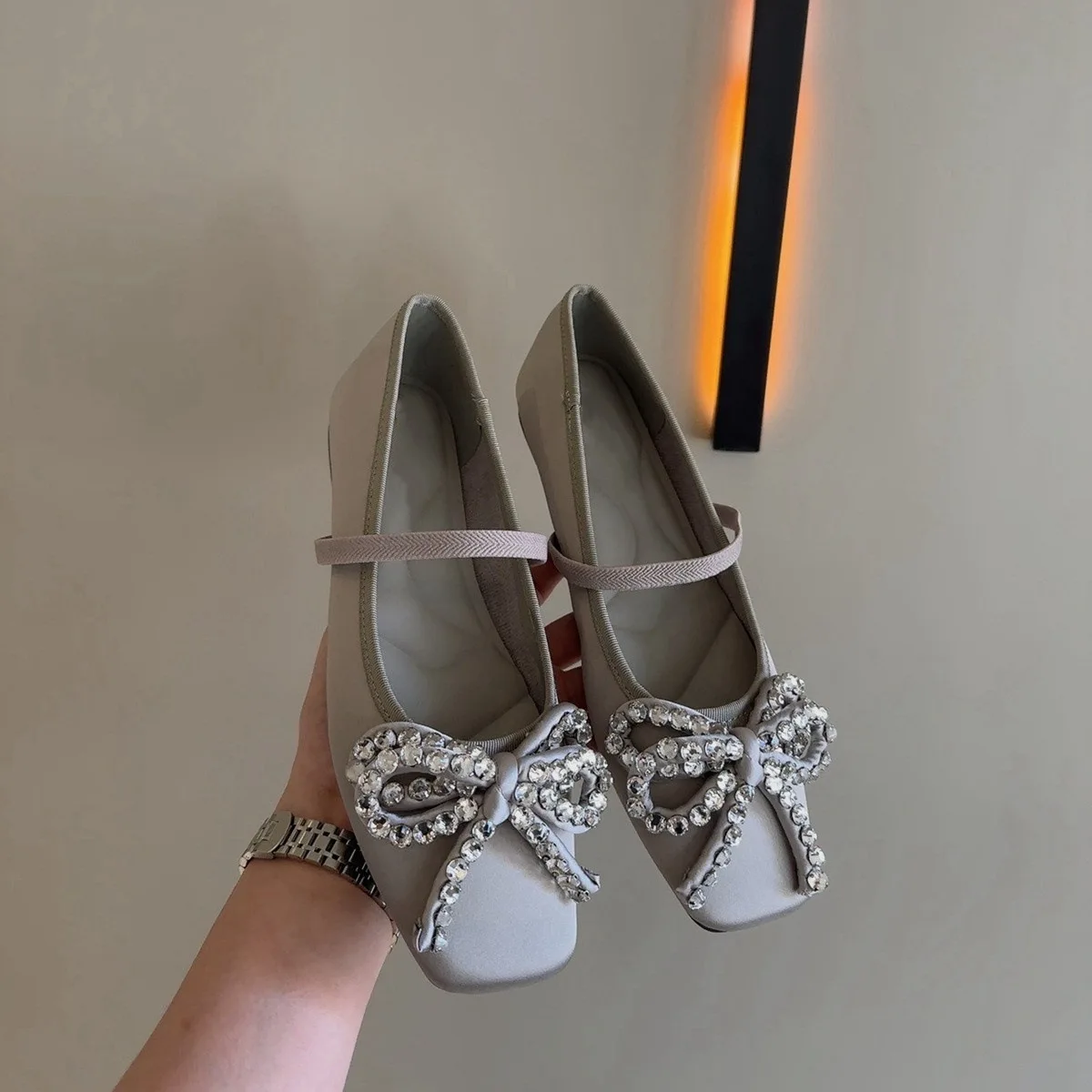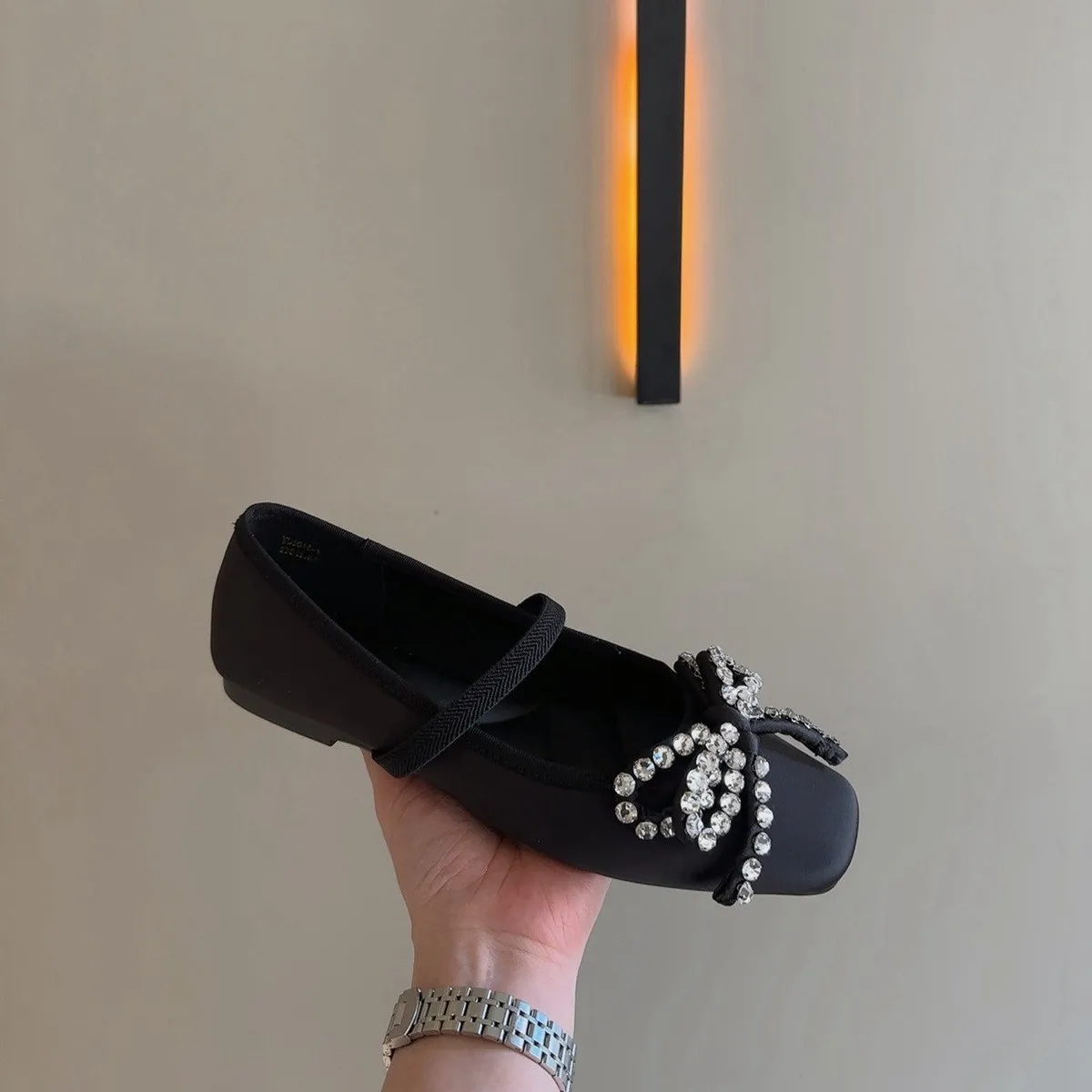 Cyflymder French Rhinestone Bow Square Head Satin Single Shoes Women's 2025 New Versatile One-word Belt Ballet Shoes