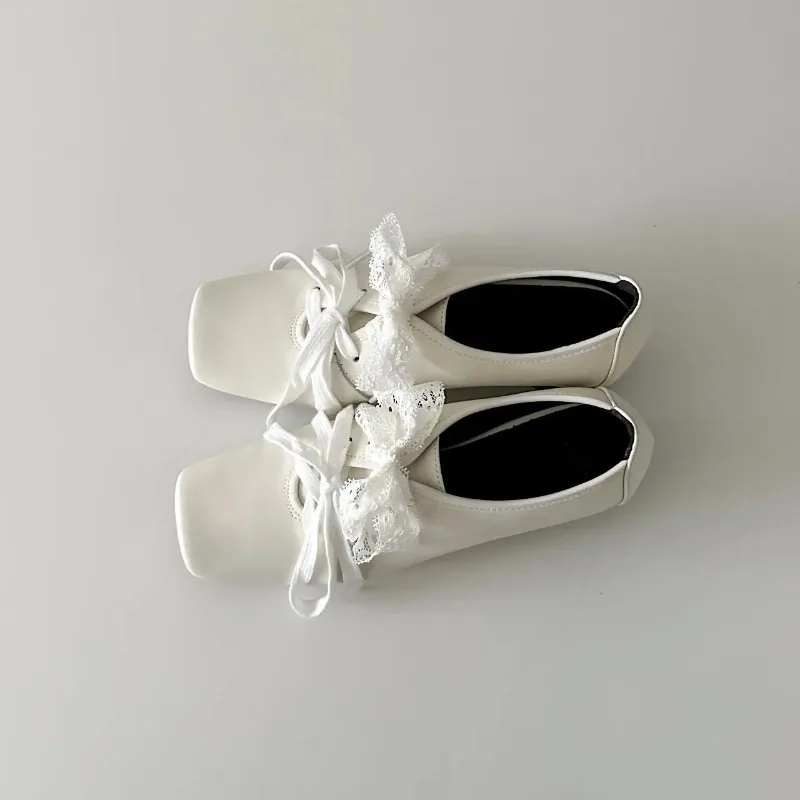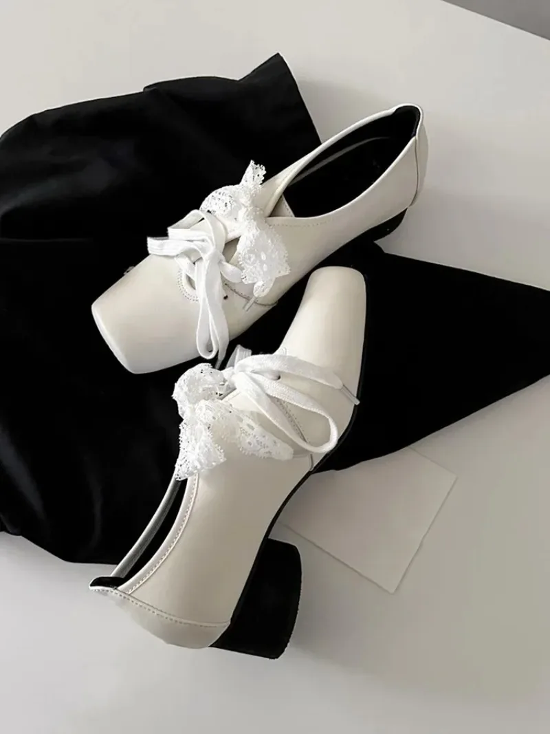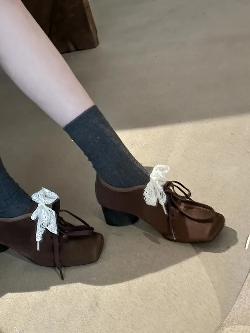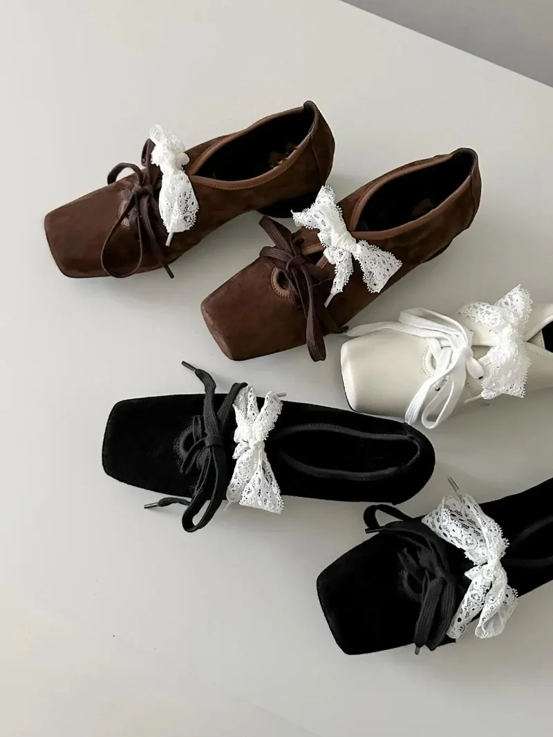 Cyflymder French Style Low Heel Mary Jane Shoes for Women Fashion Faux Suede Lolita Square Toe Lace Up Chunky Heel Casual Designer Shoes