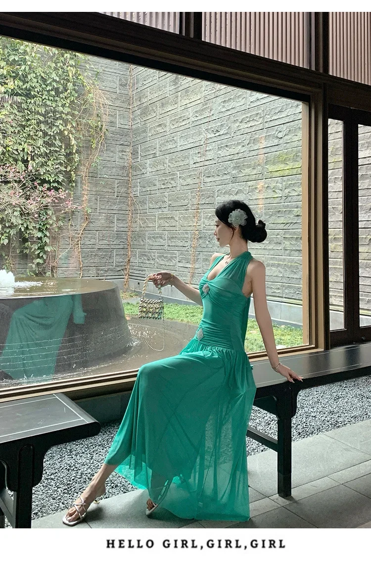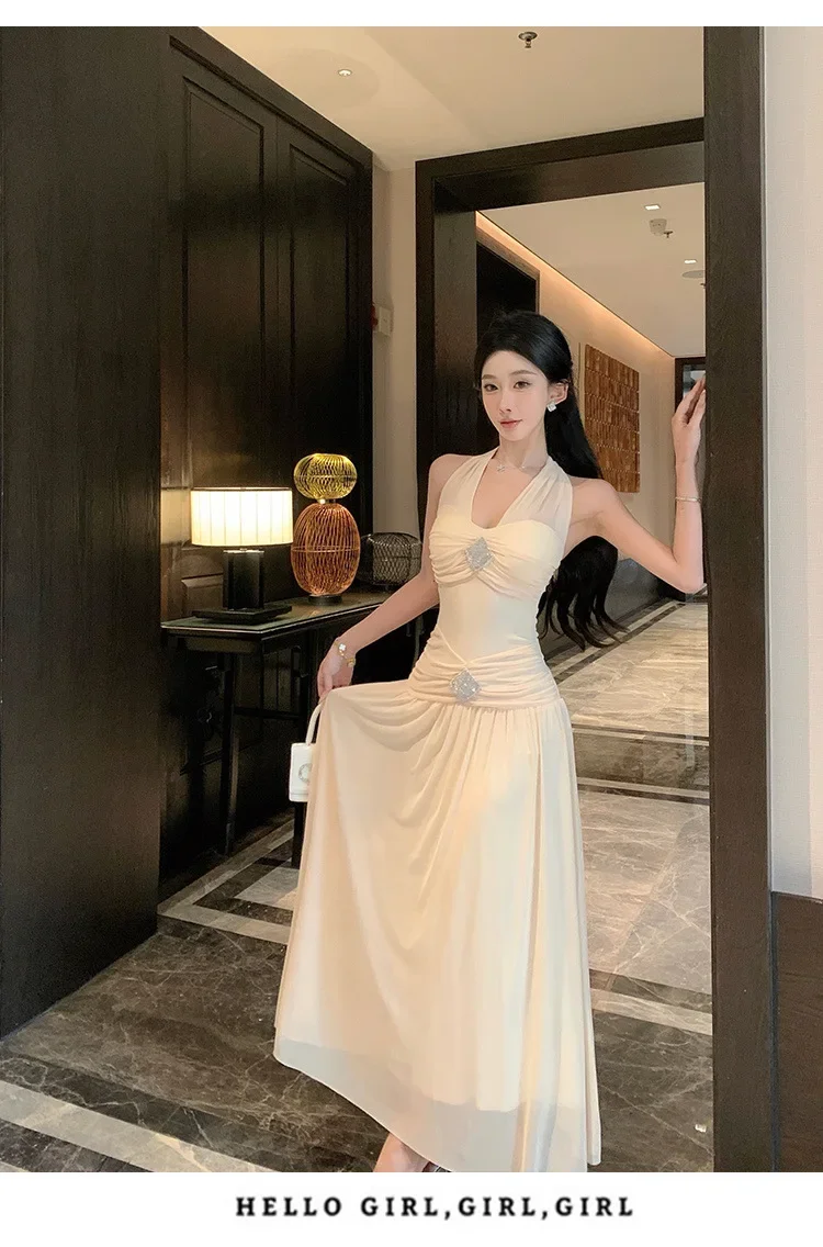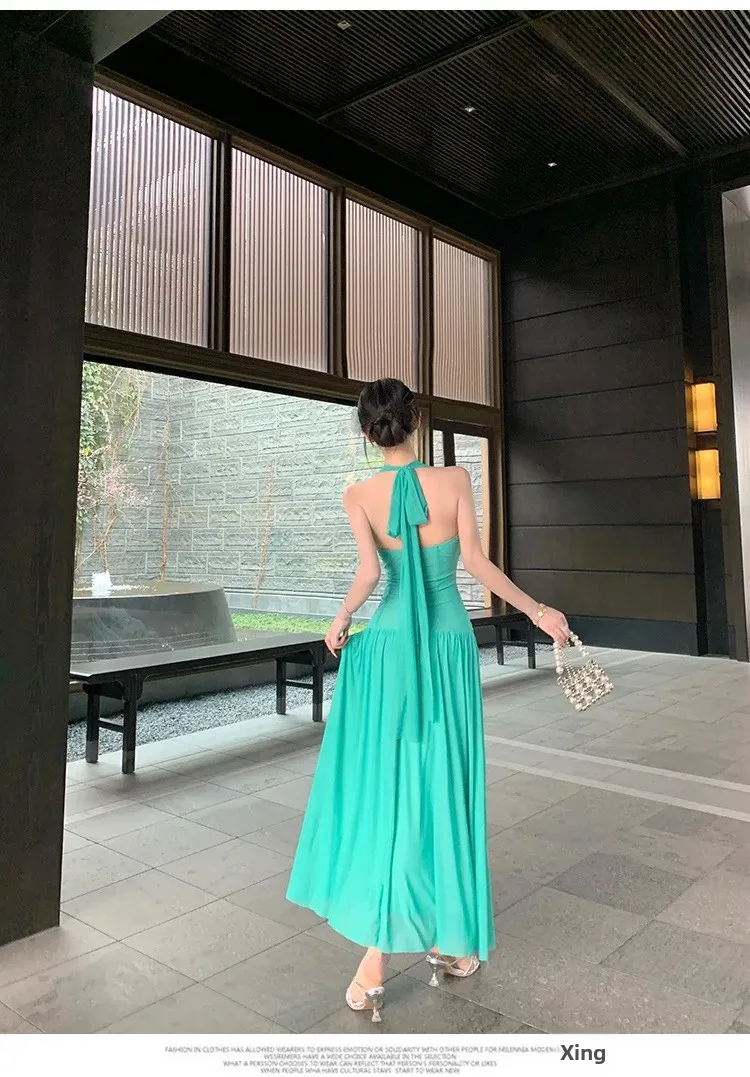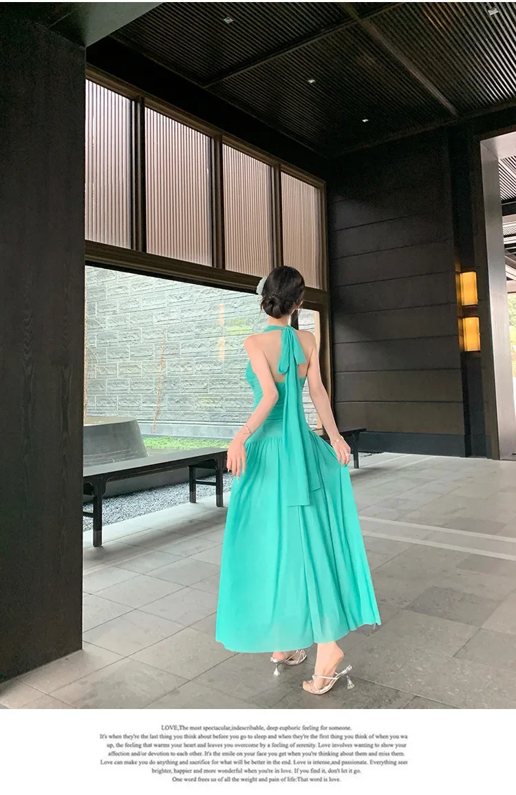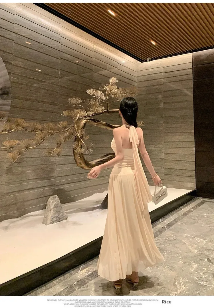 Cyflymder French Style V-Neck Hanging Neck Slimming Long Dress Sexy Pure Desire Beach Vacation Dress Elegant Waist-Cut Gown