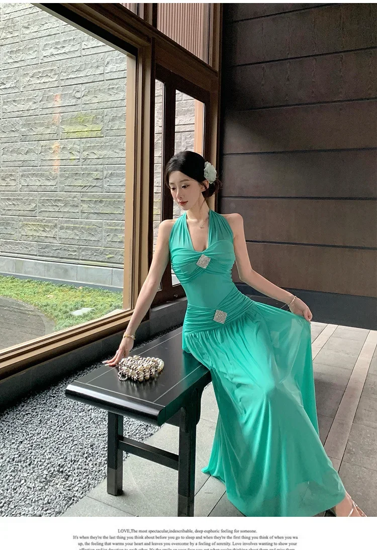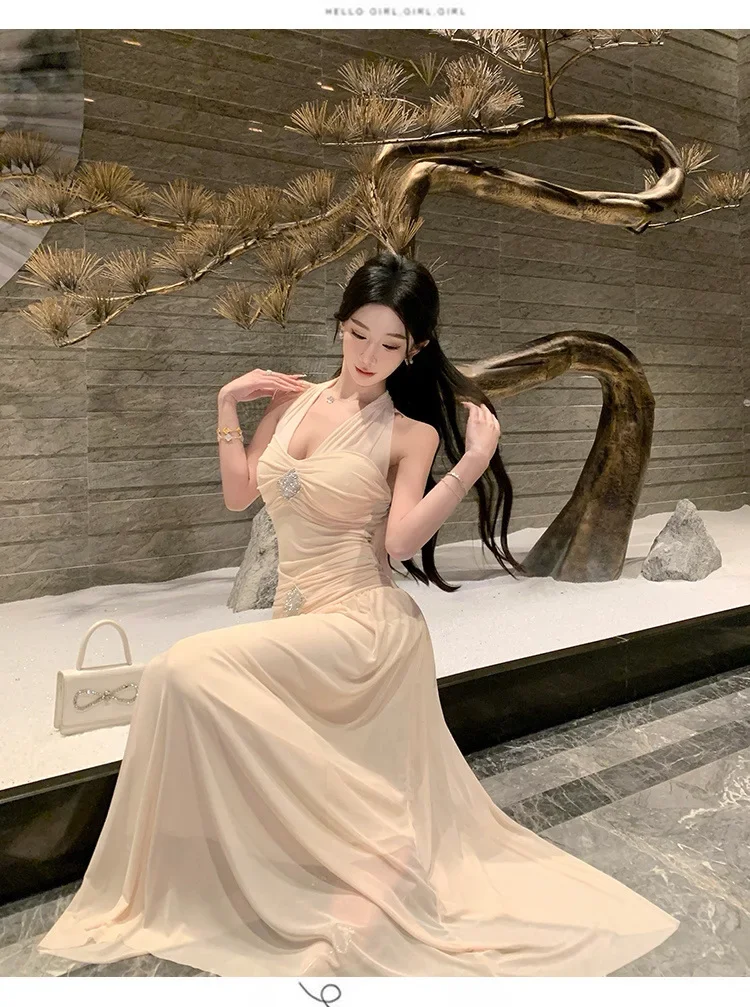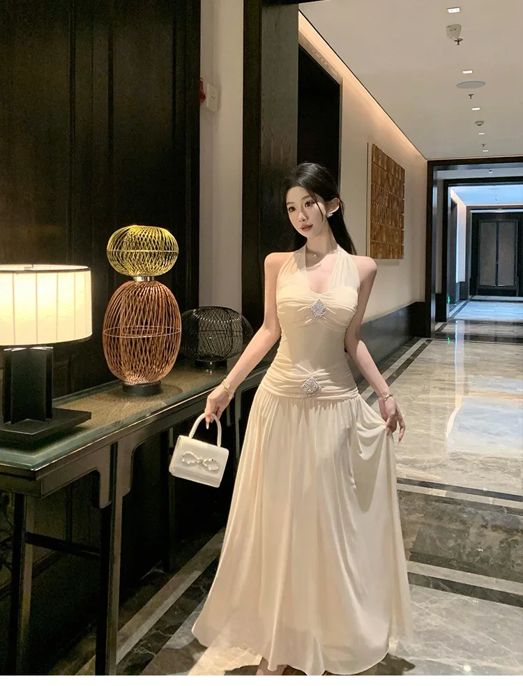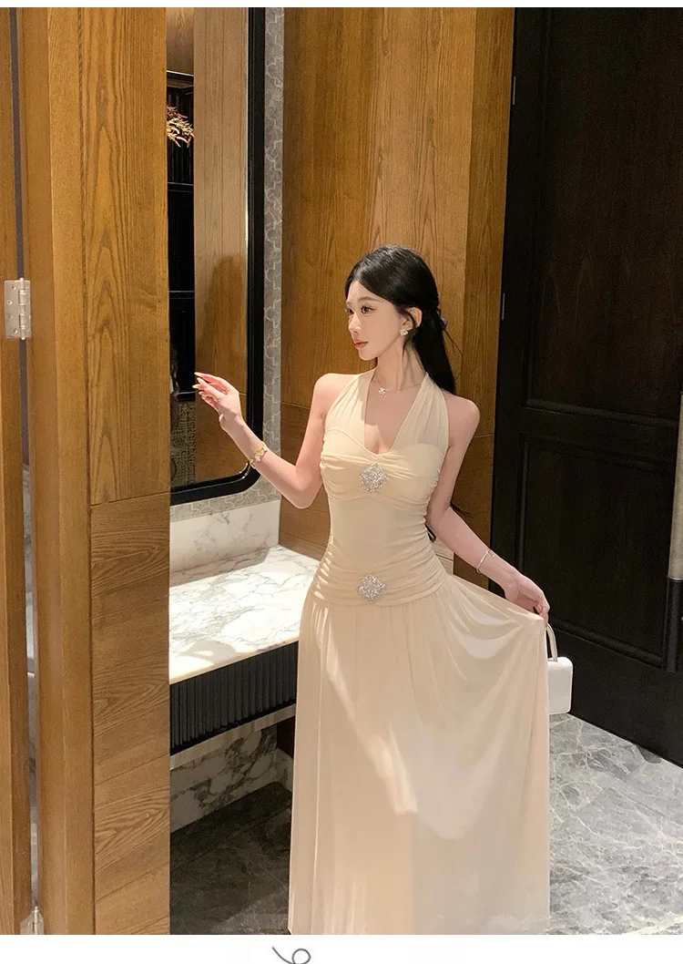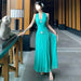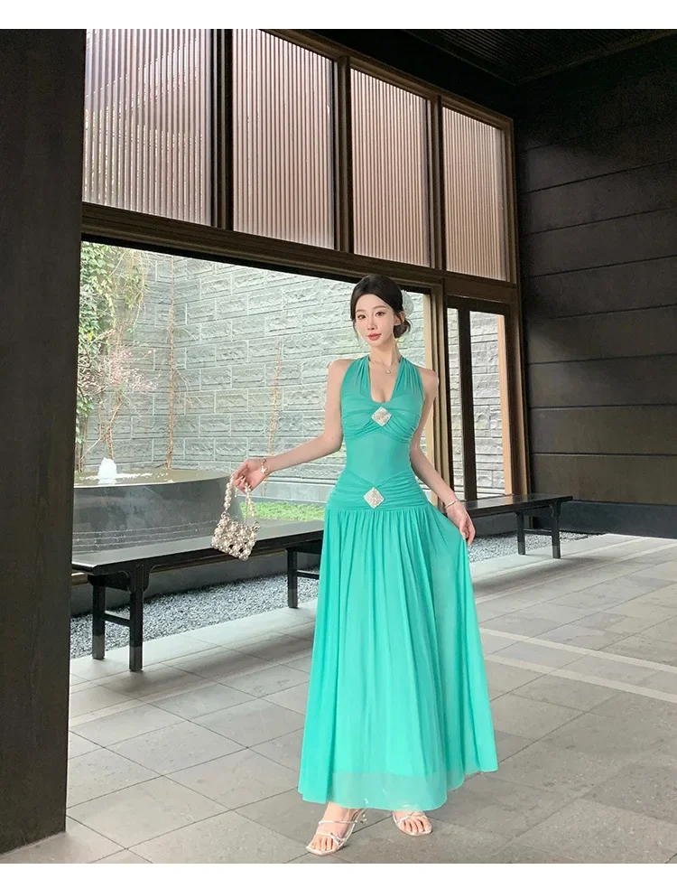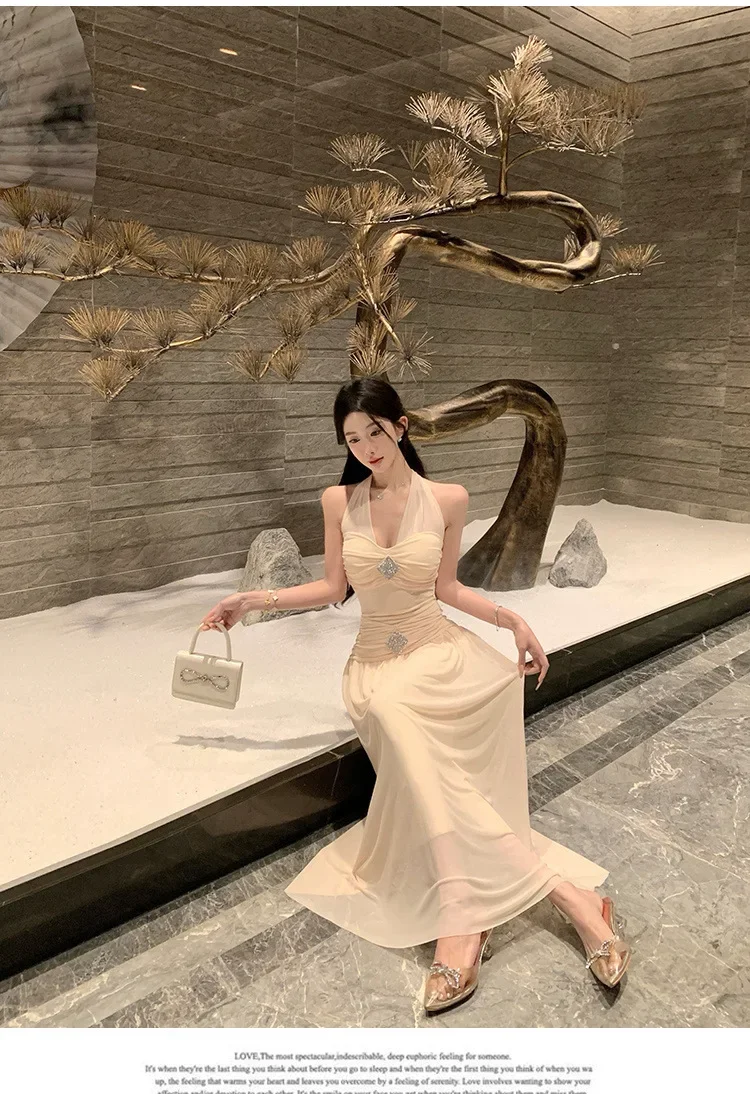 Cyflymder French Style V-Neck Hanging Neck Slimming Long Dress Sexy Pure Desire Beach Vacation Dress Elegant Waist-Cut Gown