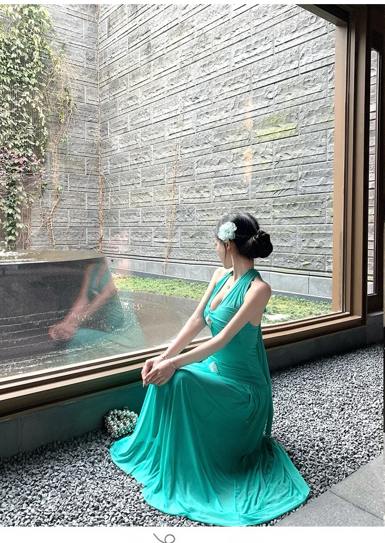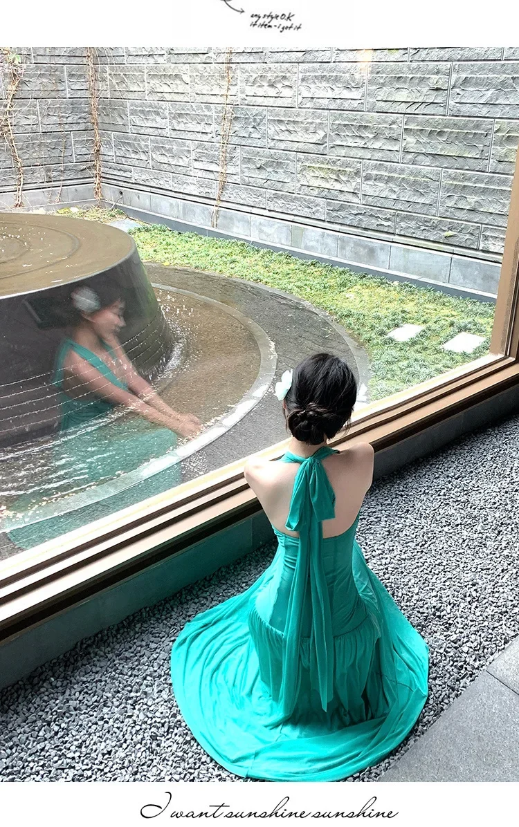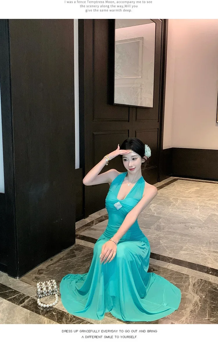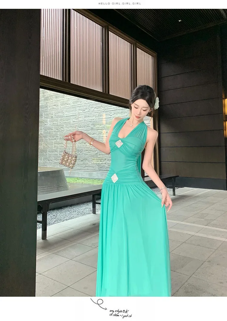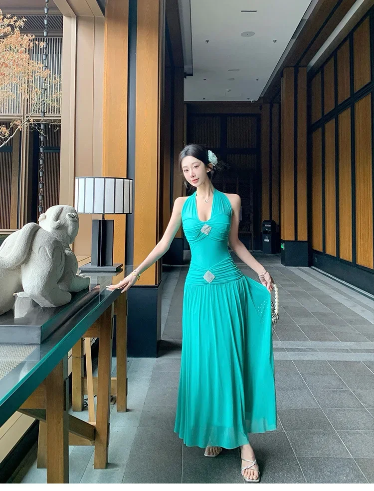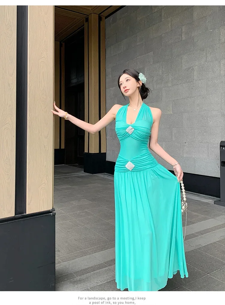 Cyflymder French Style V-Neck Hanging Neck Slimming Long Dress Sexy Pure Desire Beach Vacation Dress Elegant Waist-Cut Gown