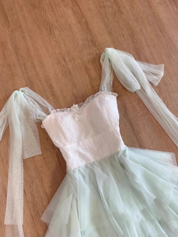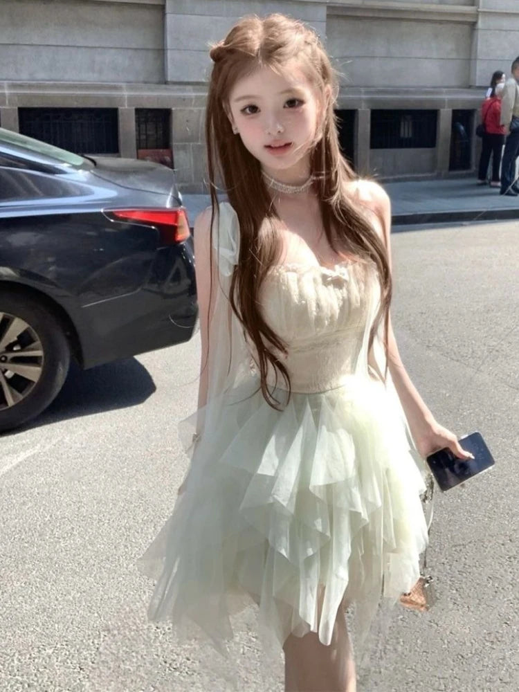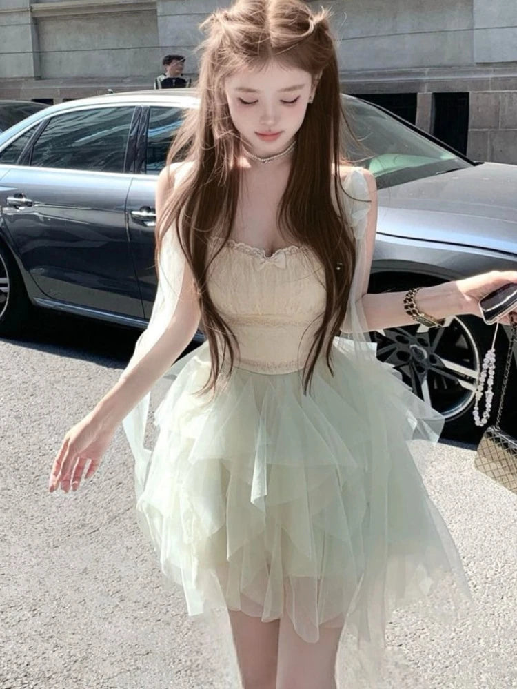 Cyflymder French Sweet Mesh Patchwork Elegant Women Dress Y2k Design Irregular Strap Princess Party Dress Female Gentle Fairy Chic Outfits