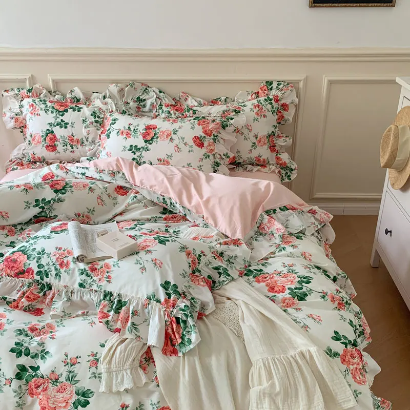 Cyflymder French Vintage Bed Skirt Bedding Set 100% Cotton Rose Print Linen Set Lace Ruffles Duvet Cover Bed Sheet Fitted Sheet Pillowcase