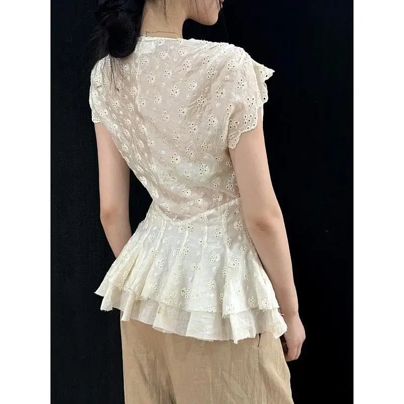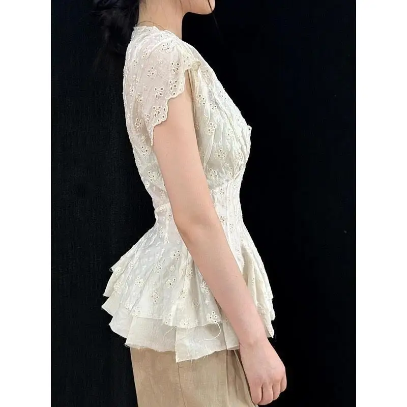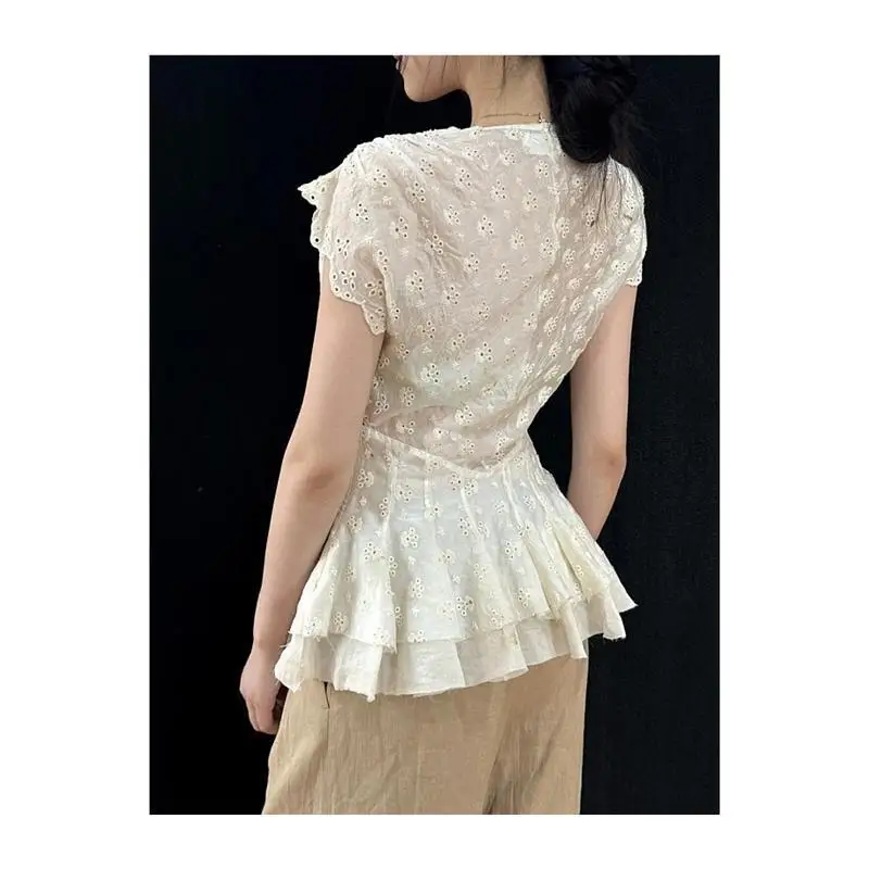 Cyflymder French White Lace Hollow Out Shirt for Women's Summer V-neck Short-sleeved Slim Fit Shirt Fashion Female Clothes
