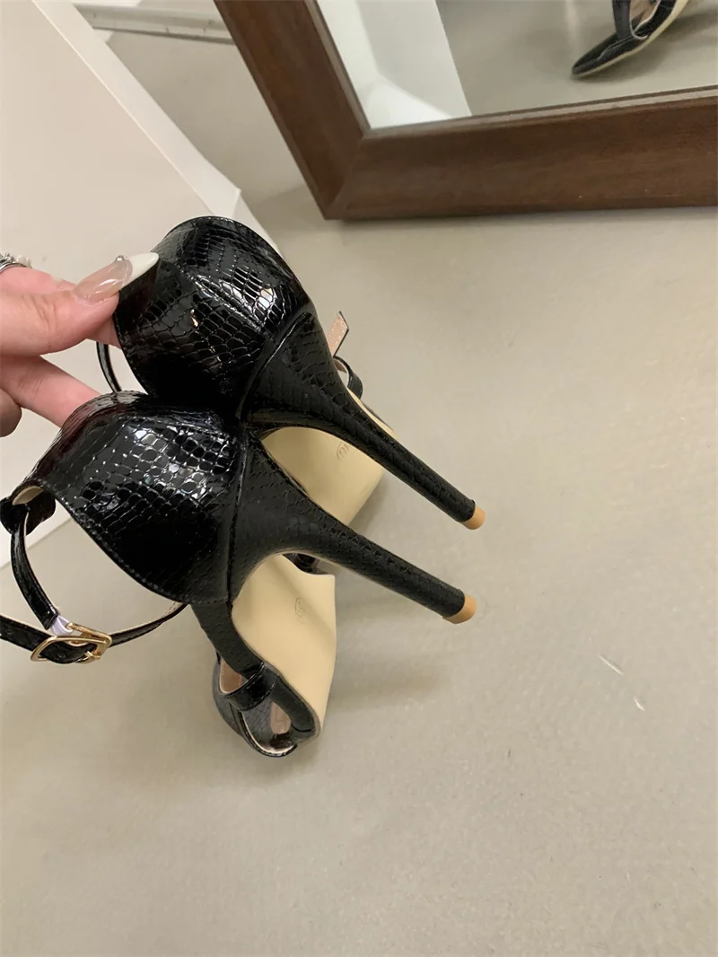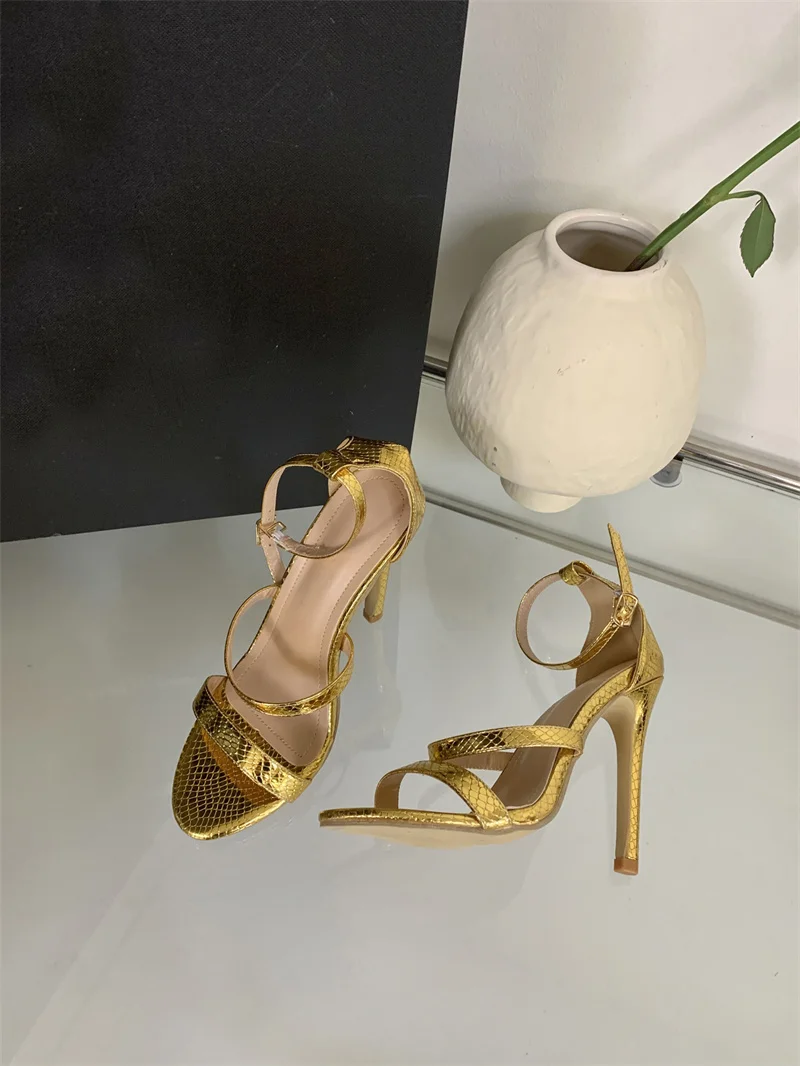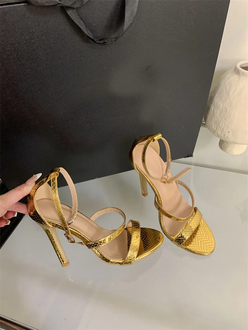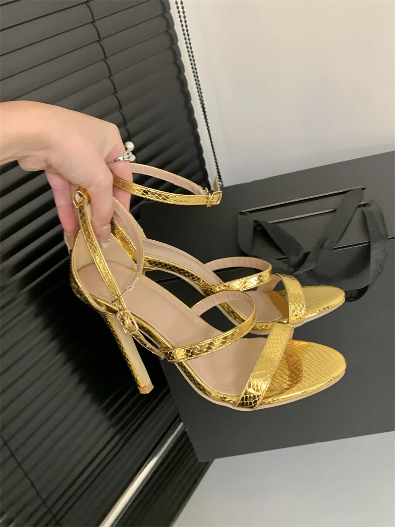 Cyflymder Gold Snake Print Leather Ankle Strap Sandals Women Summer Fashion Open Toe Gladiator High Heels Party Dress Shoes Size 42