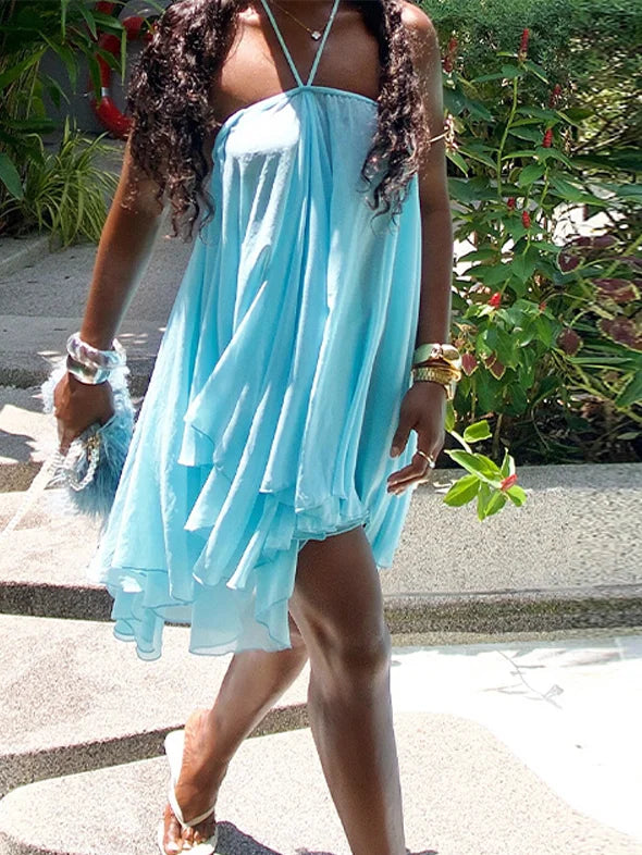 Cyflymder Halter Pleated Backless Irregular Mini Dress Women Off Shoulder Sexy Big Swing A-line Holiday Dresses 2025 Summer Party Robe