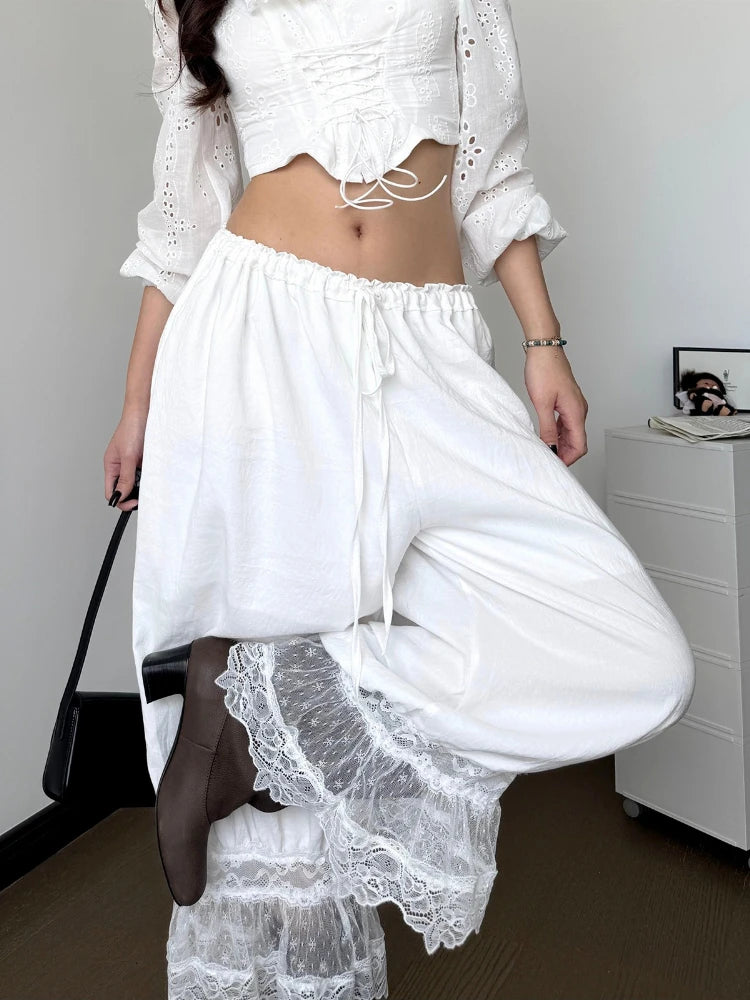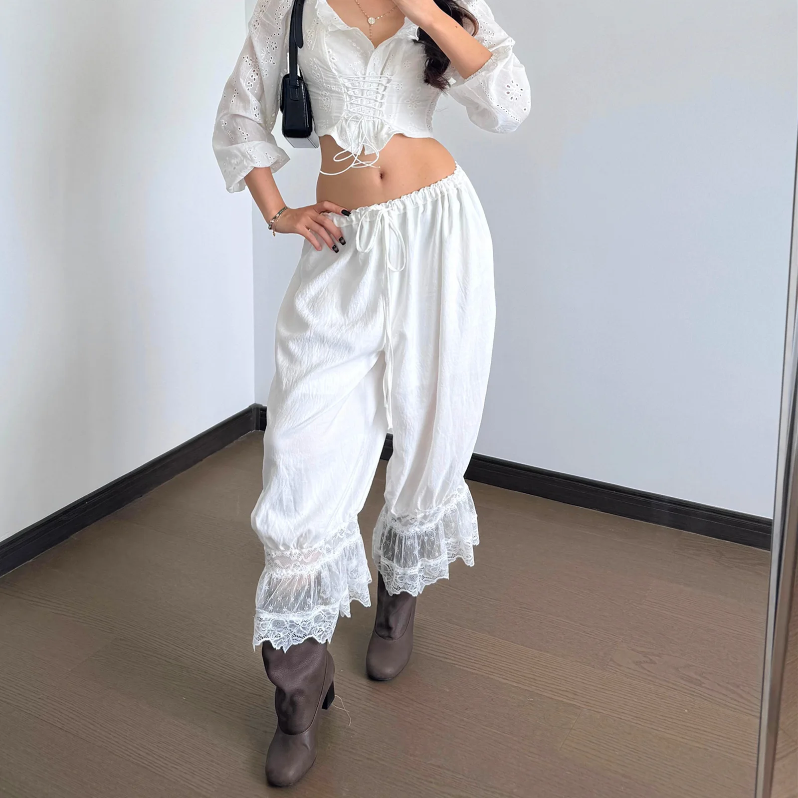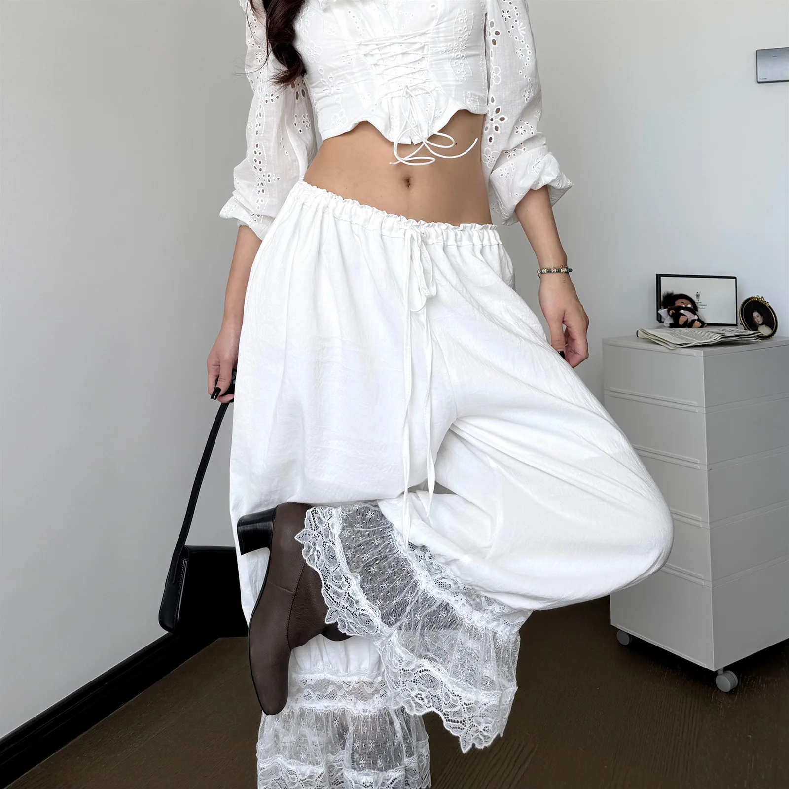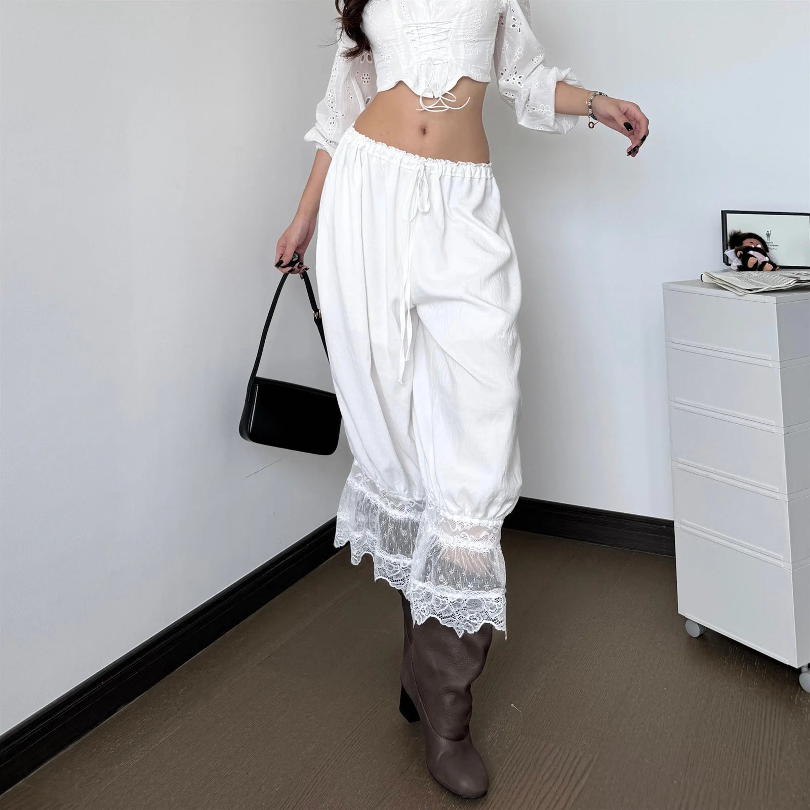 Cyflymder Harajuku Lace Patchwork Bell-bottoms Women Elastic Waist Drawstring Seven-inch Trousers Y2k Aesthetic Grunge See Through Pants