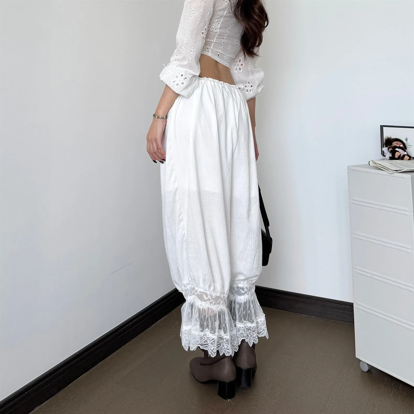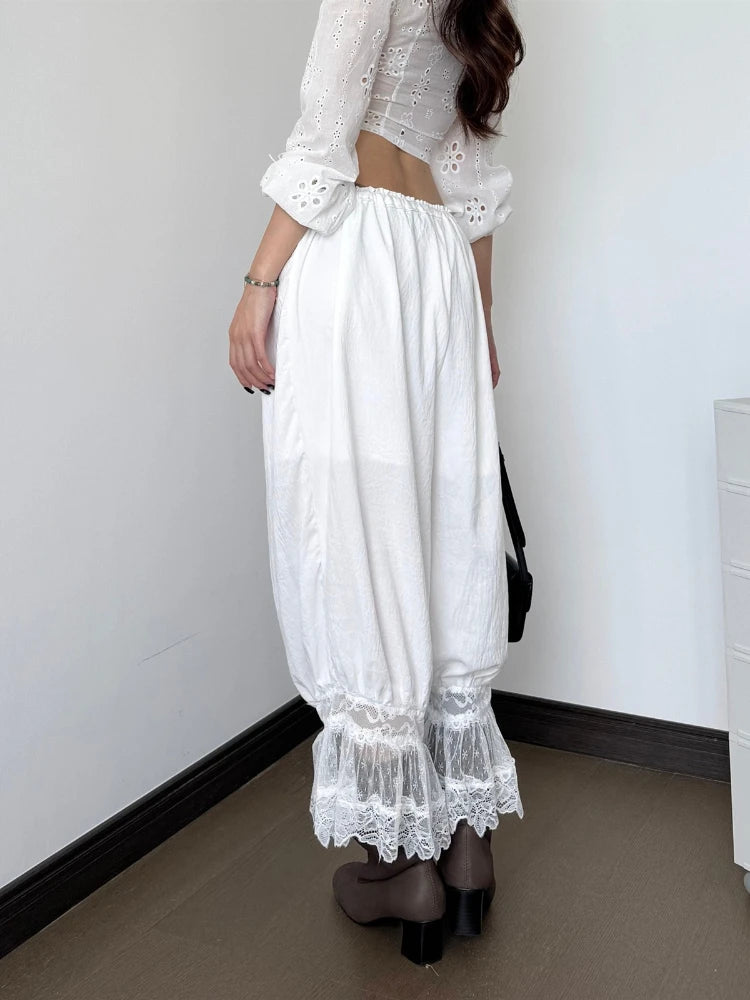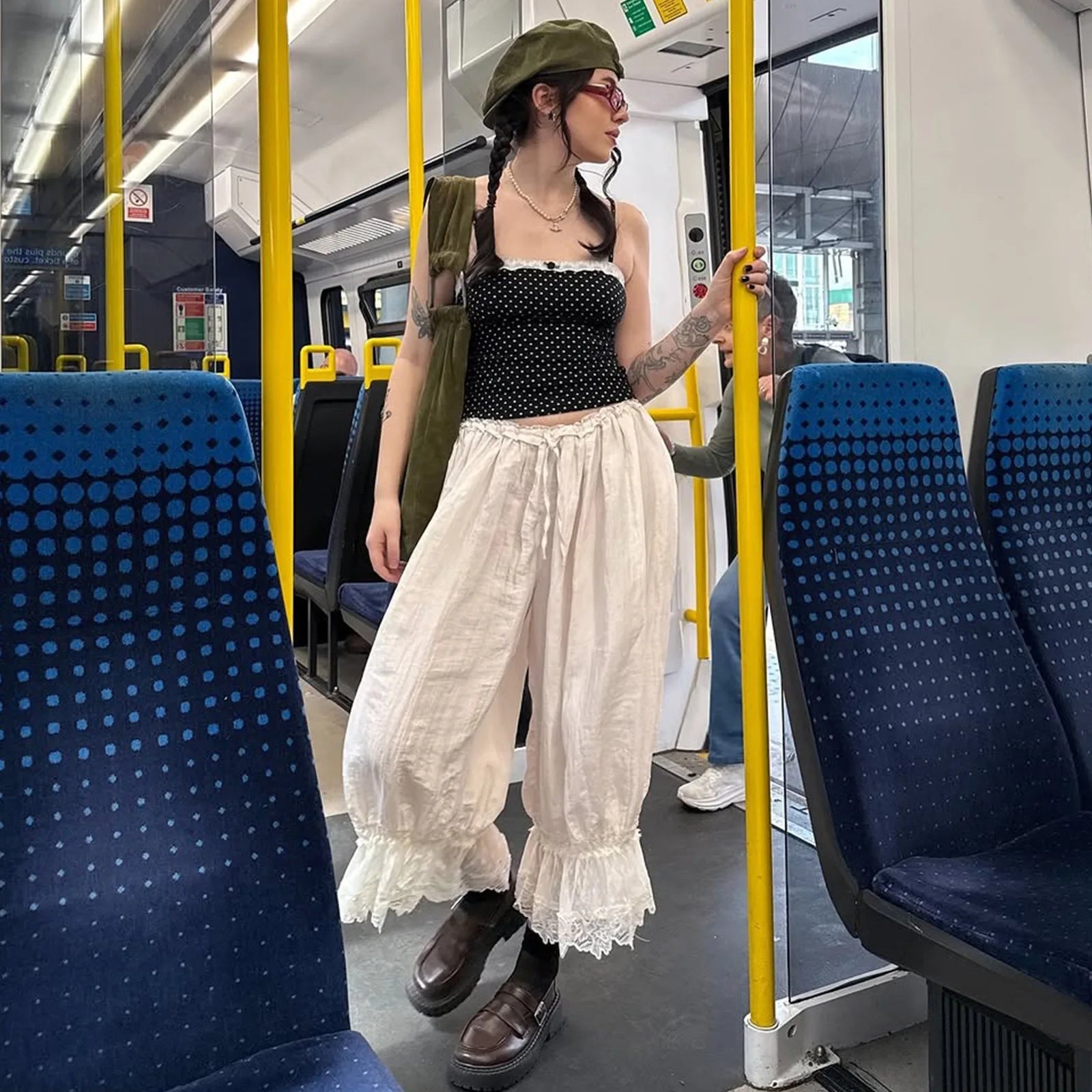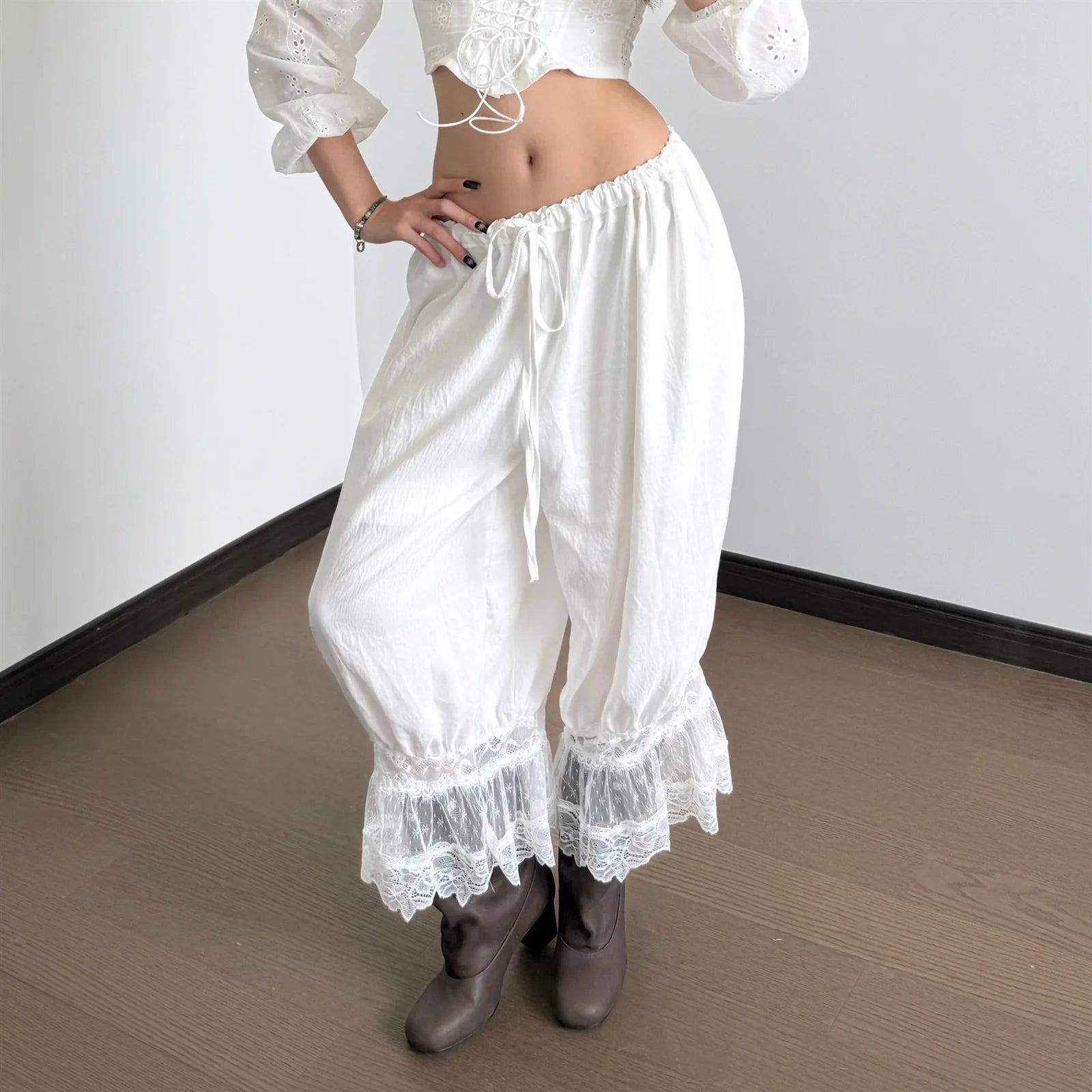 Cyflymder Harajuku Lace Patchwork Bell-bottoms Women Elastic Waist Drawstring Seven-inch Trousers Y2k Aesthetic Grunge See Through Pants