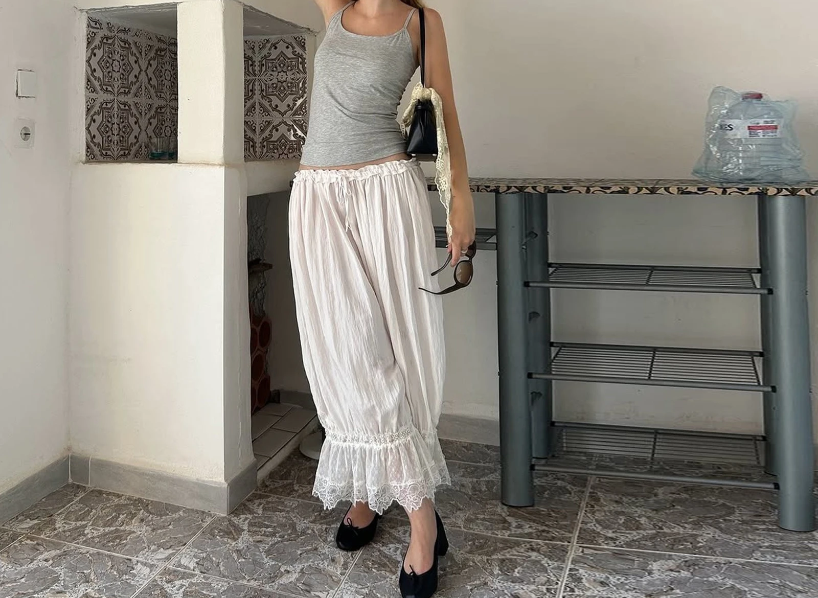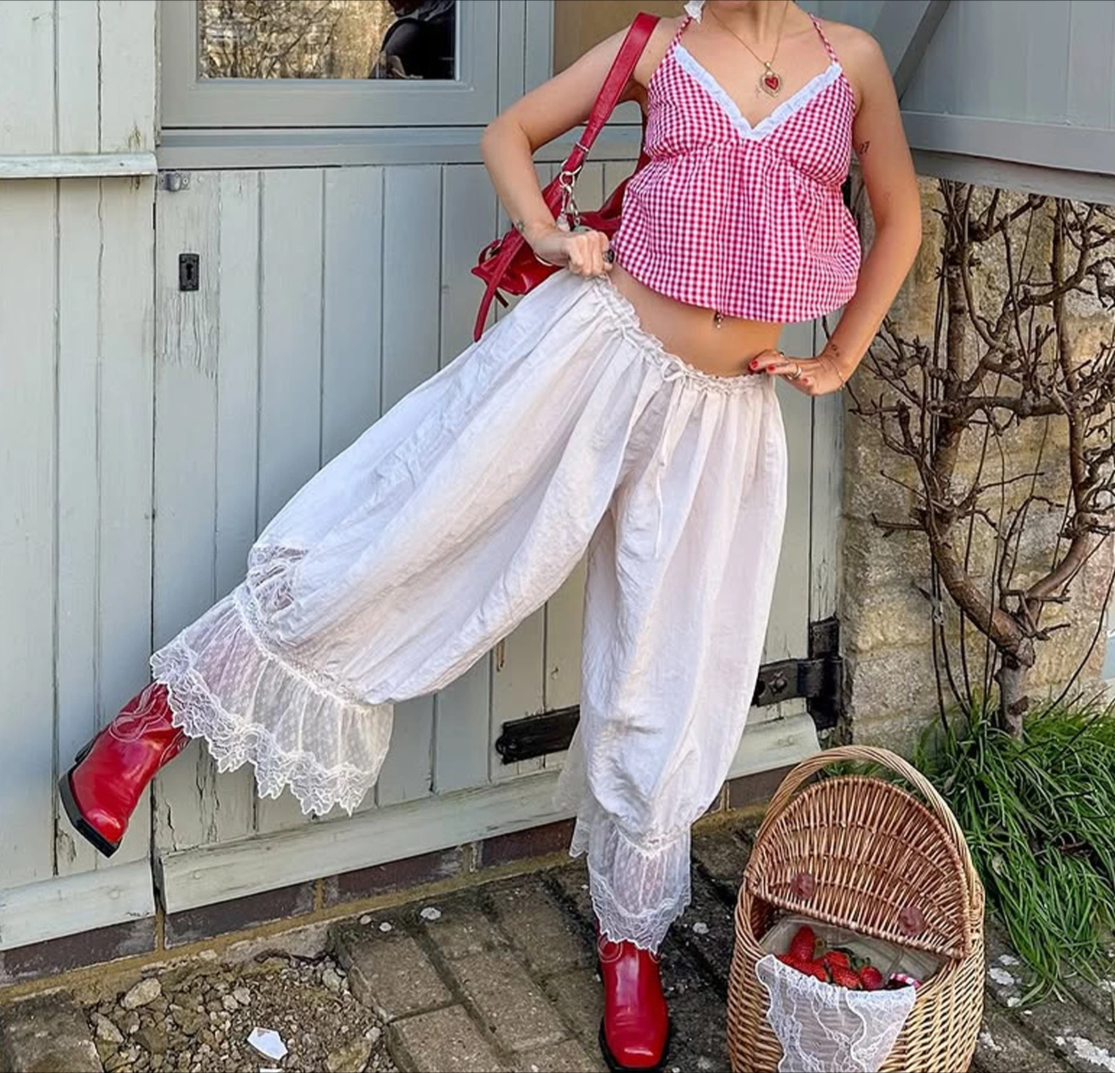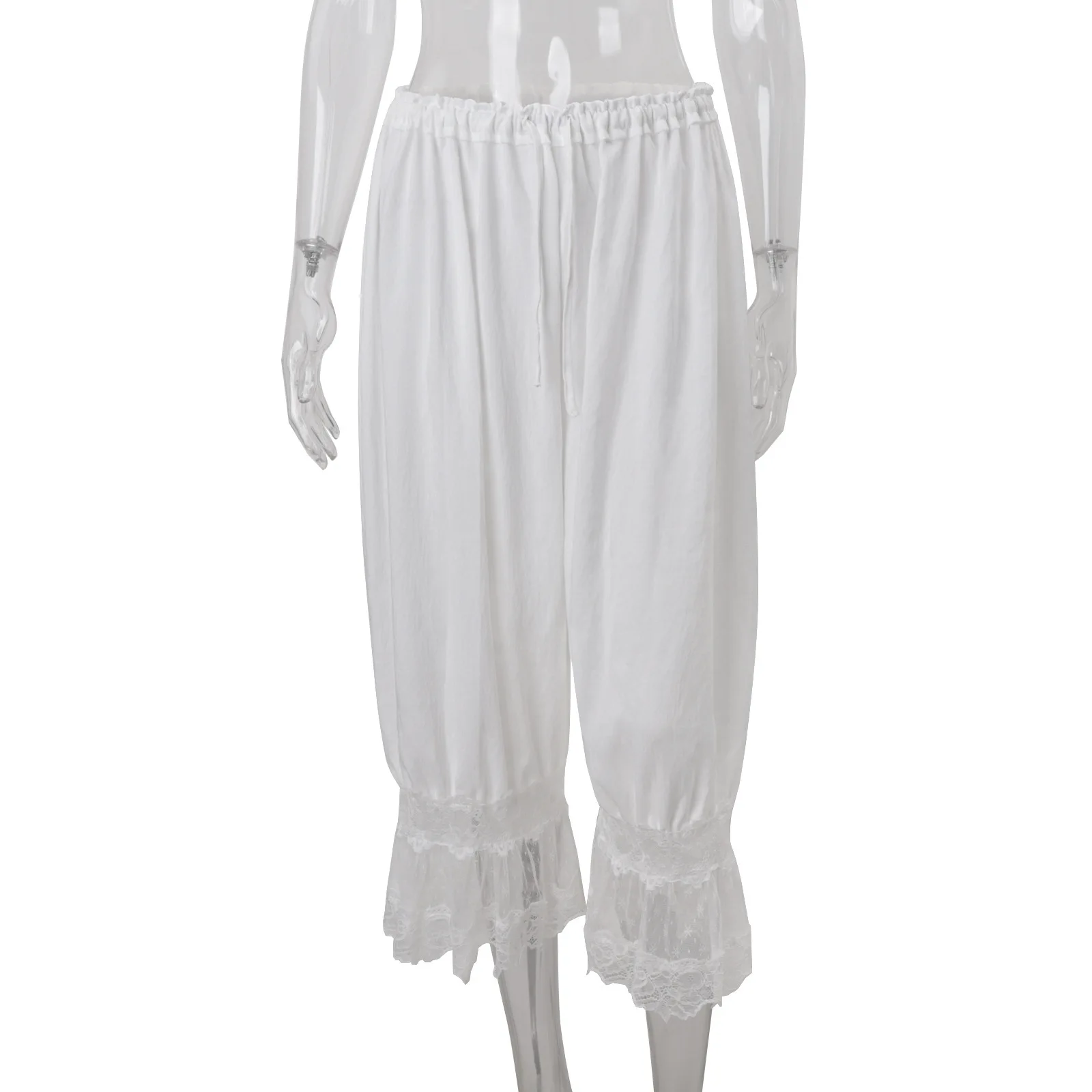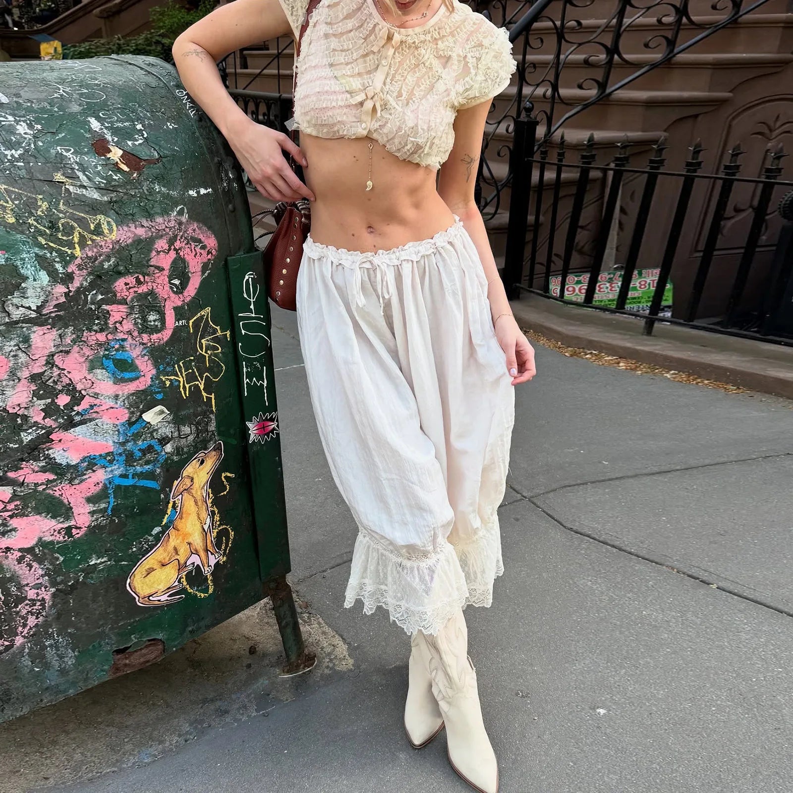 Cyflymder Harajuku Lace Patchwork Bell-bottoms Women Elastic Waist Drawstring Seven-inch Trousers Y2k Aesthetic Grunge See Through Pants