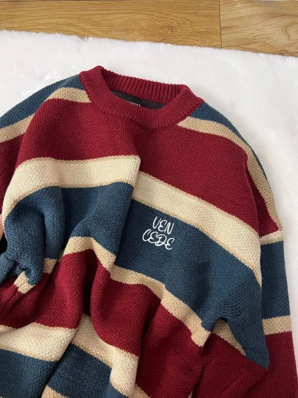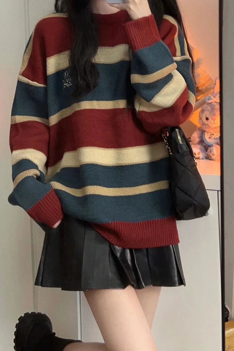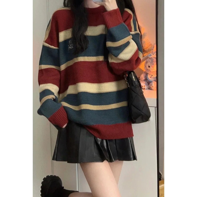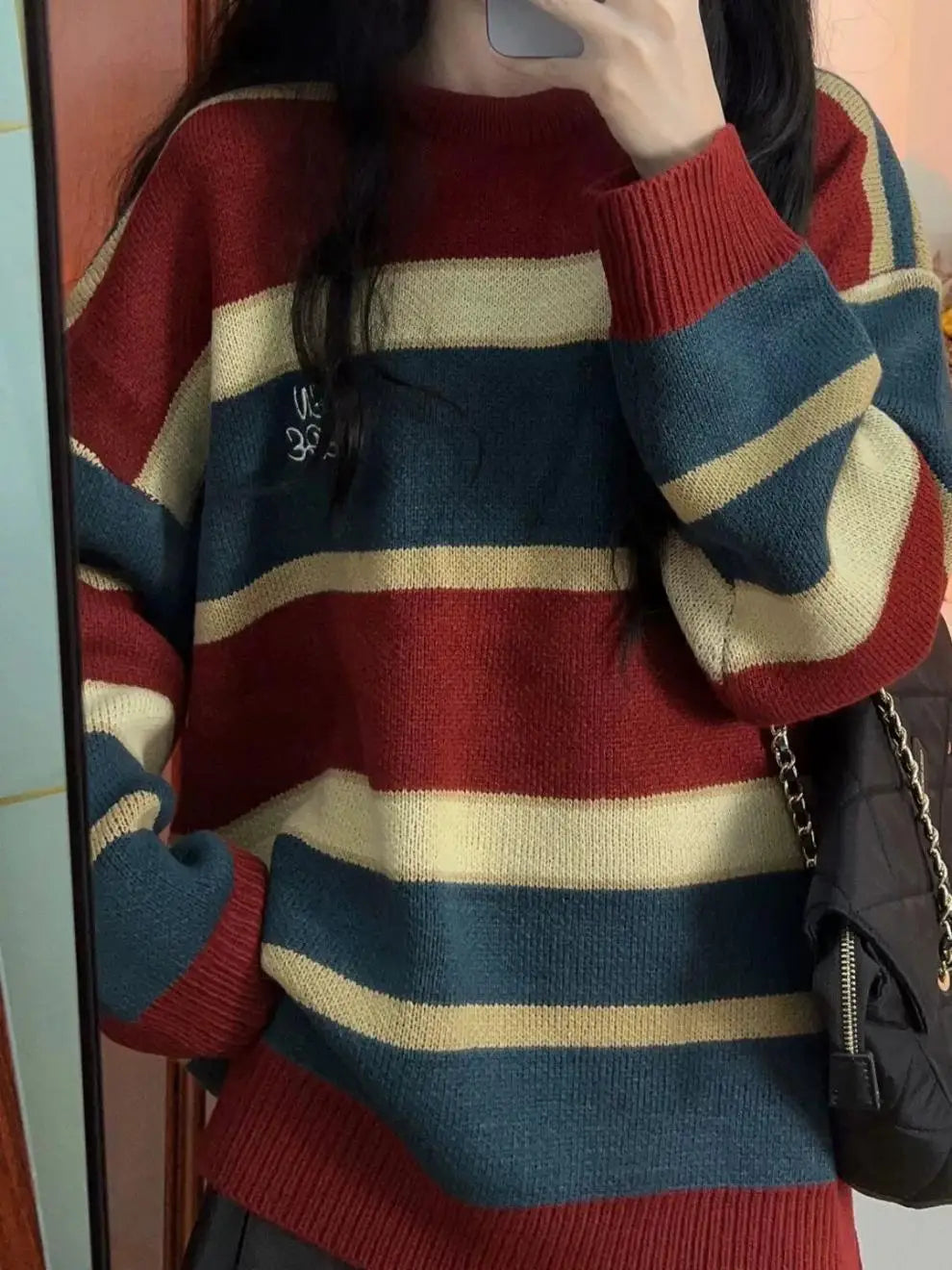 Cyflymder Harajuku Lazy Wind Striped Sweater Women Vintage Oversize Letter Knitted Tops Retro Loose Long Sleeve Pullovers