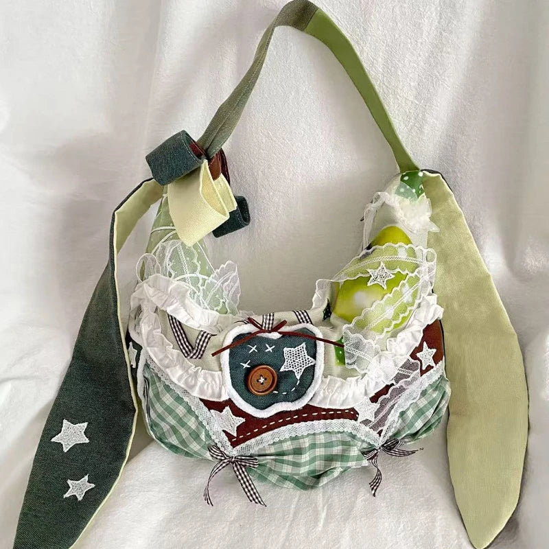 Cyflymder Harajuku Y2k Aesthetic Ins Underarm Bag Women Contrast Color Plaid Rabbit Ear Canvas Bag Grunge Patchwork Lace Shoulder Handbags