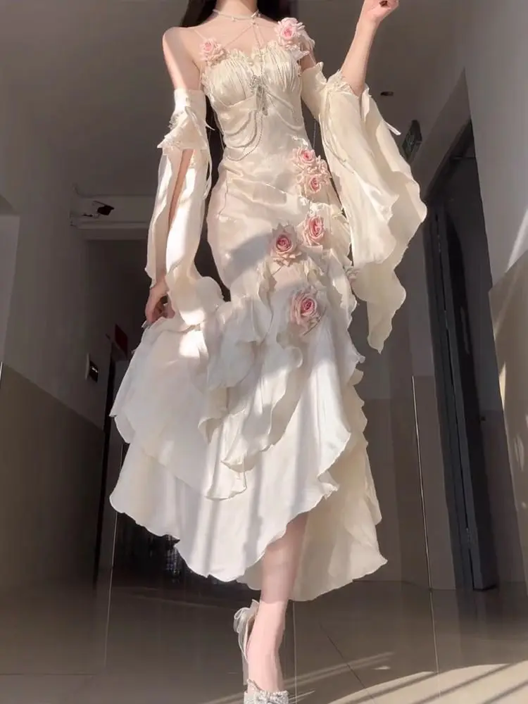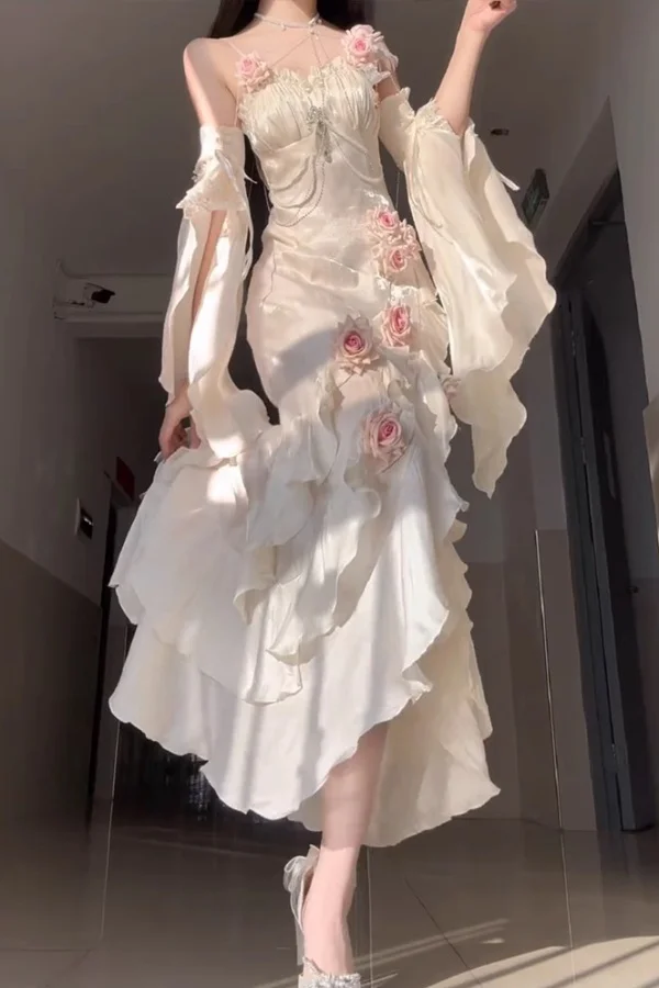 Cyflymder High end 3D Rose Strap Camisole Dress Lolita Dress Elegant Goddess Style Sweet Slimming Fishtail Long Dresses for Women