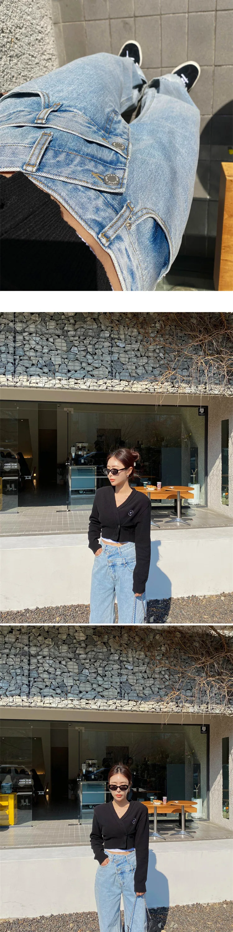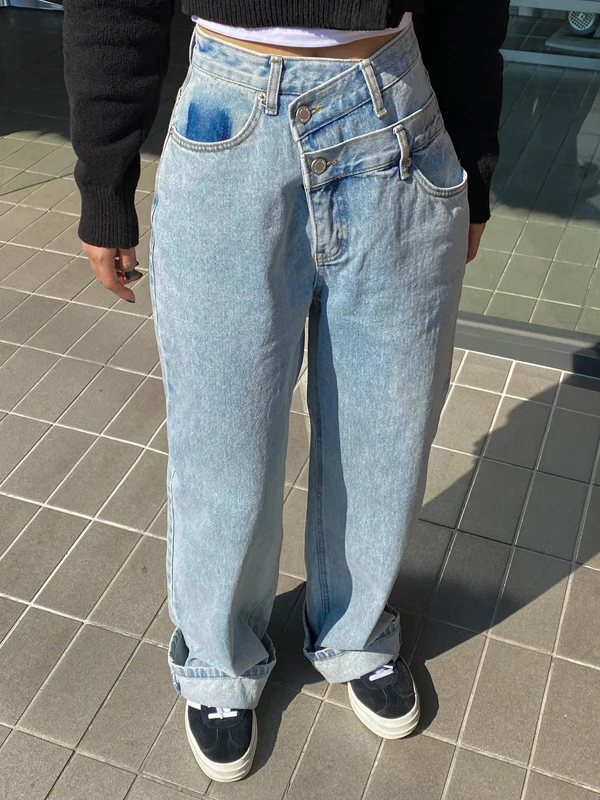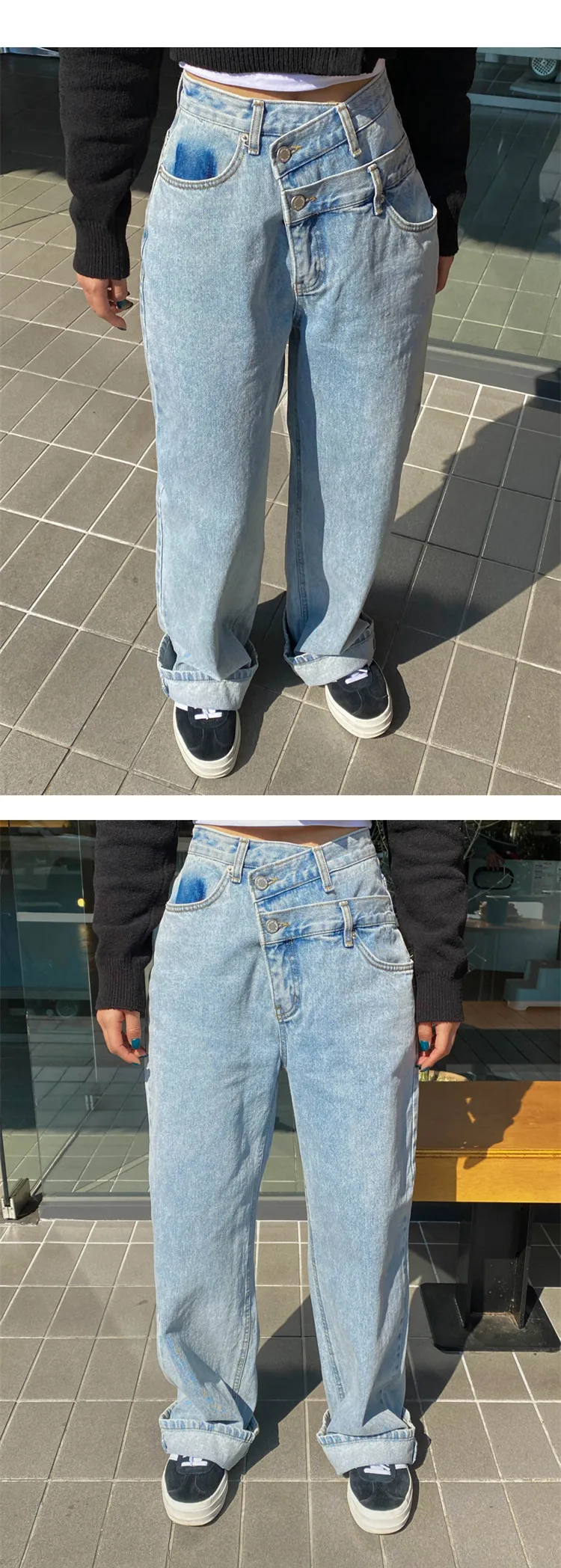 Cyflymder High Waist Asymmetric Two Button Vintage Straight Leg Wide Leg Casual Jeans Women's Chic Spring New Sle Casual Loose Fit