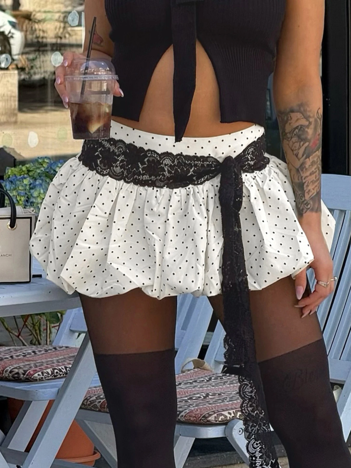 Cyflymder Holiday Dot Printed A-Line Skirts Sweet Slim Lace Bandage Mid-Waisted Mini Skirts Women Summer Fashion Streetwear