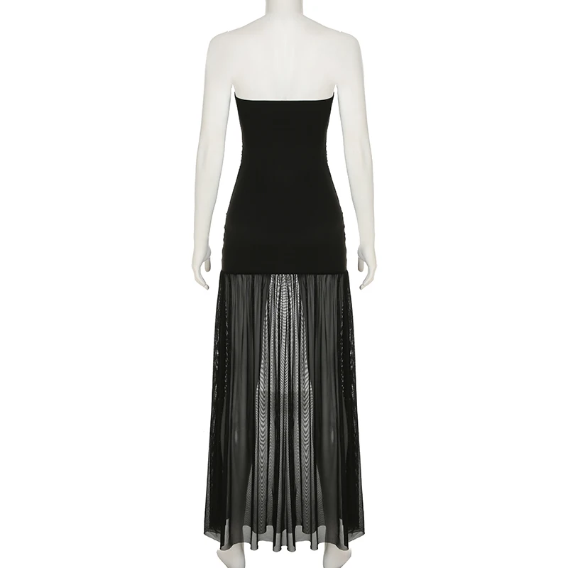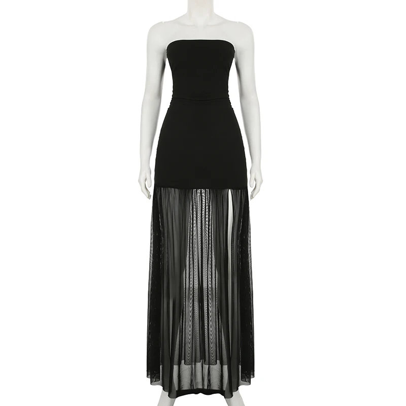 Cyflymder Holiday Slim Patchwork Mesh Tube Dress Party Sexy Solid Slash Neck Sleeveless Split Maxi Dresses For Women Summer