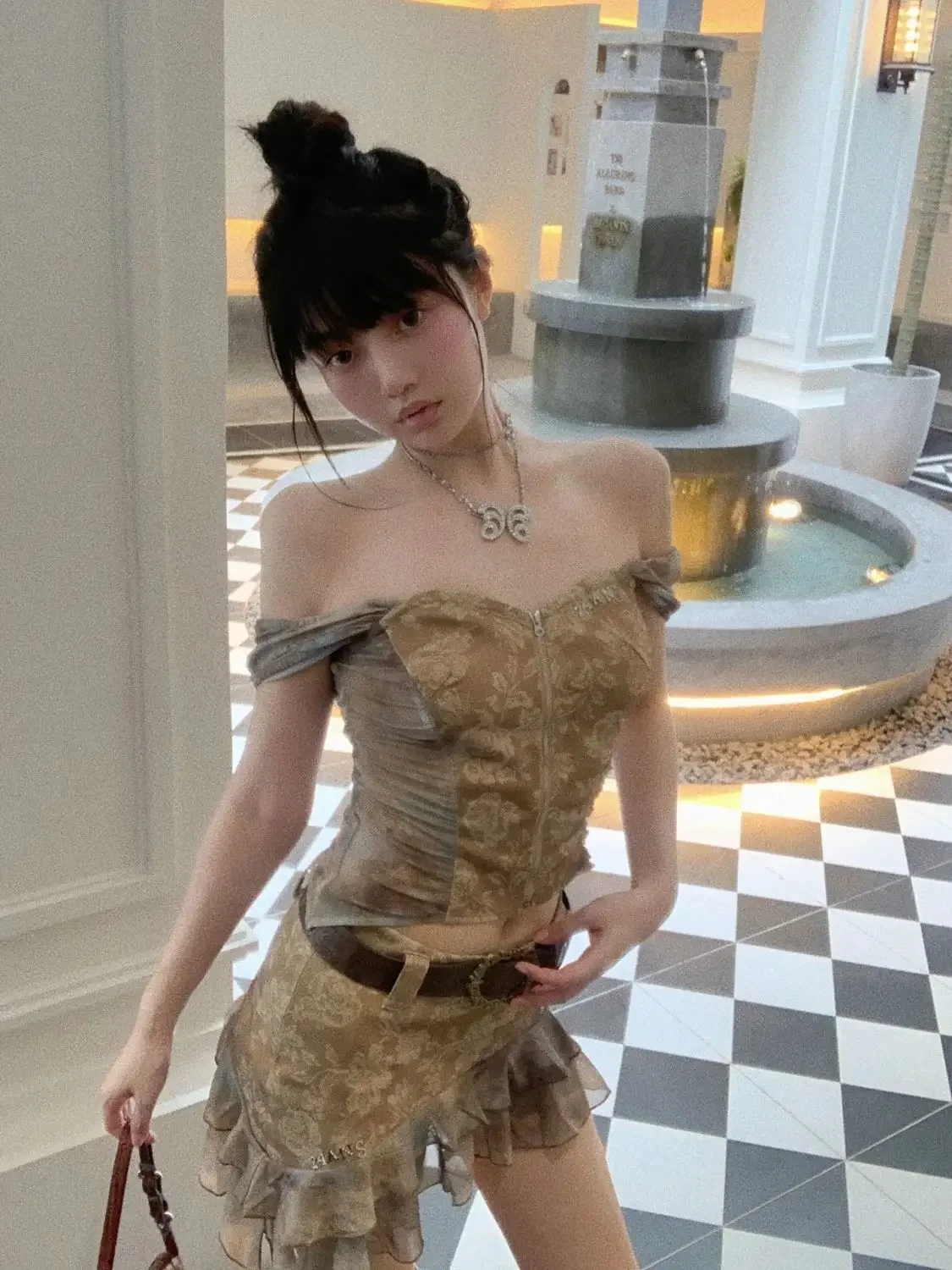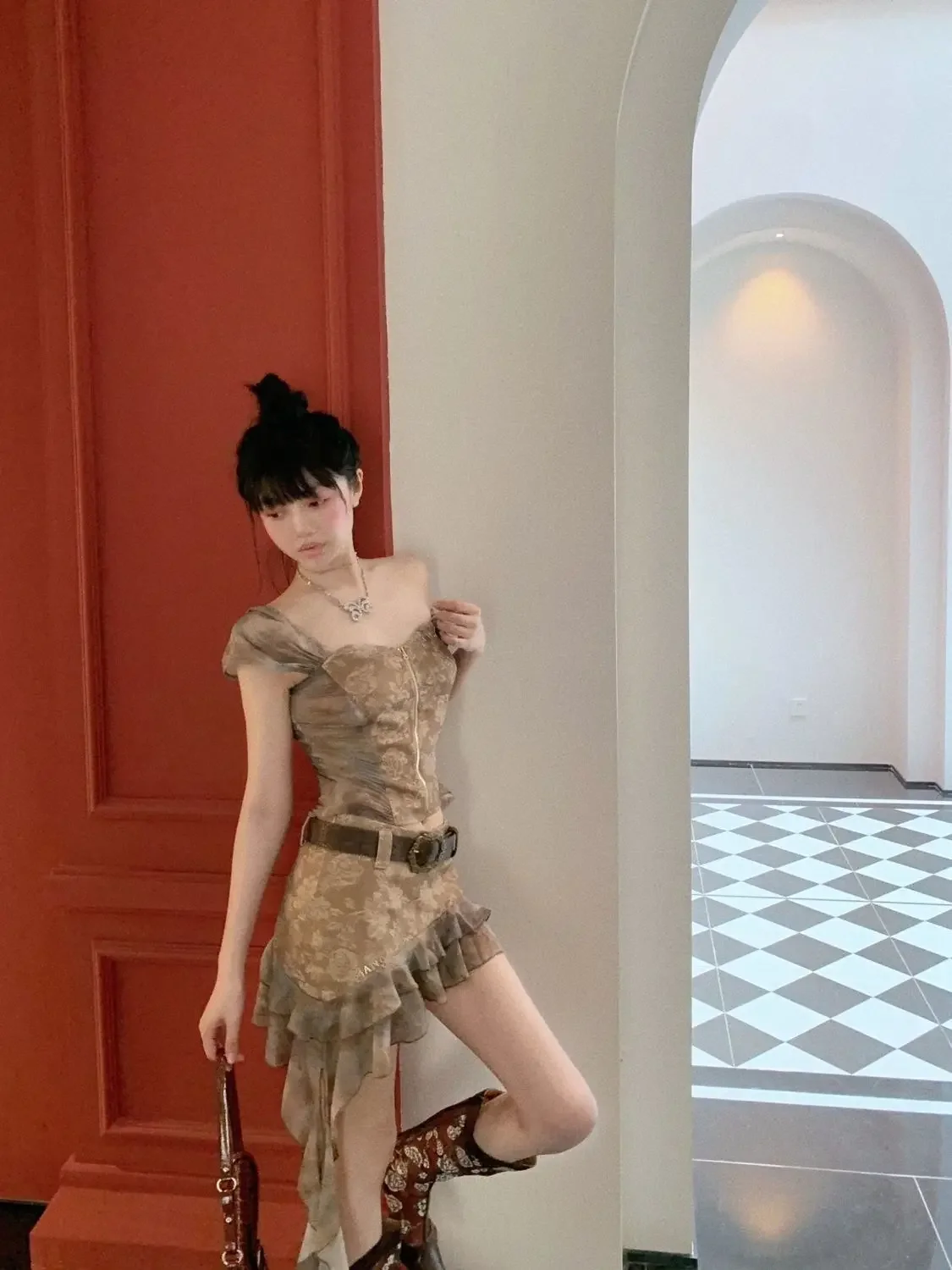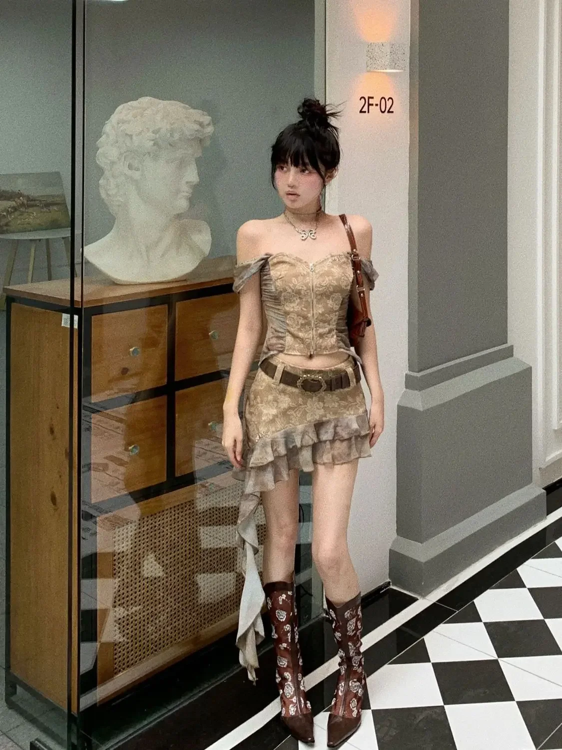 Cyflymder Hot Girl Retro Suit Women's Summer Camisole Vest Top Irregular Hip Wrap Skirt Two Piece Set Fashion Female Clothes Chic