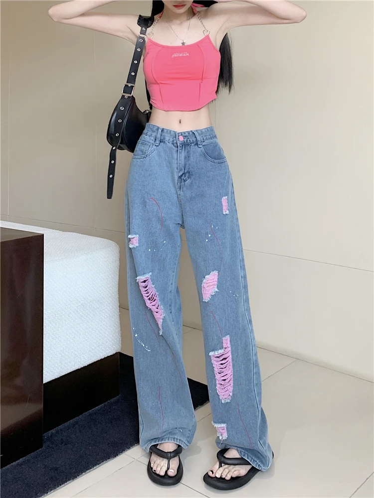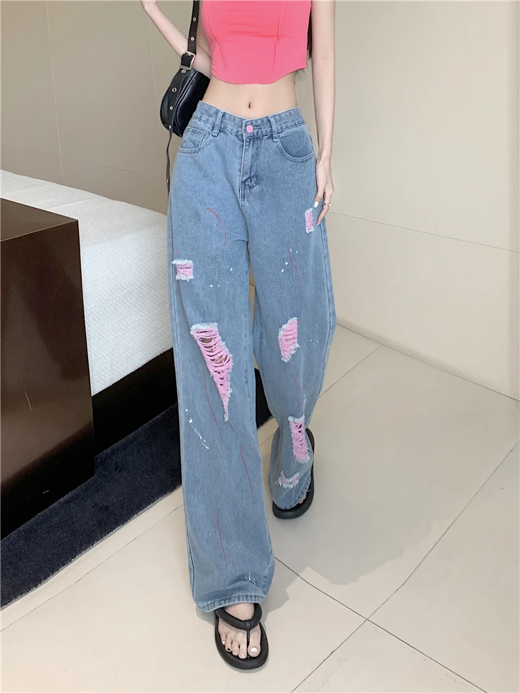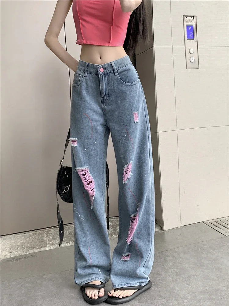 Cyflymder Hot Girl Torn Jeans Women's Summer High Waisted Pink Ripped Loose Draped Demin Wide Leg Pants Fashion Casual Female Clothes