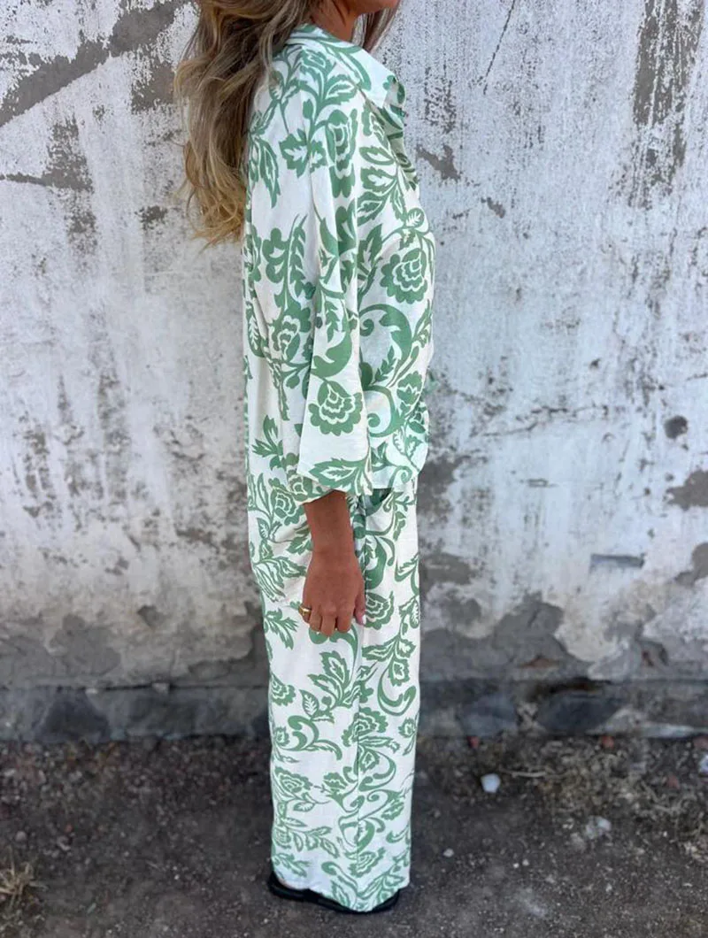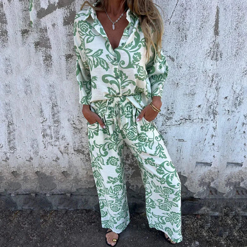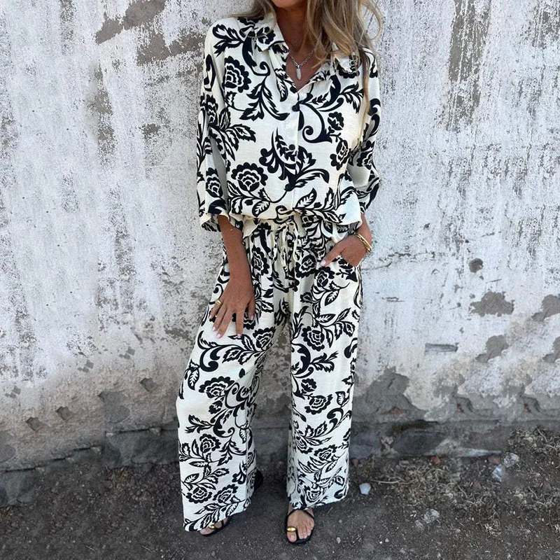 Cyflymder Hot Sale Printed Women's Two Piece Sets Vintage Turndown Collar Long Sleeve Shirt Elastic High Waist Baggy Casual Pants