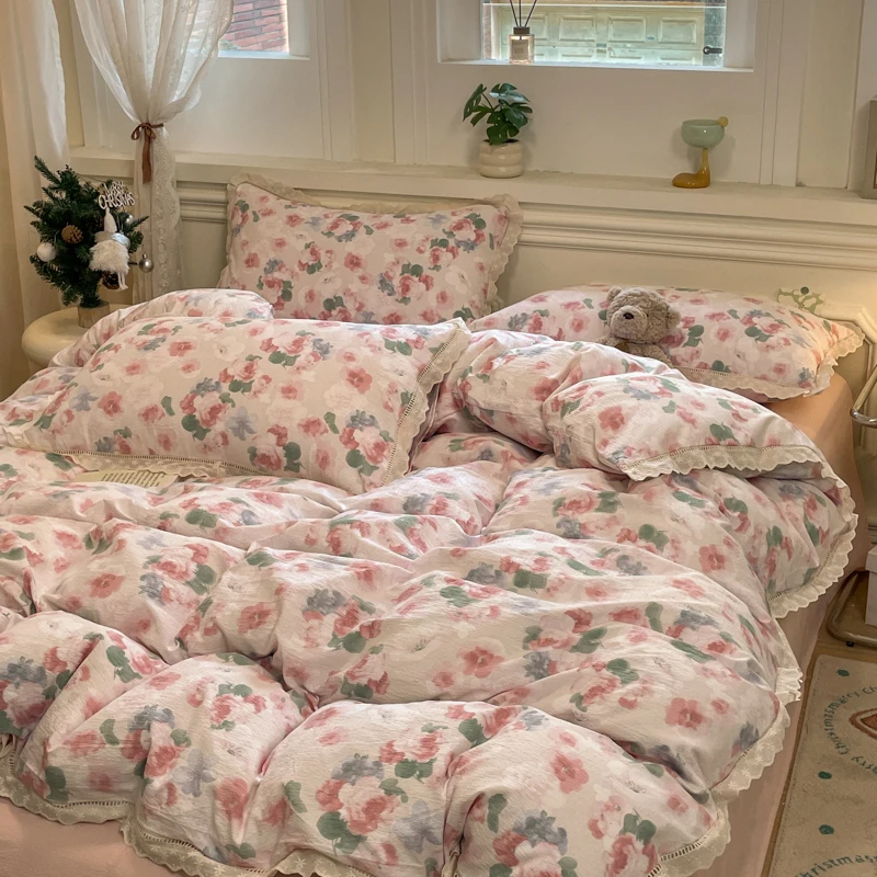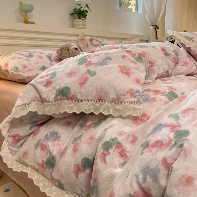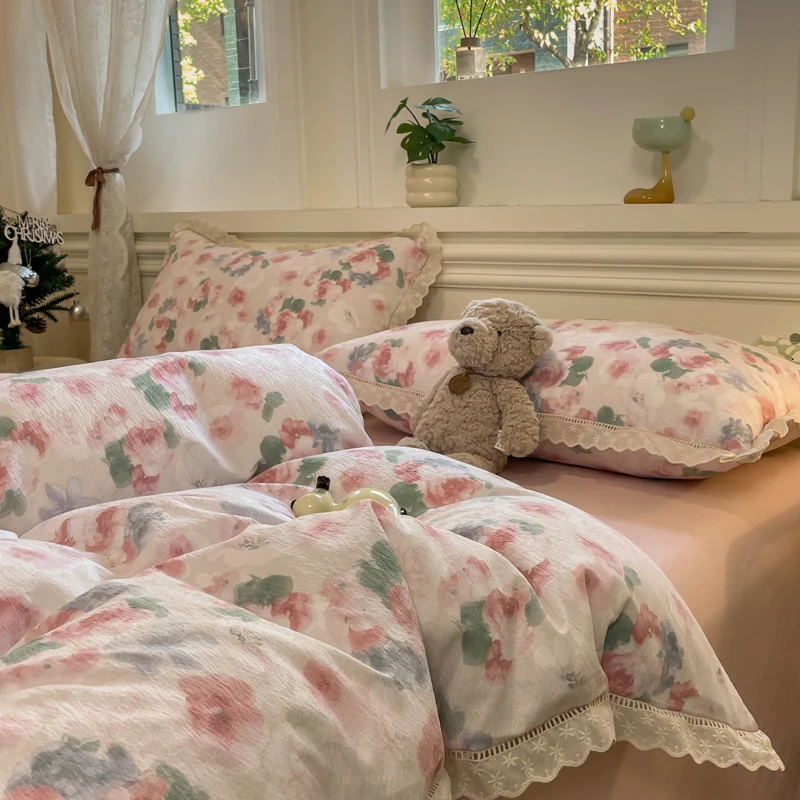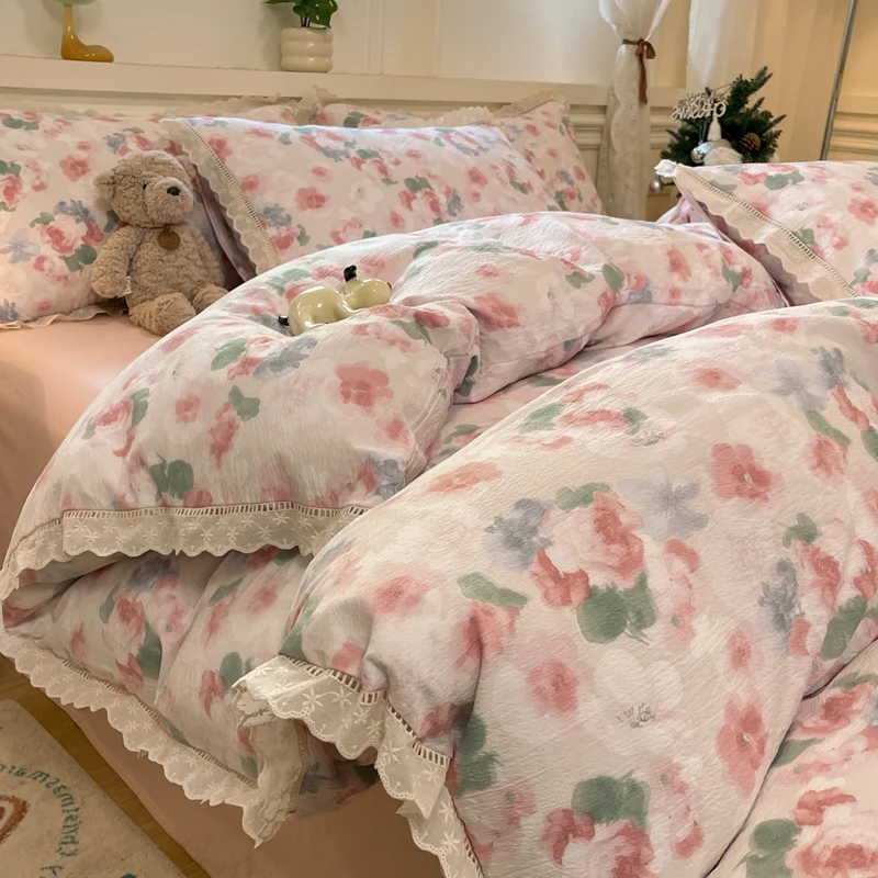 Cyflymder INS Korean Style 2025 New Yungan Cotton Wrinkled Double-layer Yarn Lace Bedding Sets