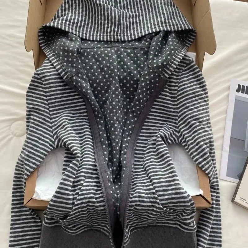 Cyflymder Japnese Harajuku Vintage Polka Dot Sriped Print Women Clothes Y2k Autumn Comfortable Casual High Street Hoodies Zipper Cardigan