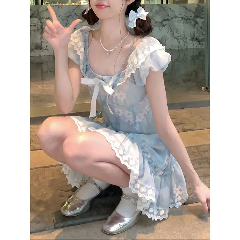 Cyflymder Kawaii Bow Mini Dress Women Japanese Lolita Lace Slash Neck Dresses Summer Korean Party Cute Puff Short Sleeve Bodycon Vestidos