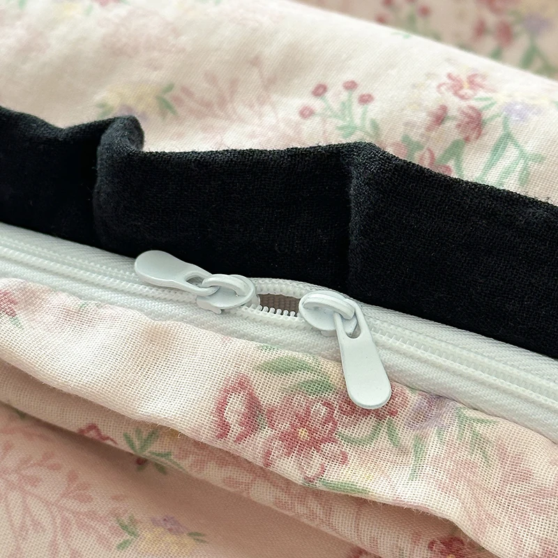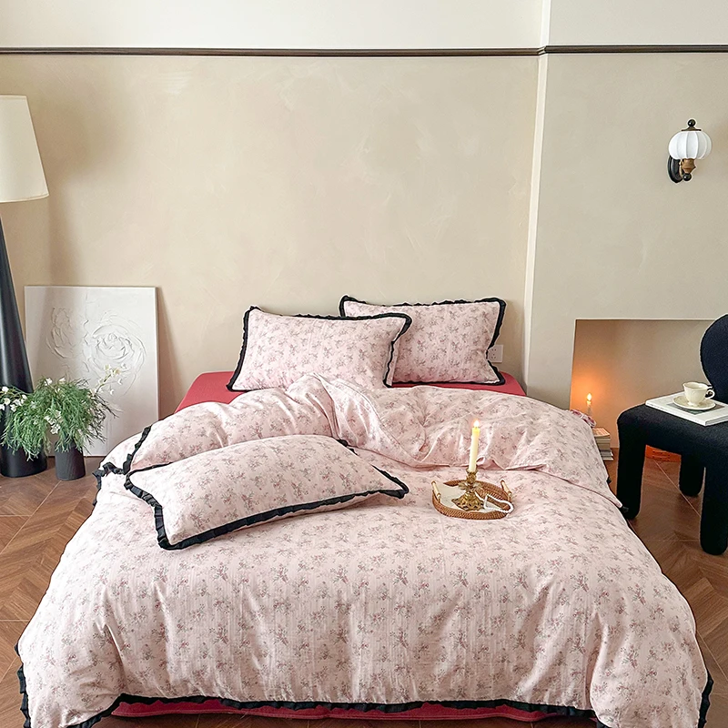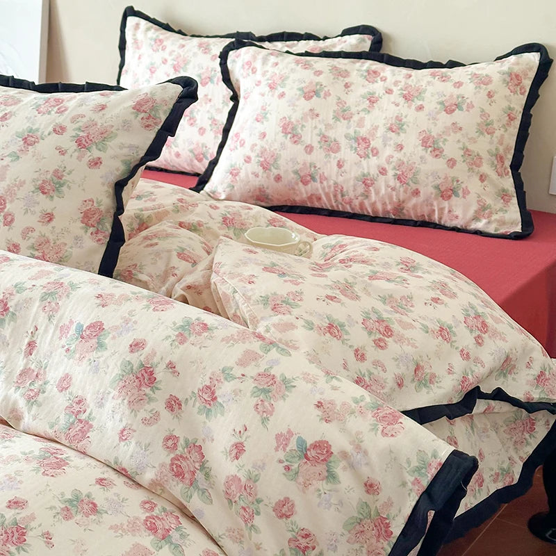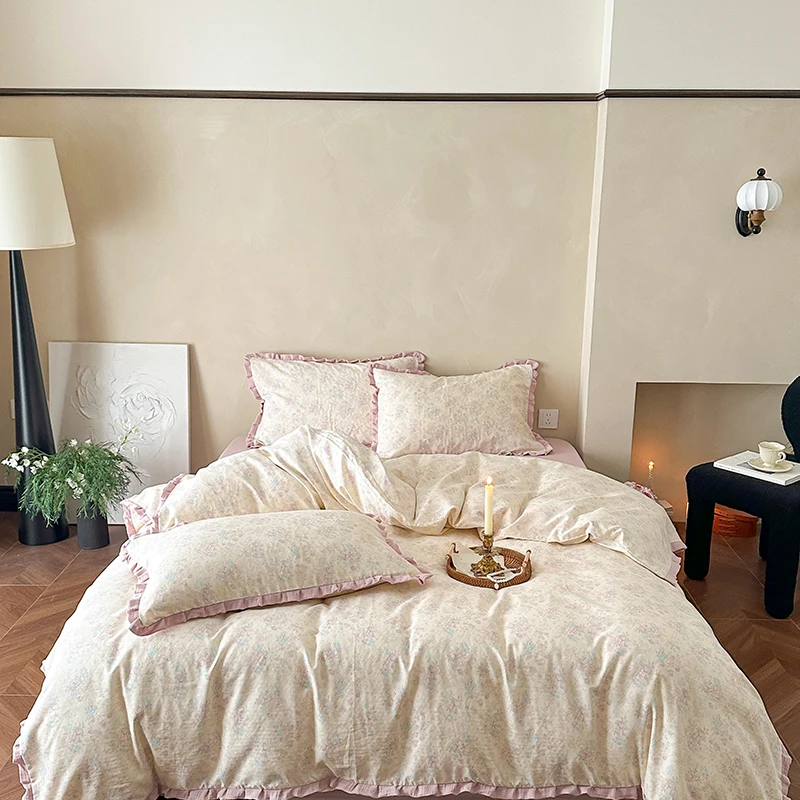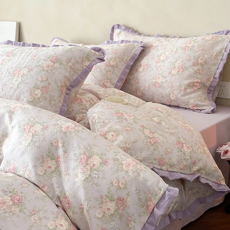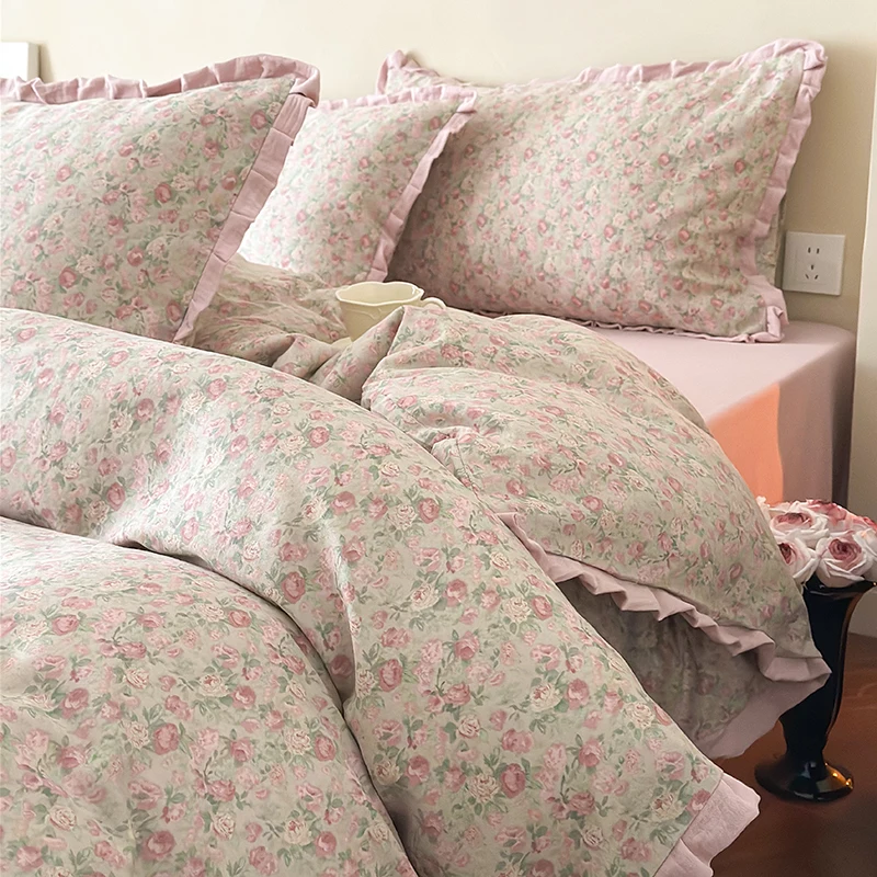 Cyflymder Korean Princess Floral Ruffles 100% Cotton Double Layer Yarn Soft Bedding Set Single Queen King Duvet Cover Bed Sheet Pillowcase