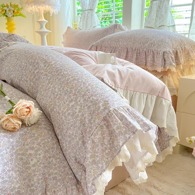 Cyflymder Korean Princess Style Small Florals Lace Ruffles 600TC Cotton Brushed 4Pcs Bedding Set Duvet Cover Flat/Fitted Sheet Pillowcases