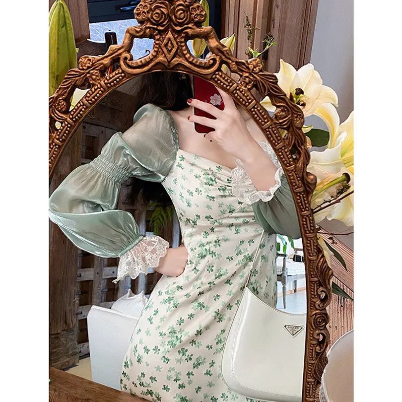 Cyflymder Korean Summer Chiffon Lace Floral Dress Elegant Party One Piece Dress Women Green Puff Sleeve Vintage Midi Dress New