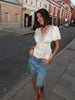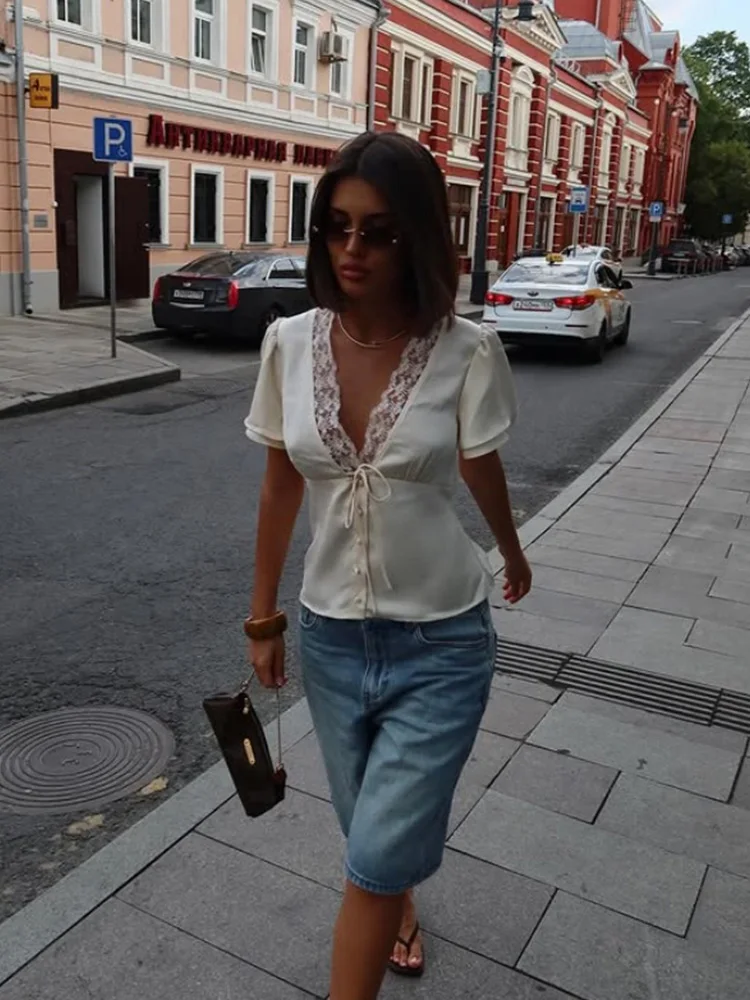 Cyflymder Lace Patchwork Short Sleeve Tops for Women V Neck Sheath Solid Tees Fashion Female Sexy Club T-shirts Elegant Casual