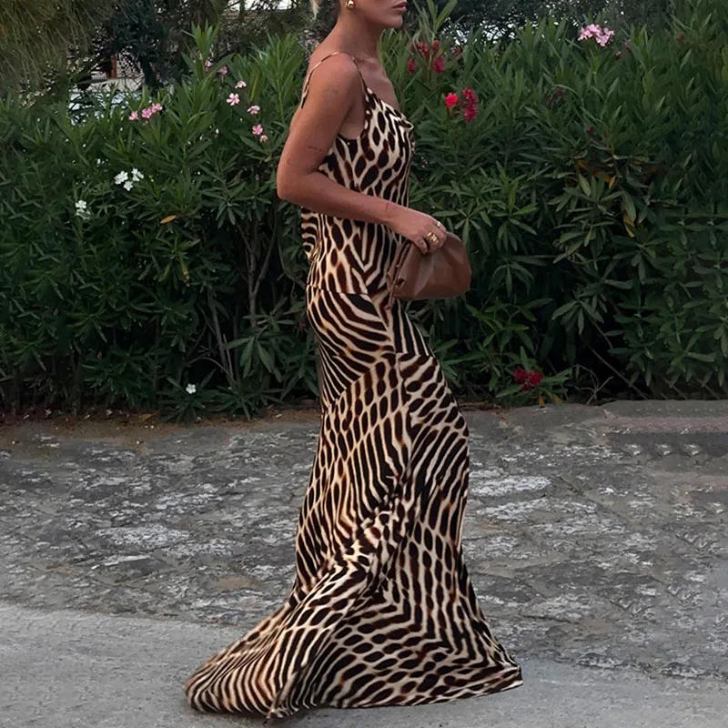 Cyflymder Lady Casual Holiday Beach Bohemian Dress Vintage Leopard Print Slim Straps Long Dress Spring Summer V Neck Sleeveless Maxi Dress