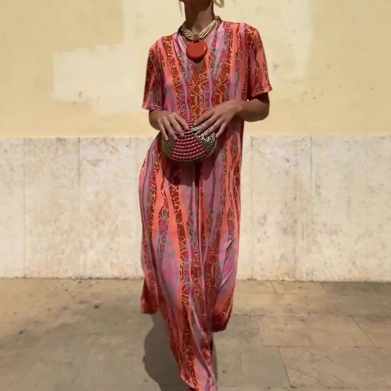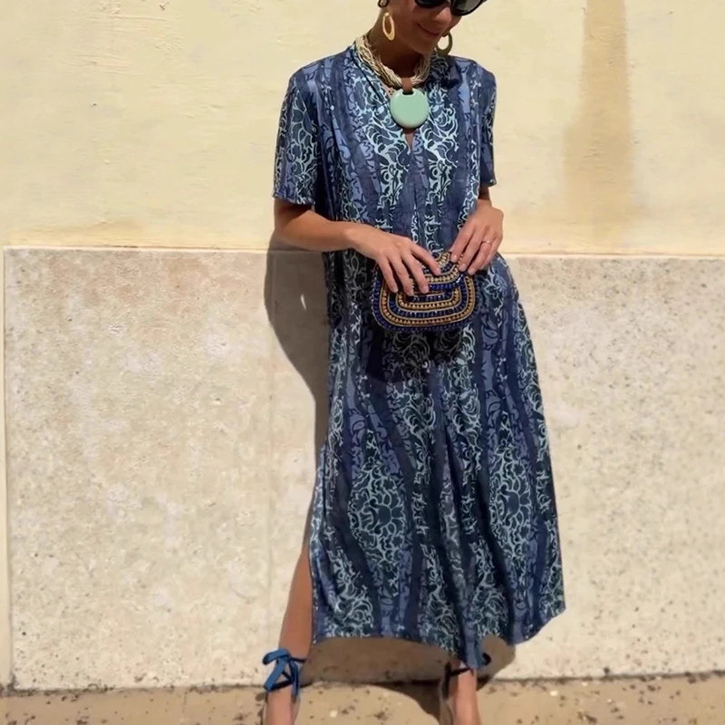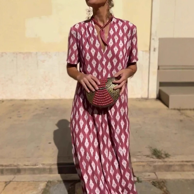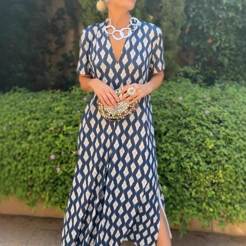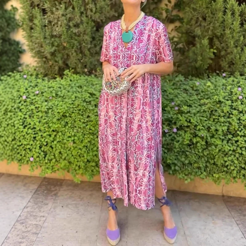 Cyflymder Leisure High Waist Pattern Printed Women's Dress Summer New Loose Party Maxi Dress Elegant V-neck Short Sleeve Commuting Dresses