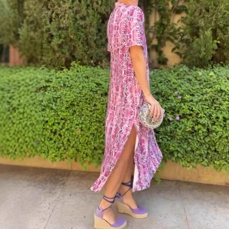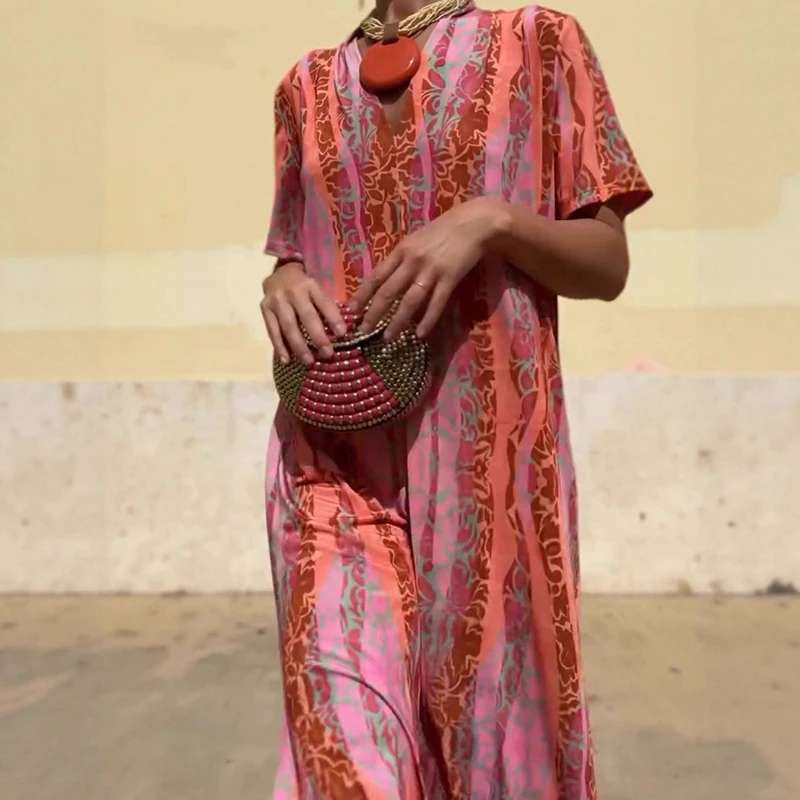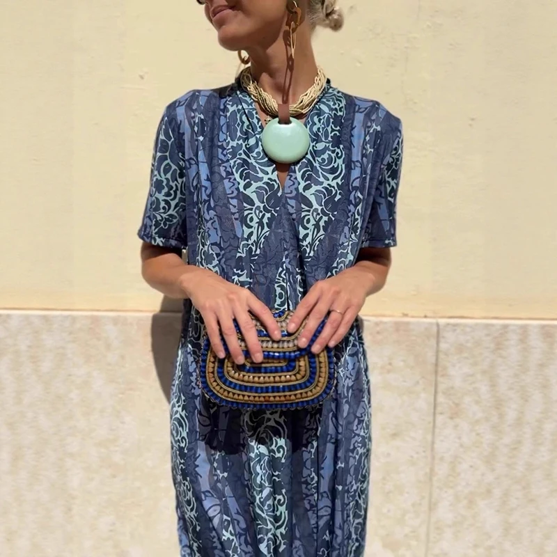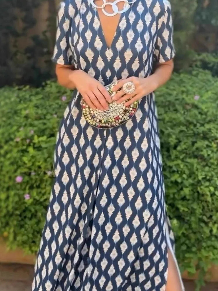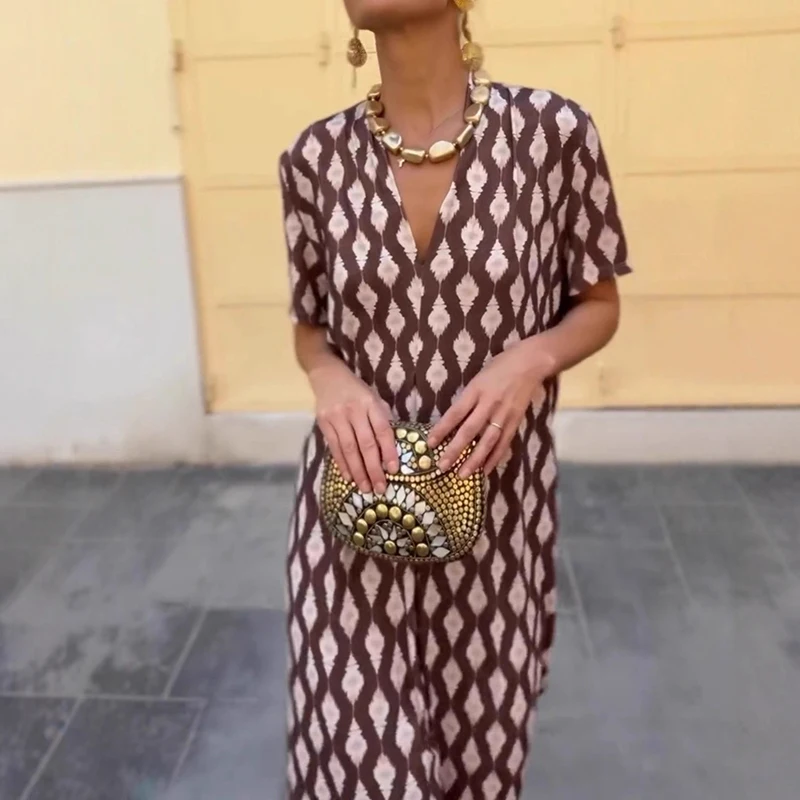 Cyflymder Leisure High Waist Pattern Printed Women's Dress Summer New Loose Party Maxi Dress Elegant V-neck Short Sleeve Commuting Dresses