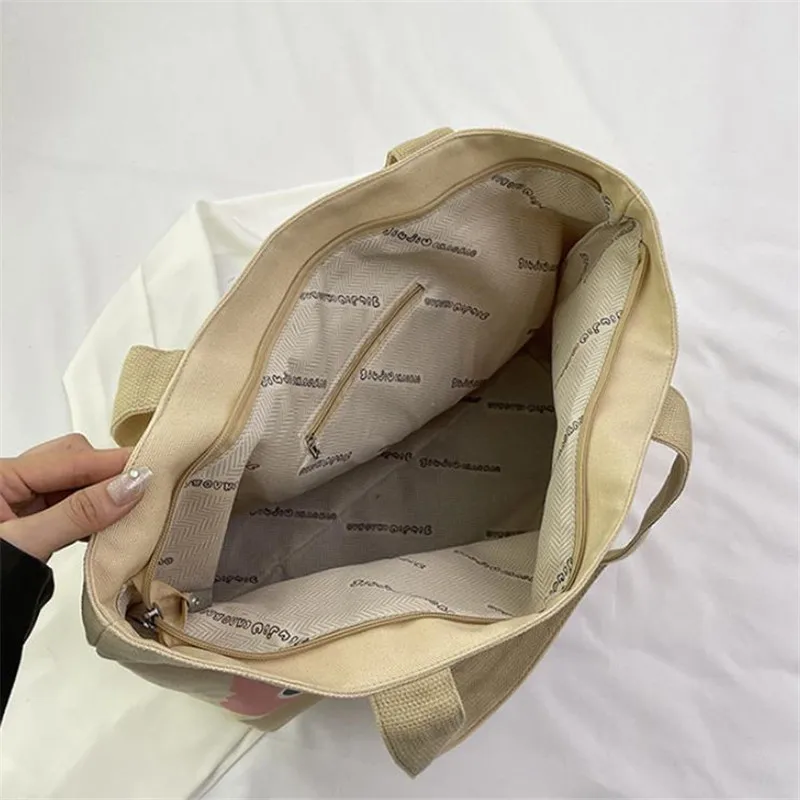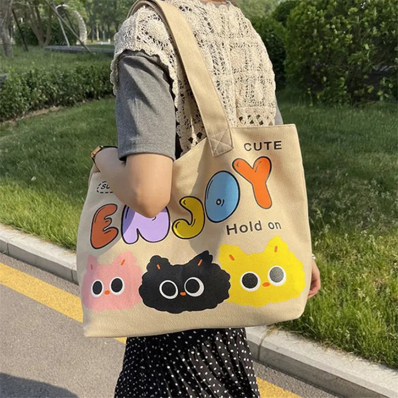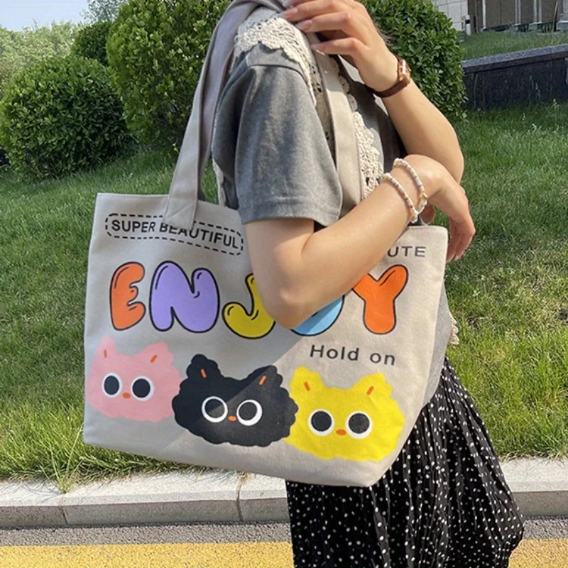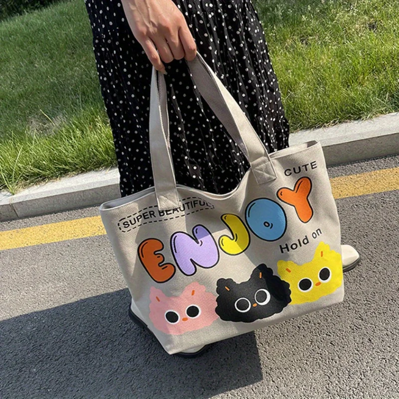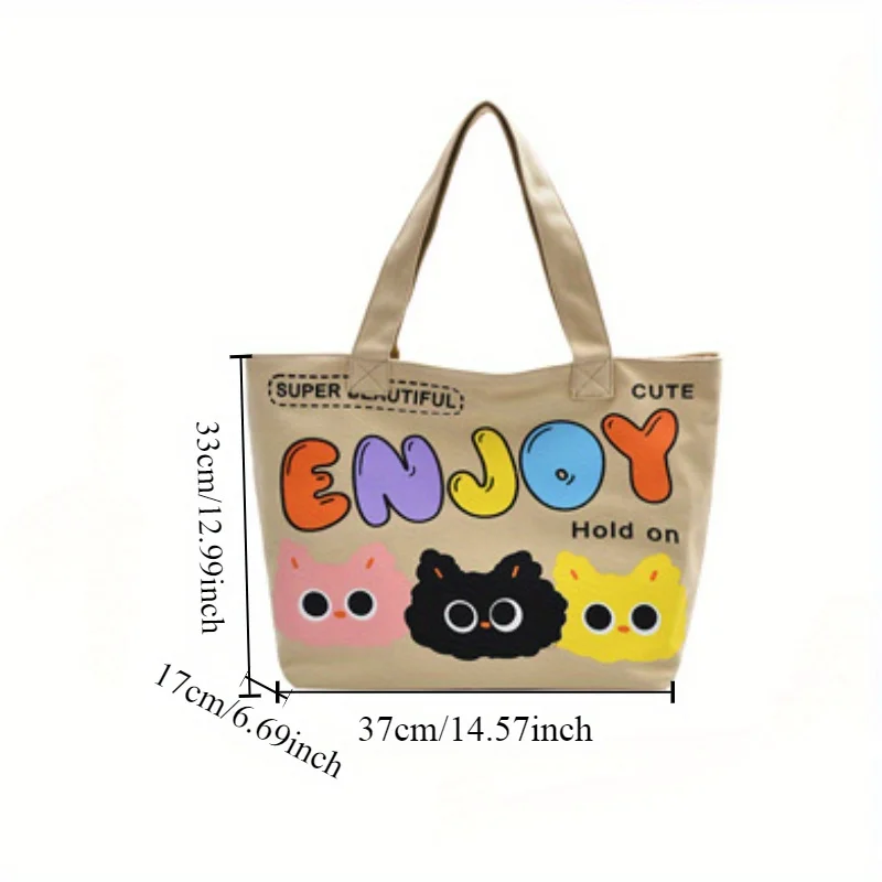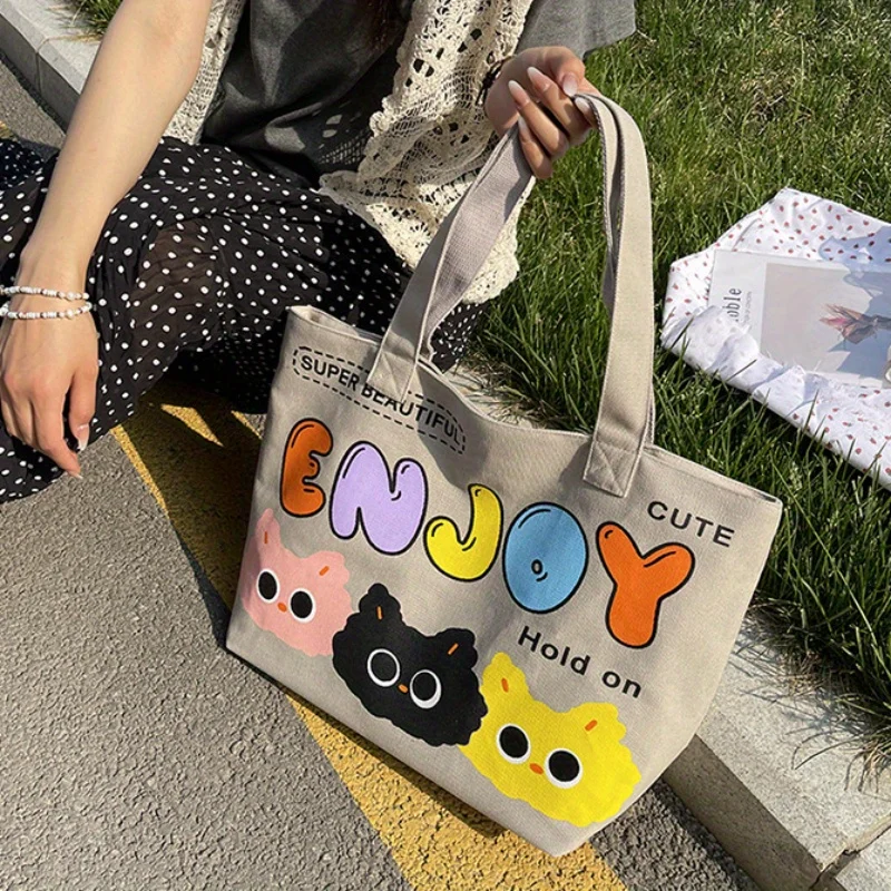 Cyflymder Letter Printed Tote Bag, Cute Cartoon Canvas Handbag Shoulder Bag, Large Capacity Shopping Bag, Campus Computer School Book Bag