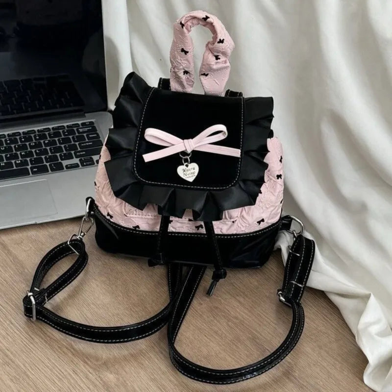 Cyflymder Lolita Black Pink Bow Ruffled Backpack Women Girls Compact Sweet Edgy Commuter Versatile Rucksack Ladies Elegant Mochilas Mujer