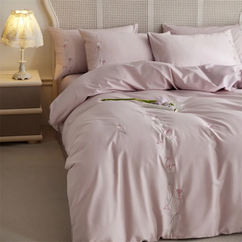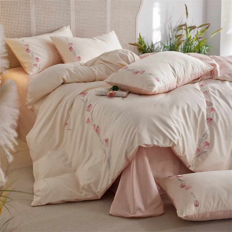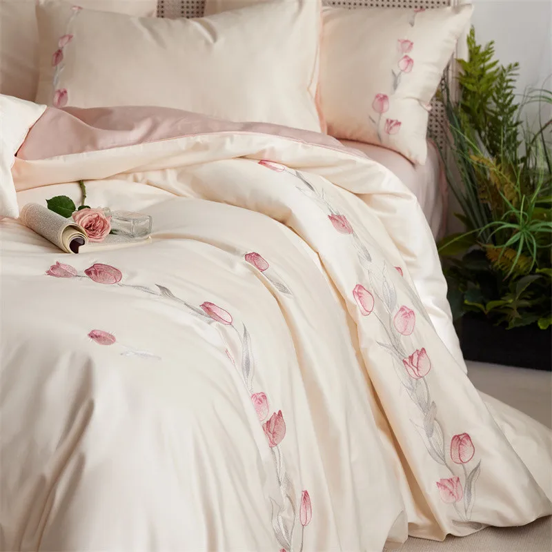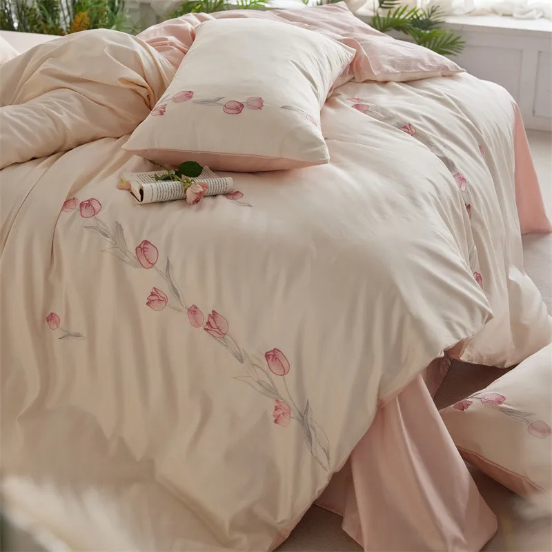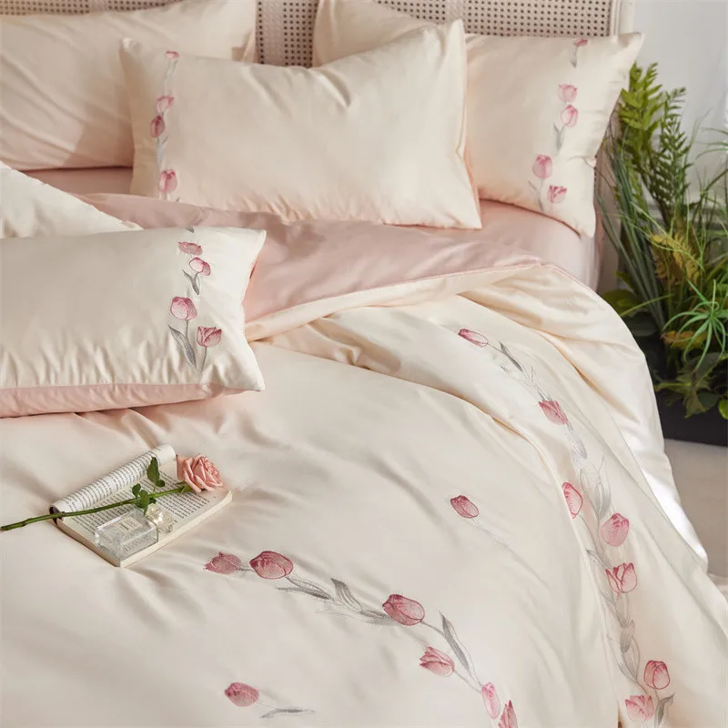 Cyflymder Long-staple Cotton Floral Blossom Embroidery Comfortable Ultra Soft (1Duvet Cover+1Flat Bedsheet/Fitted Bedsheet+ 2Pillowcases)
