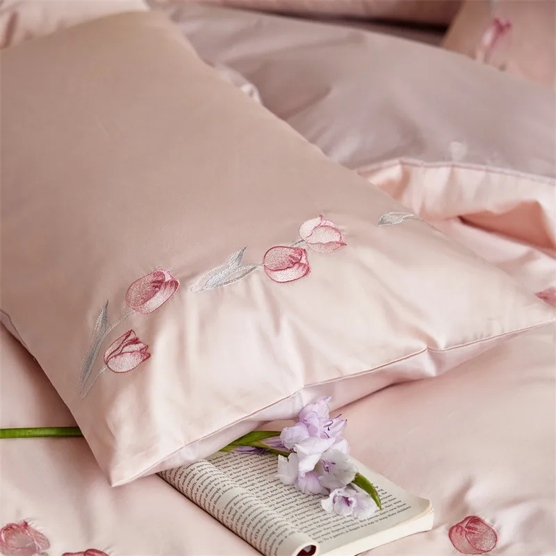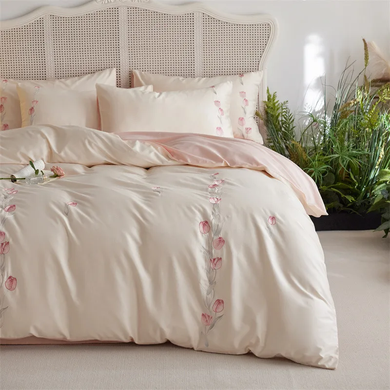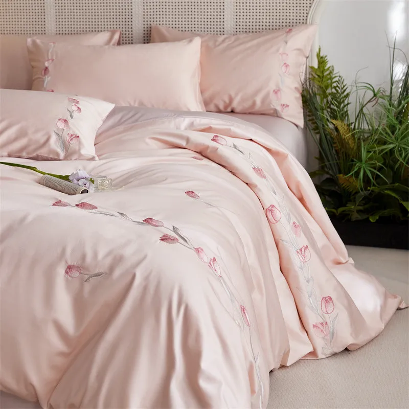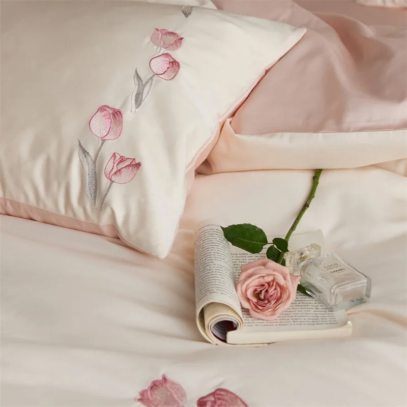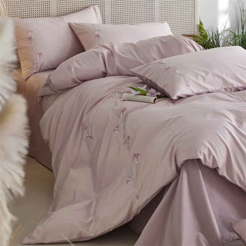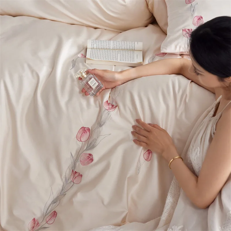 Cyflymder Long-staple Cotton Floral Blossom Embroidery Comfortable Ultra Soft (1Duvet Cover+1Flat Bedsheet/Fitted Bedsheet+ 2Pillowcases)