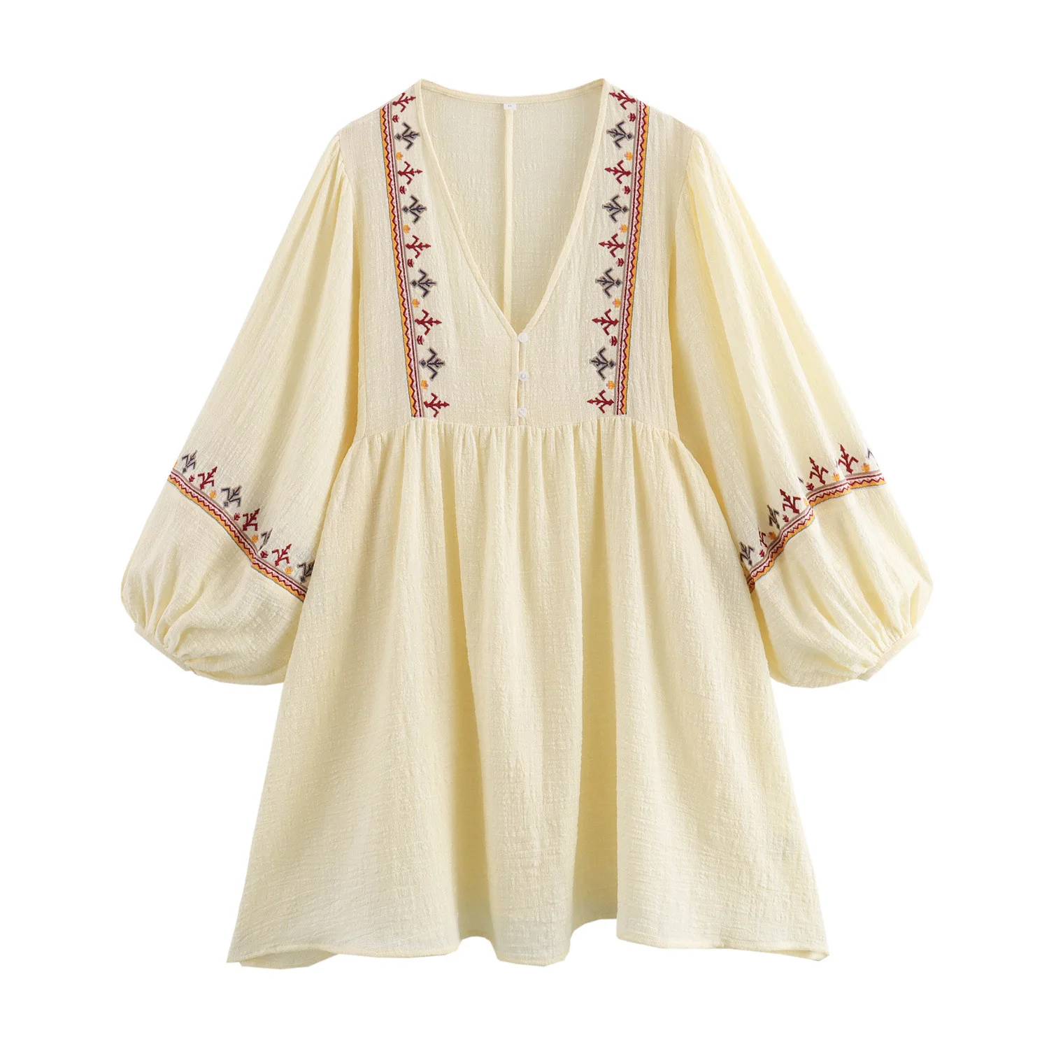 Cyflymder Loose Summer New Women's Dr Embroidered V-ne Vaion Patchwork High Waist Lantern Sve Long Sve Single Piece