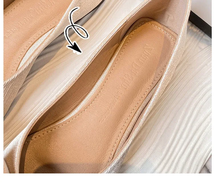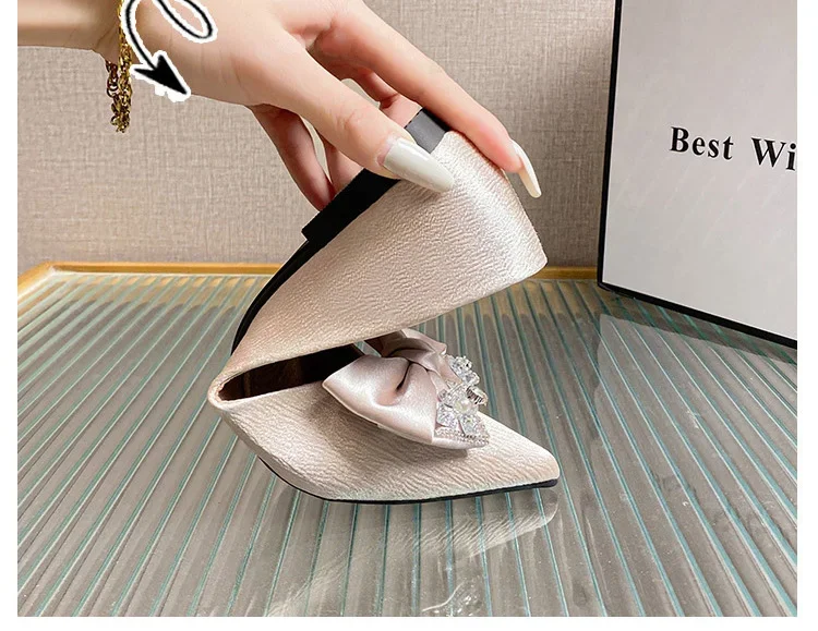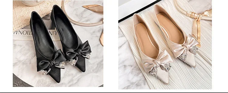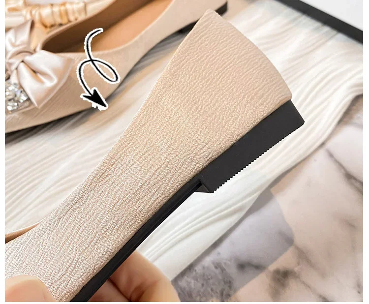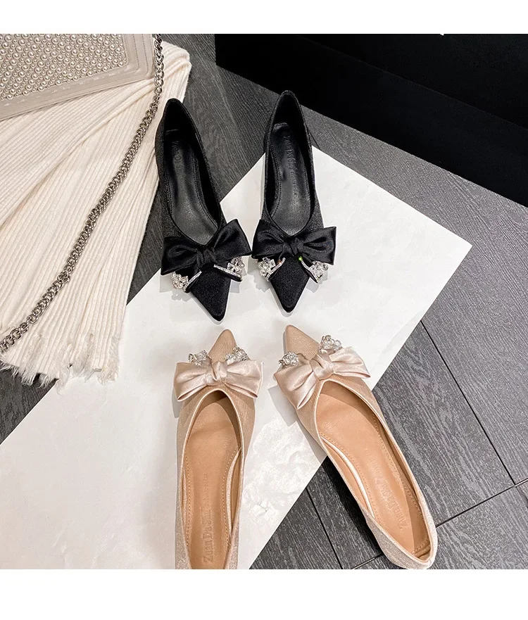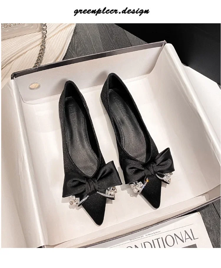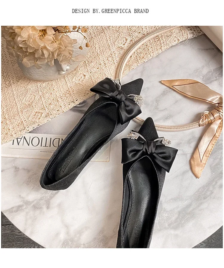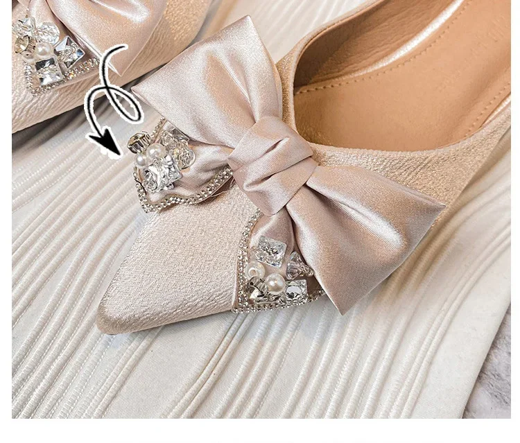 Cyflymder Luxury Rhinestone Bow Flats Shoes Woman Pointed Toe Champagne Silk Bowknot Ballet Shoes Wedding Shoes for Women