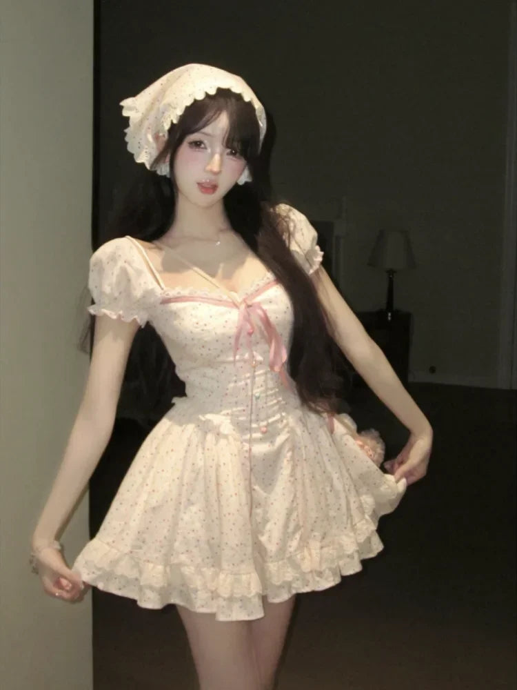 Cyflymder Mini Dresses Women Square Collar Puff Short Sleeve Lace Ruffles Polka Dot Bandage Sweet Party Elegant Dress Female