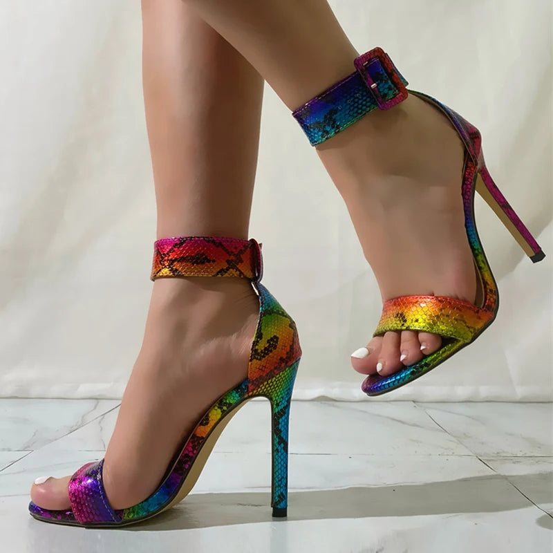 Cyflymder Mixed Colors Snake Print Leather Women Shoes Fashion Big Buckle Ankle Cover Strap Sandals Sexy Party Club Stripper Heels