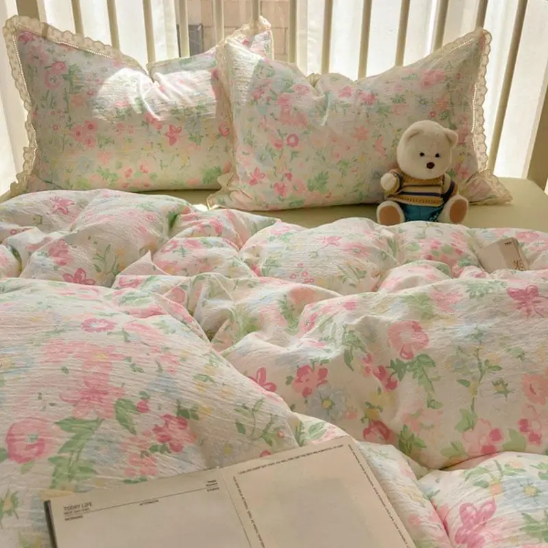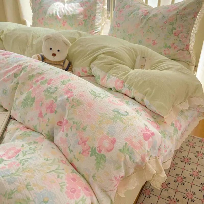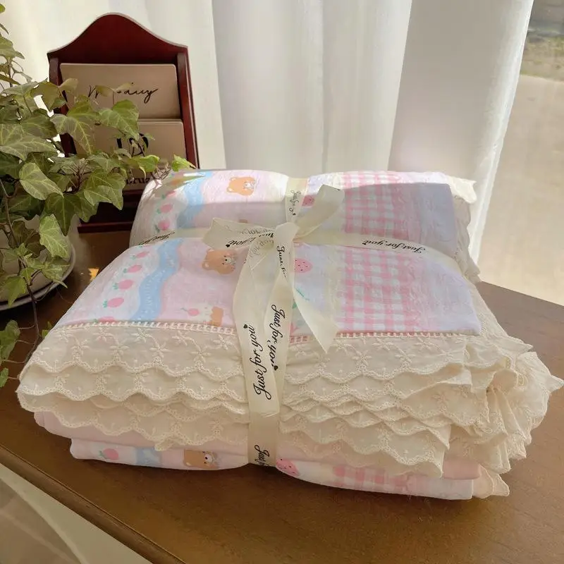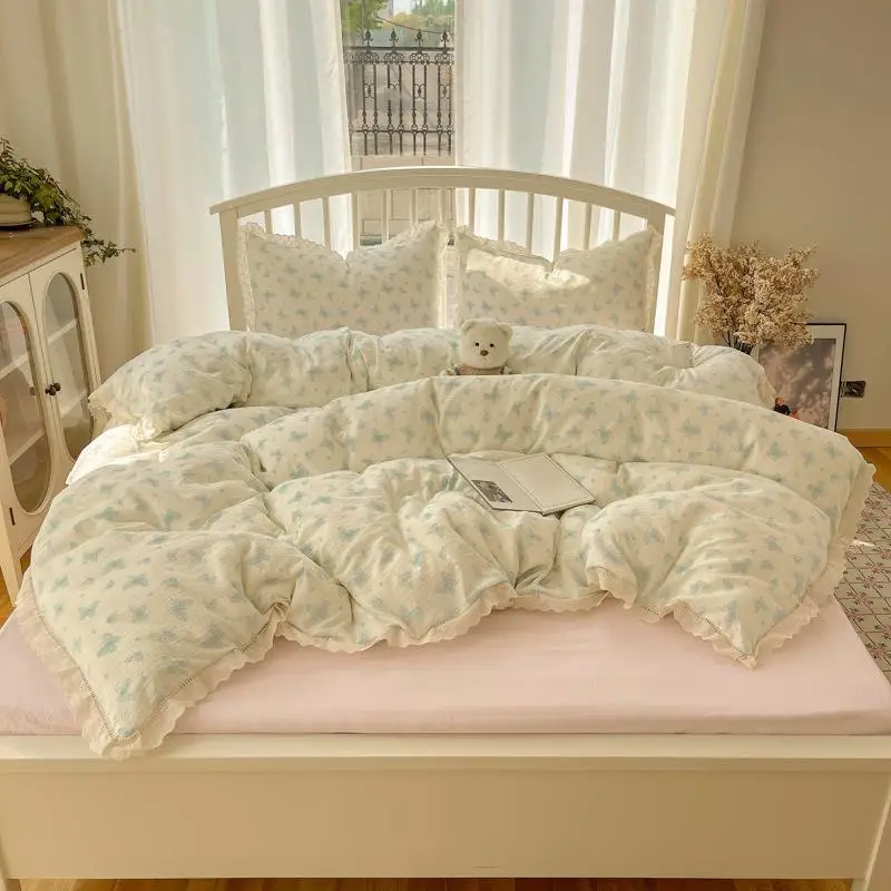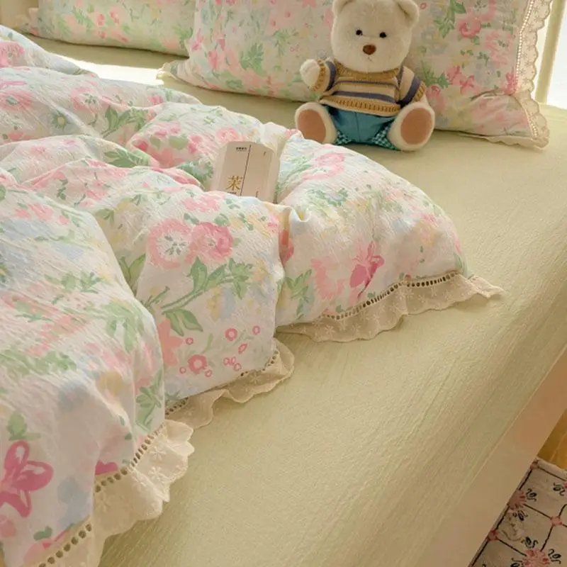 Cyflymder New A-Class Hollow Lace Bedding Set Fitted Sheet Quilt Cover Pillowcase for Spring Summer Korean Skin Friendly Cozy Bedclothes