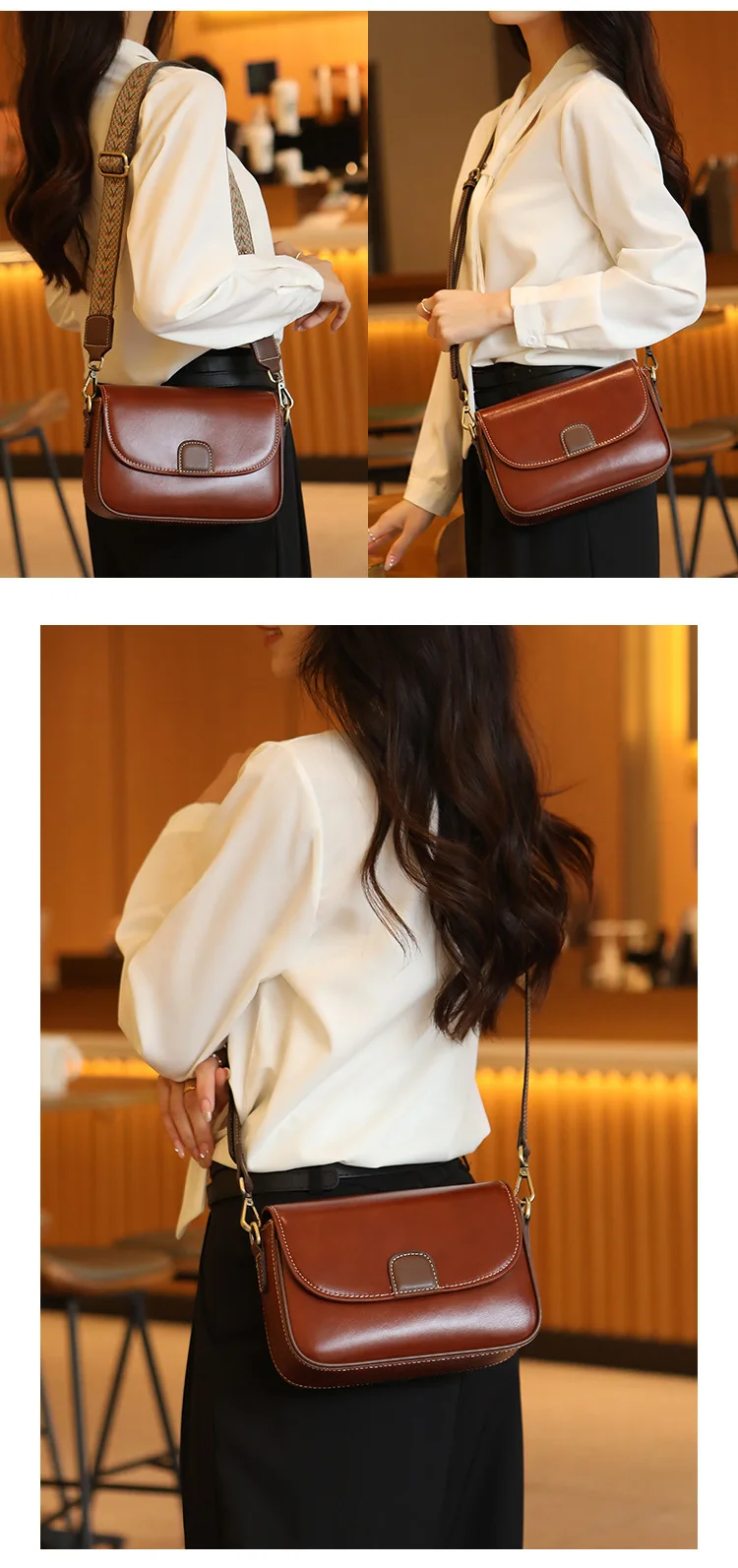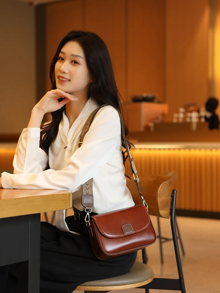 Cyflymder new fashionable retro cowhide shoulder bag with contrasting ethnic style wide shoulder strap and crossbody small square bag