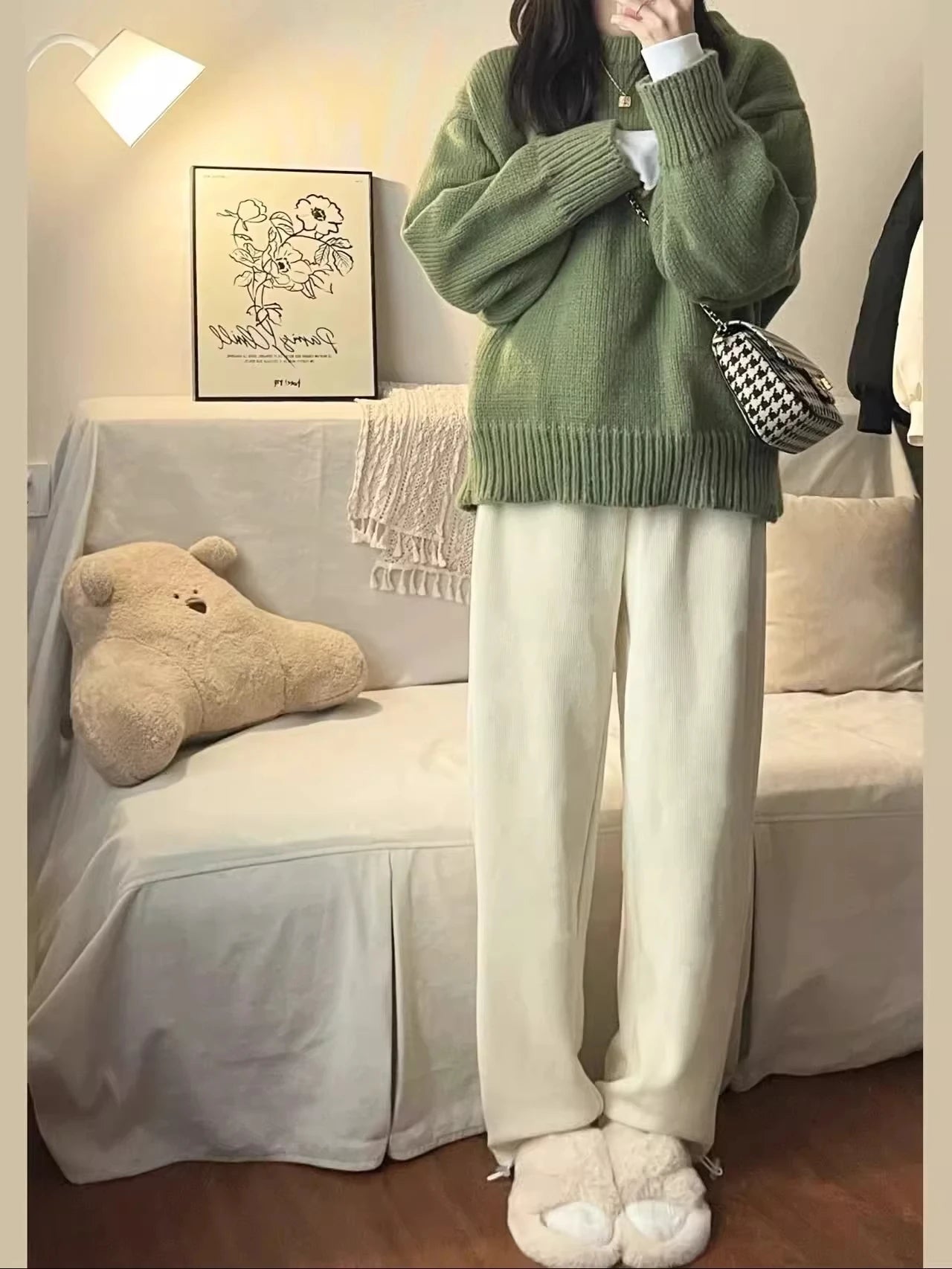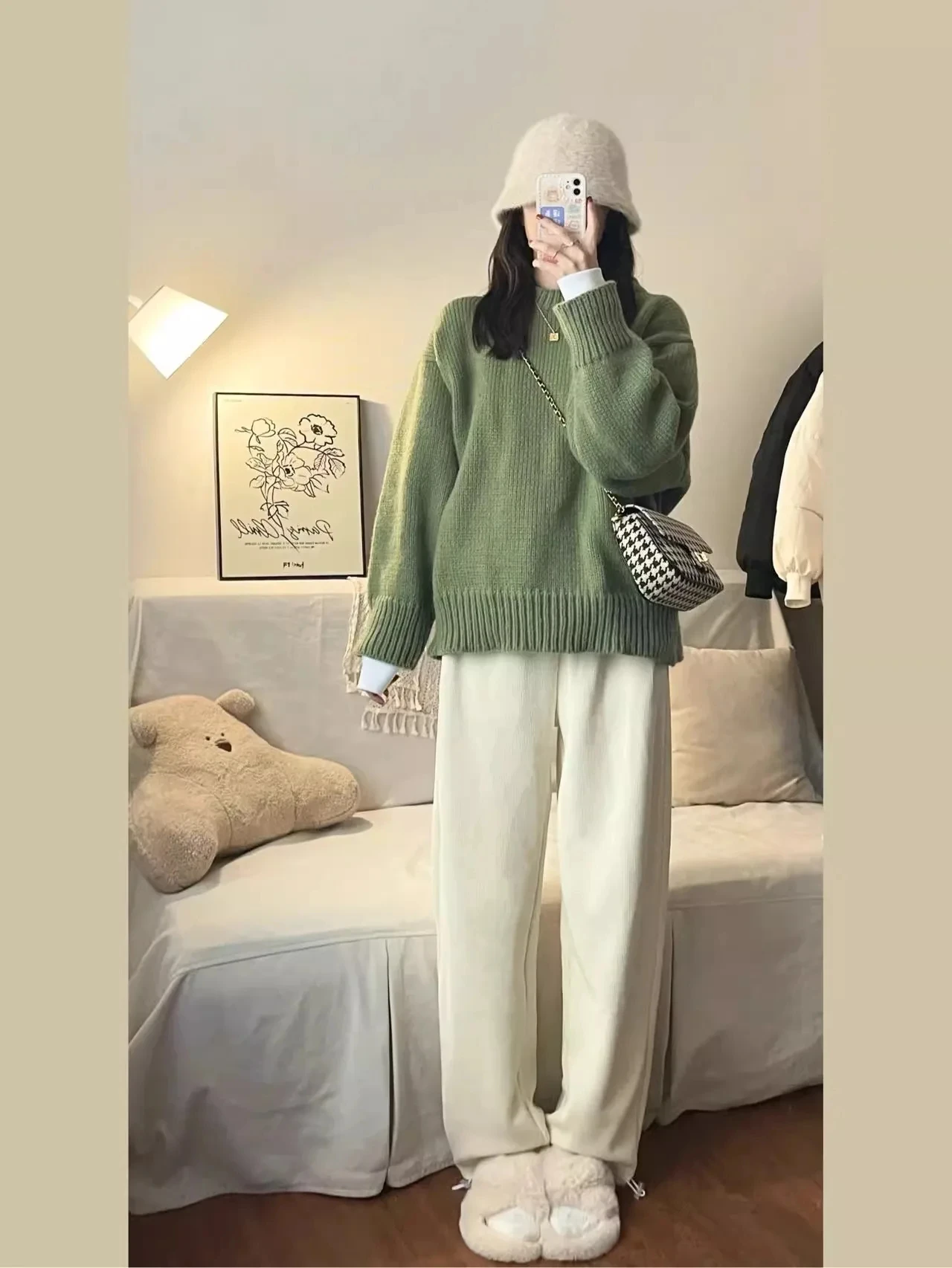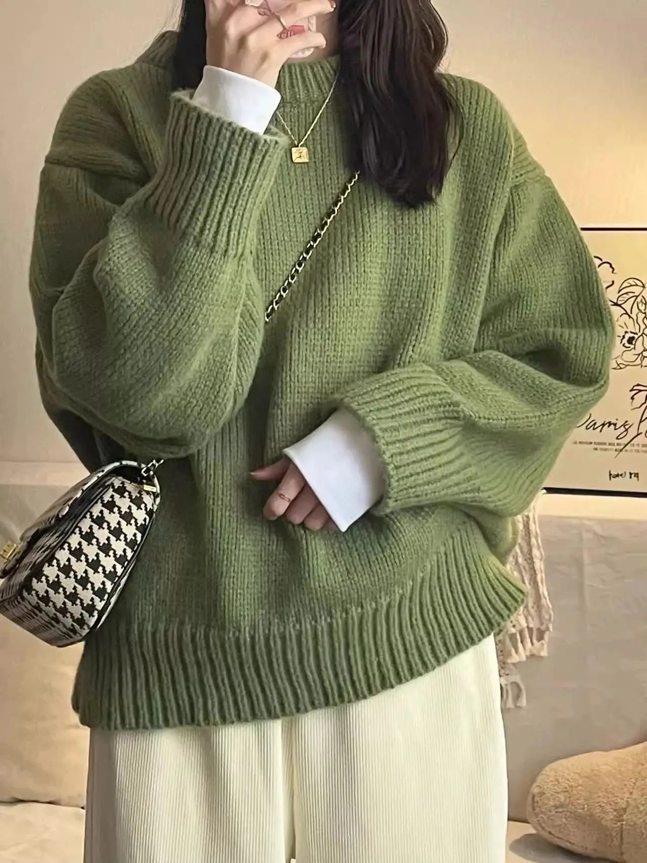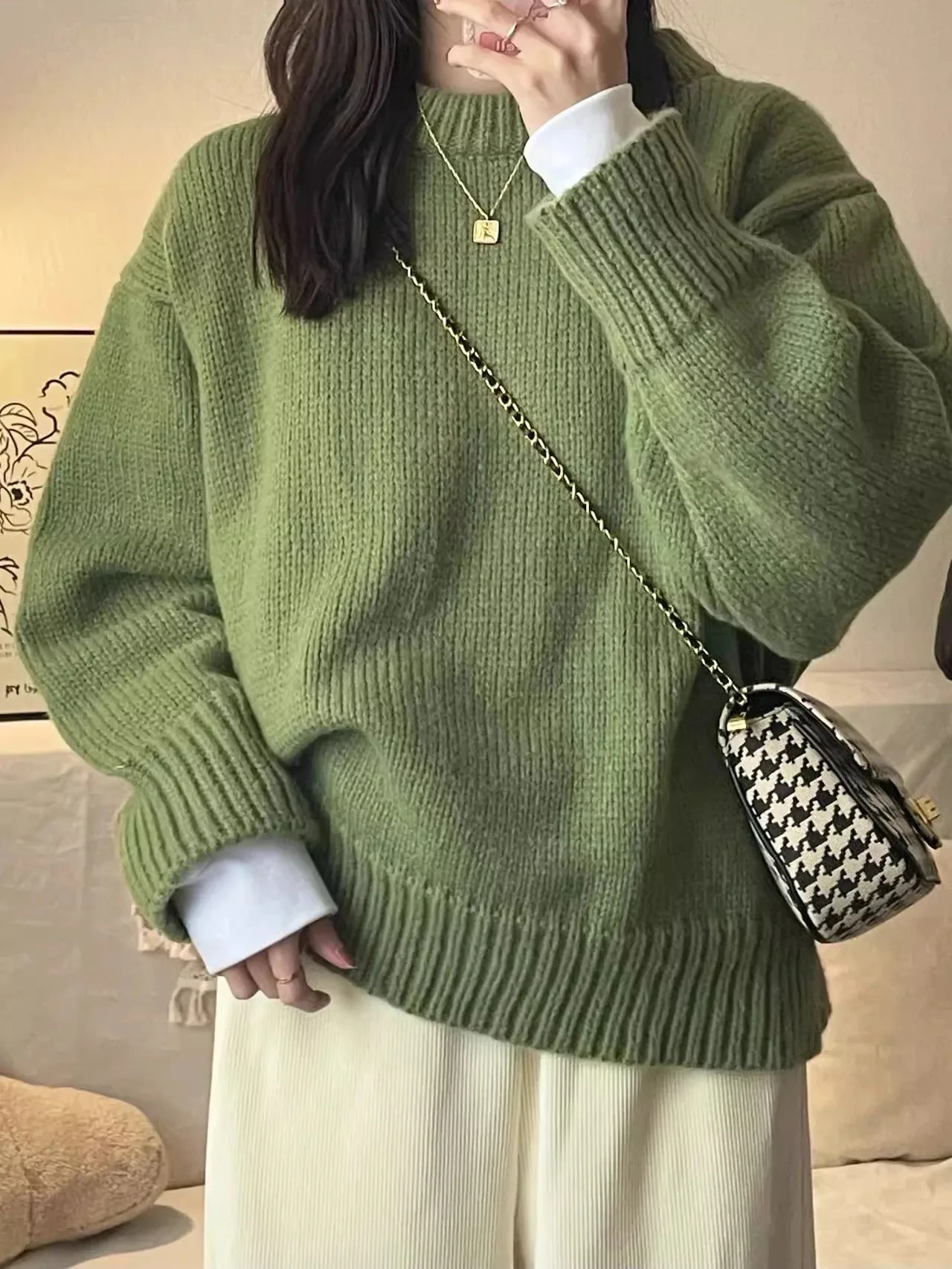 Cyflymder New O-Neck Loose Green Pullover Sweater For Women Autumn Winter Thick Retro Japanese Lazy Style Interior Bottom Knitted Top