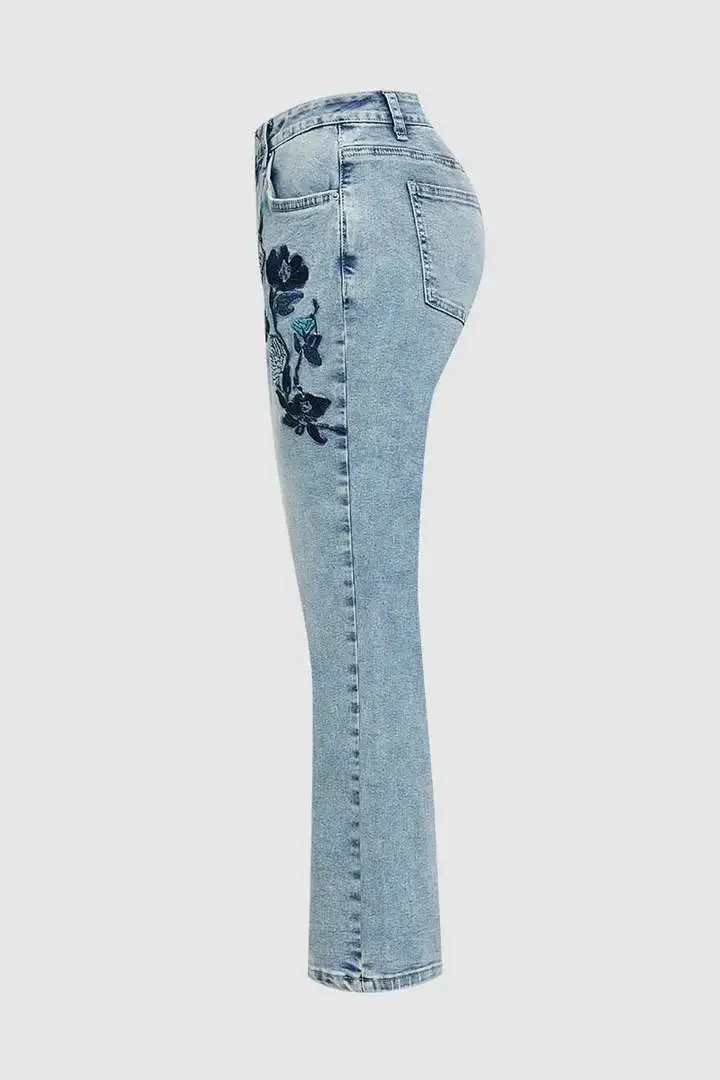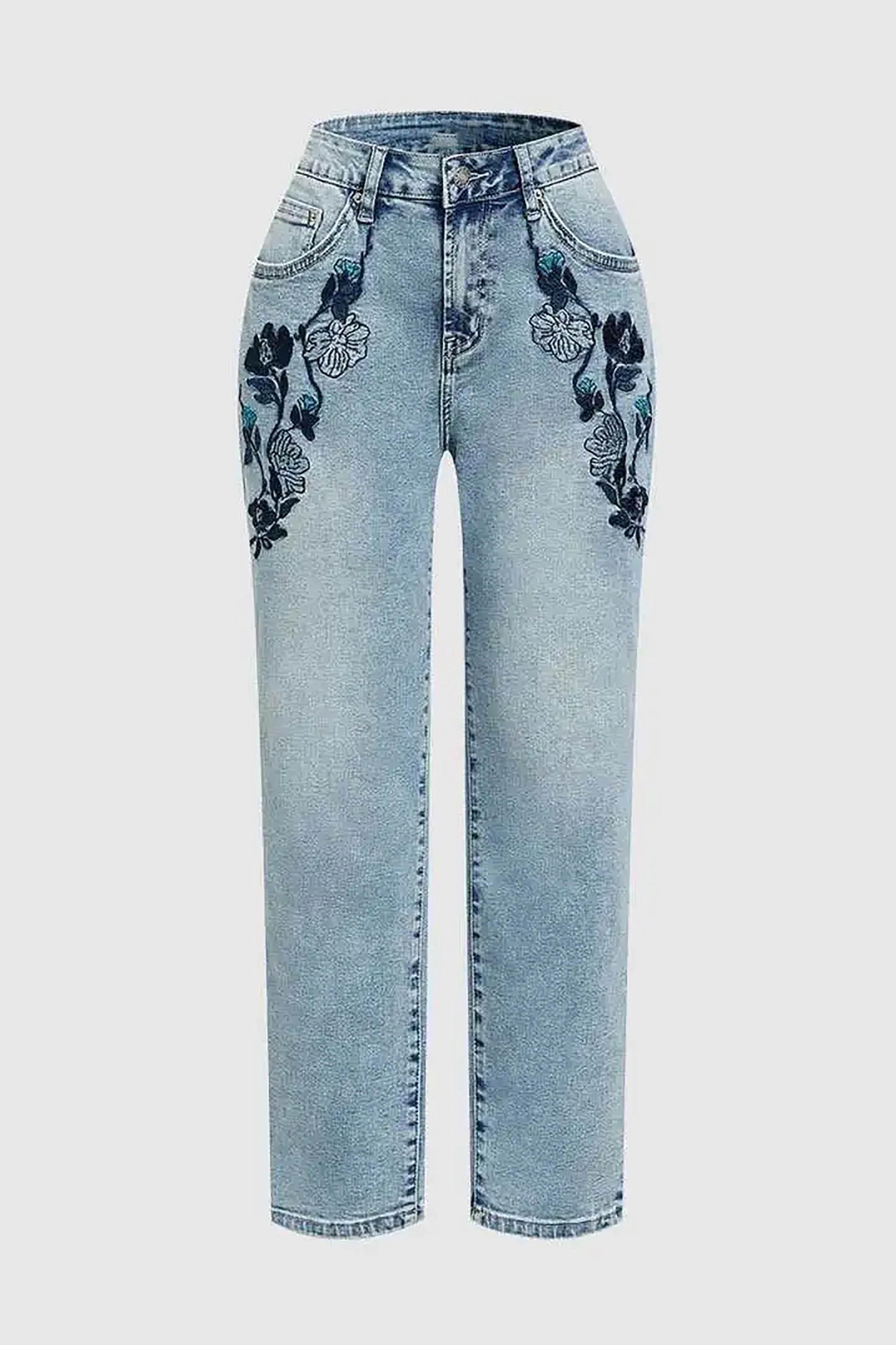 Cyflymder New Slimming Girlfriend Ankle Denim Jeans Flora-Embroidered High Stretchy Ladies Pants Mid Rise Straight Leg Mom's Trousers T49
