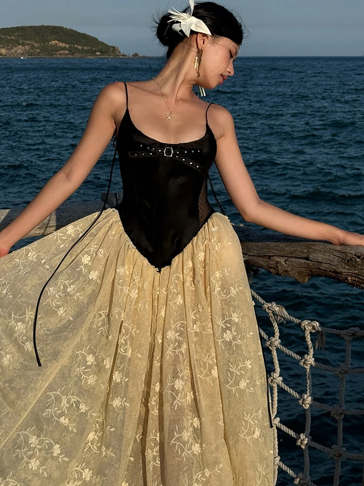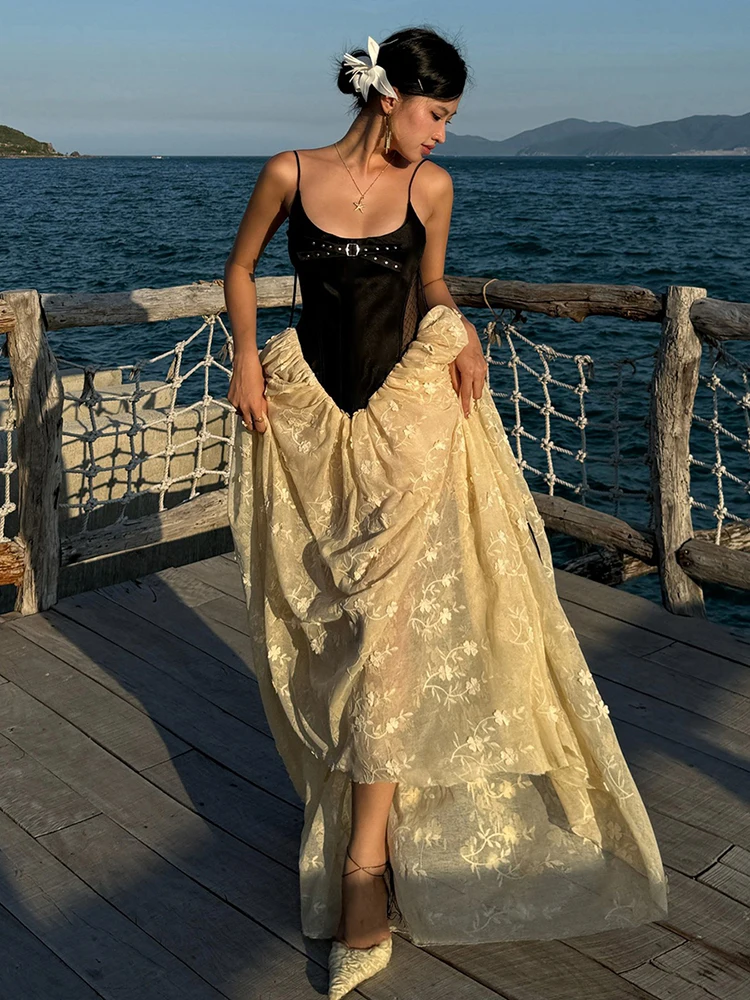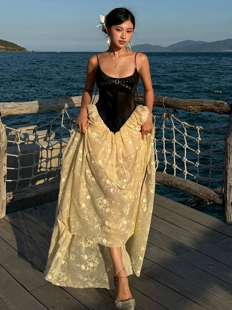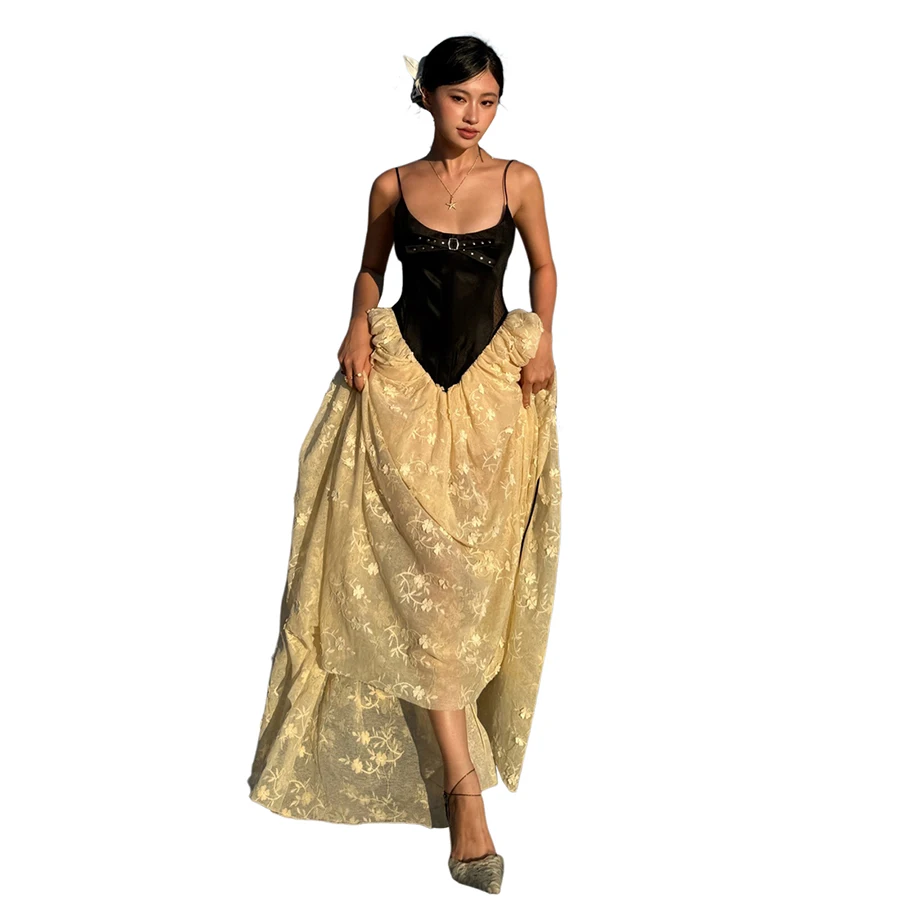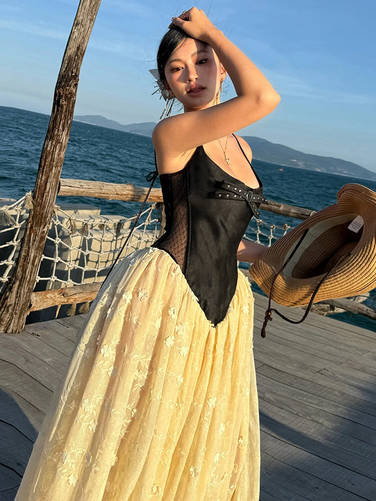 Cyflymder Patchwork Jacquard Split Dress Women Bow Lace-Up Mesh Low Chest Fairycore Birthday Beach Vocation Skinny Long Bodycon