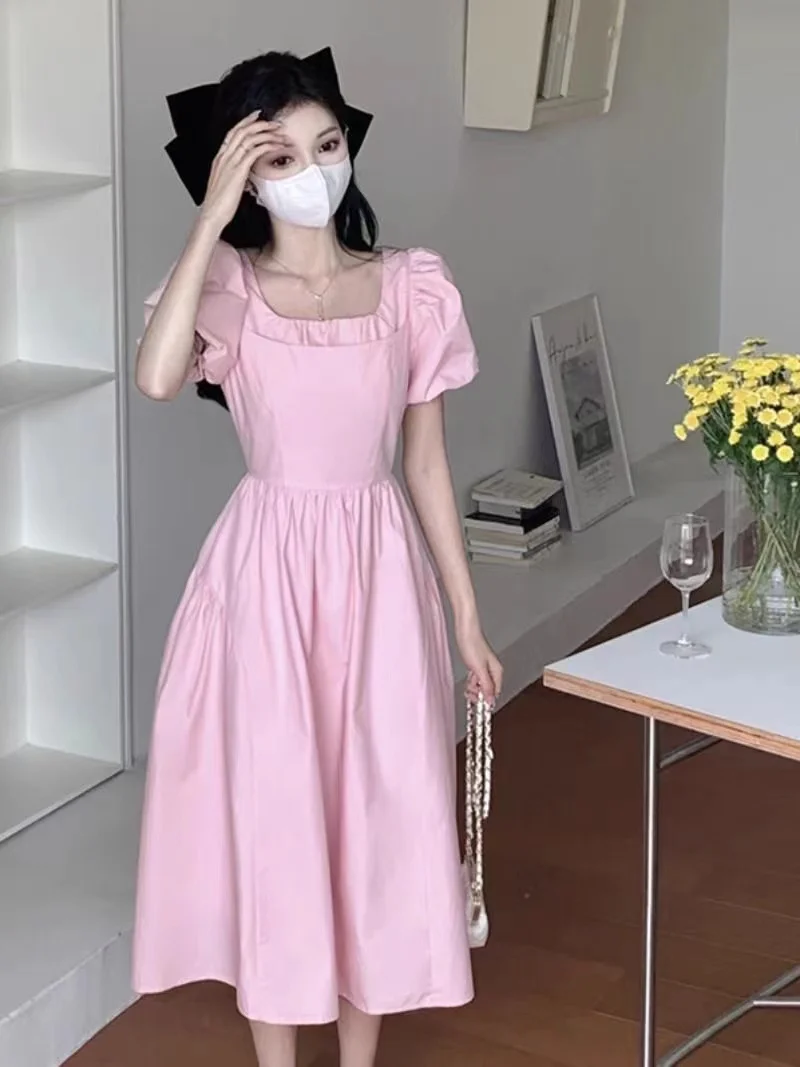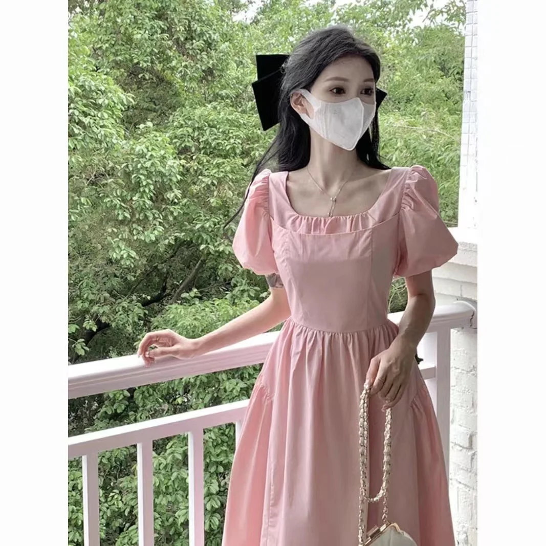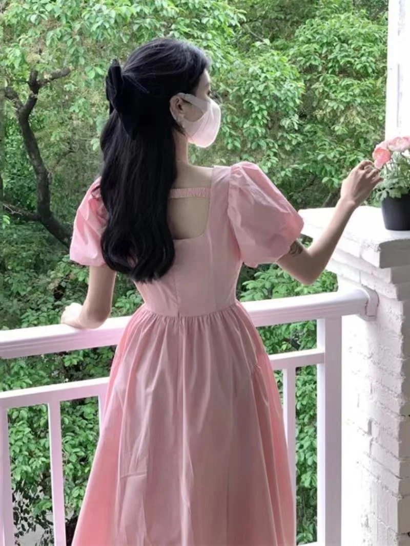 Cyflymder Pink Square Neck Long Dress Summer New Style First Love Sweet Super Fairy Elegant Casual Dress