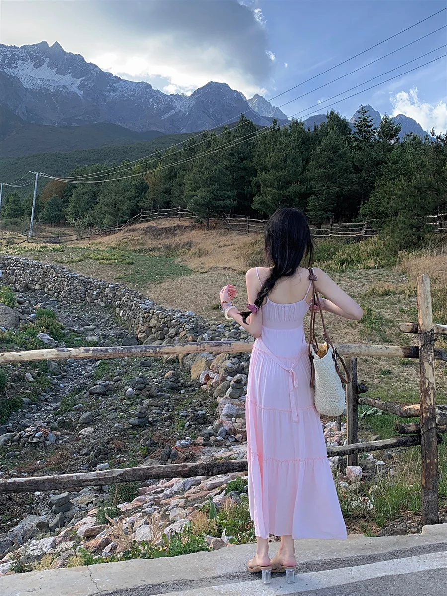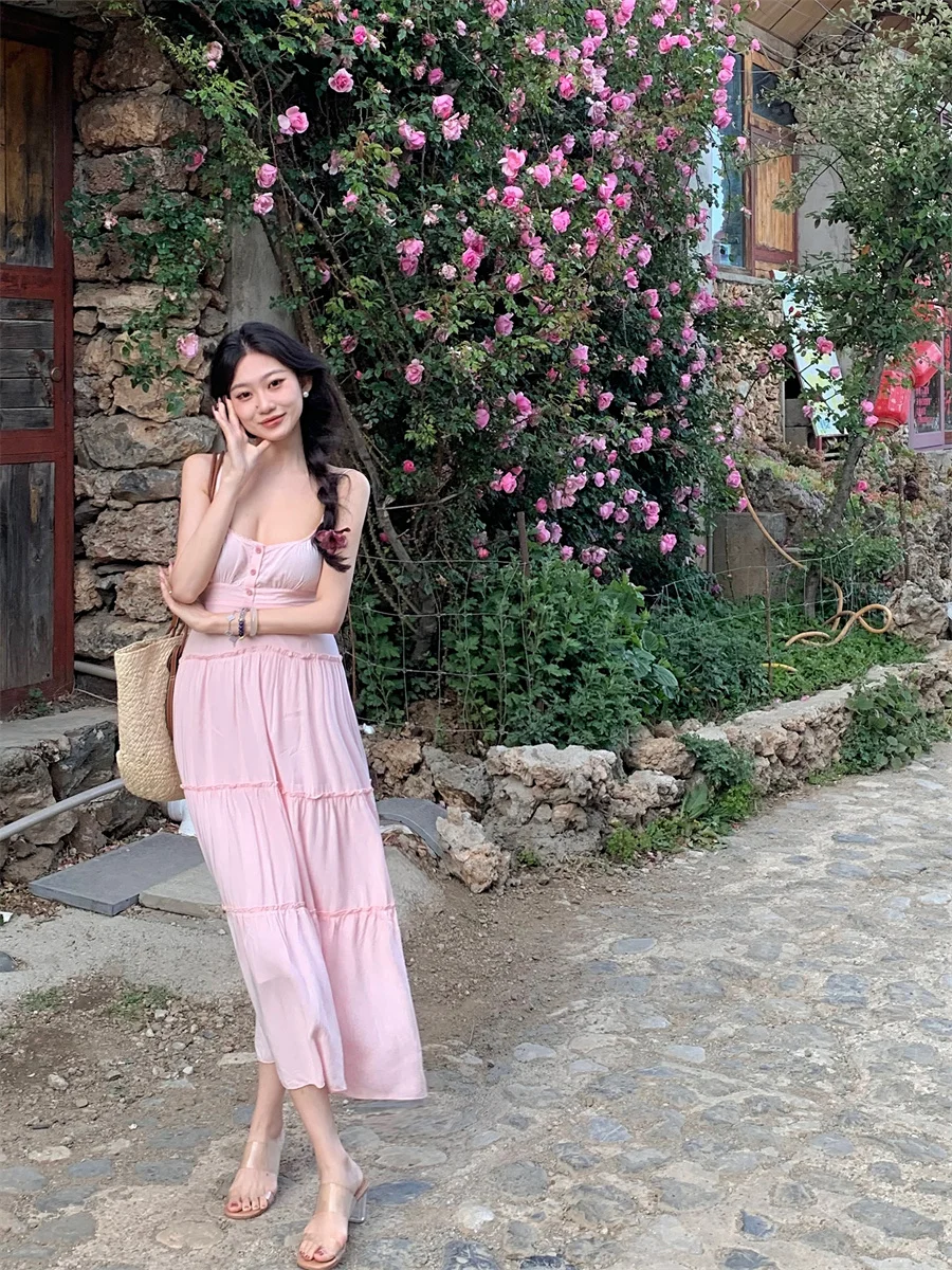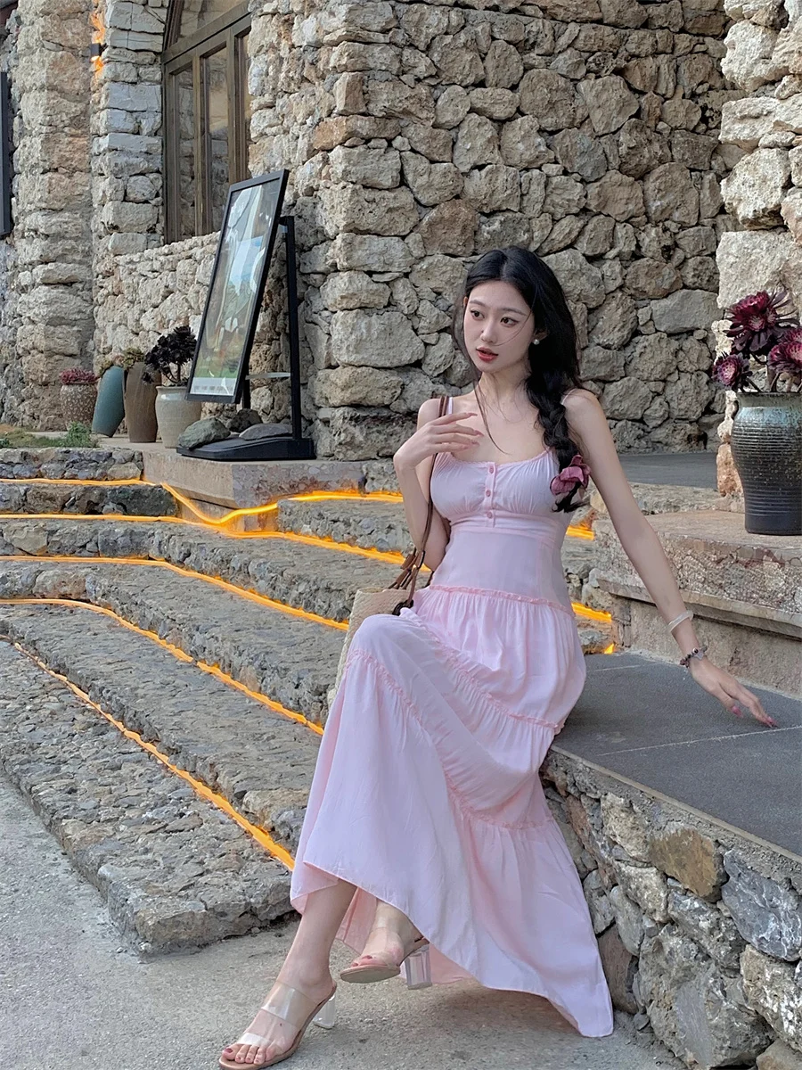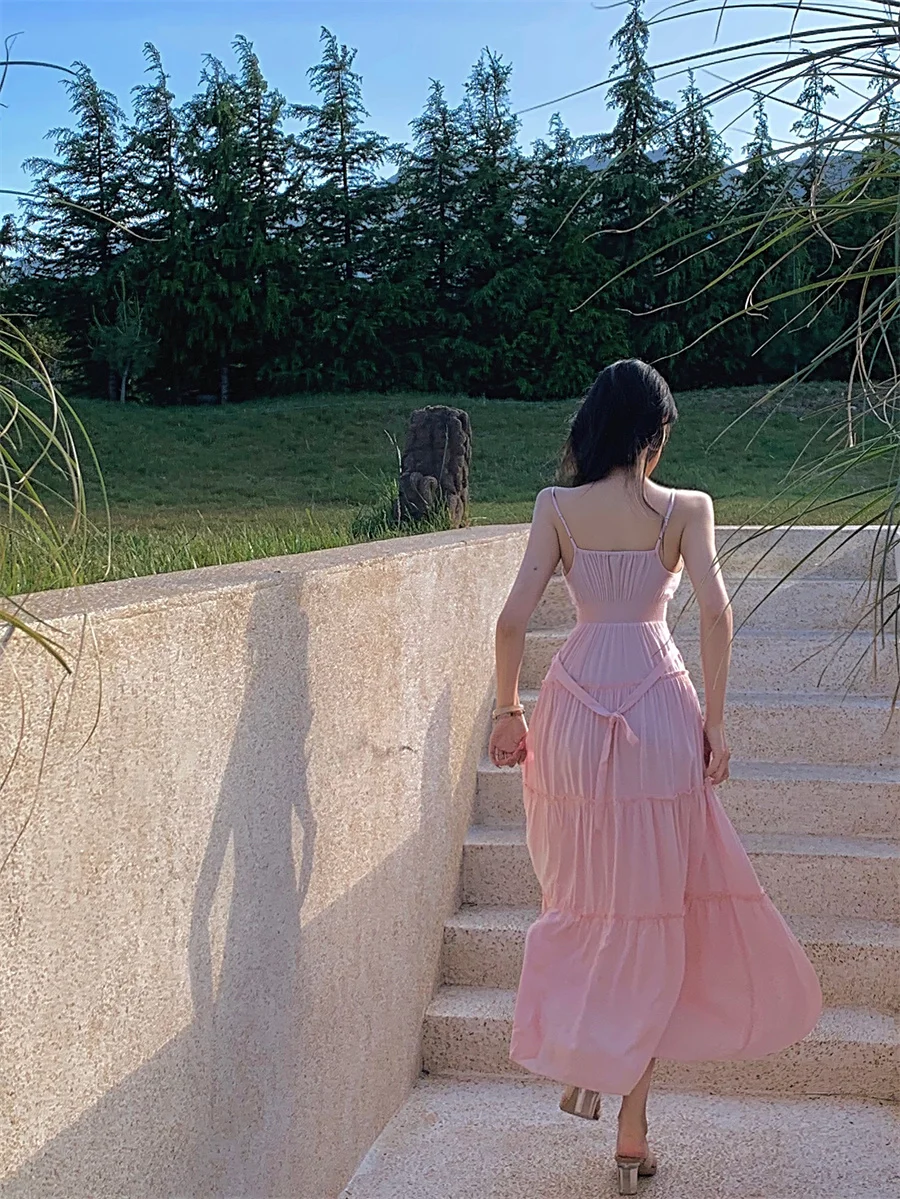 Cyflymder Pink Summer Sexy Long Dress Women Fashion High Waist Sleeveless Solid Straps Dress Casual Elegant Party Lady Dresses