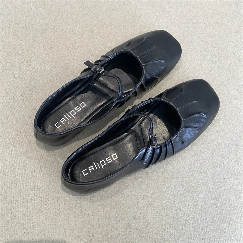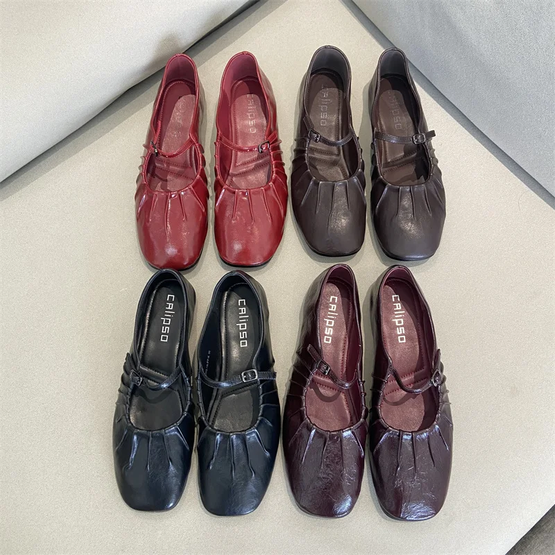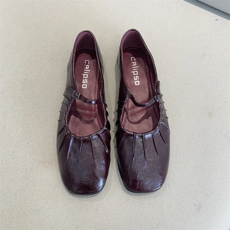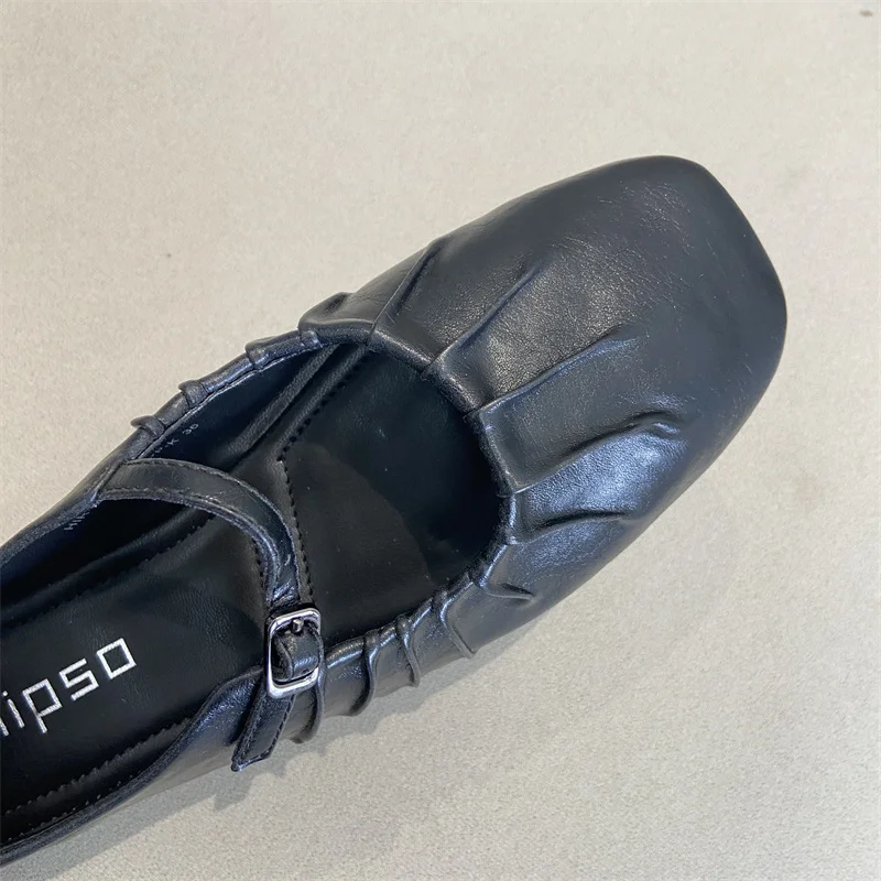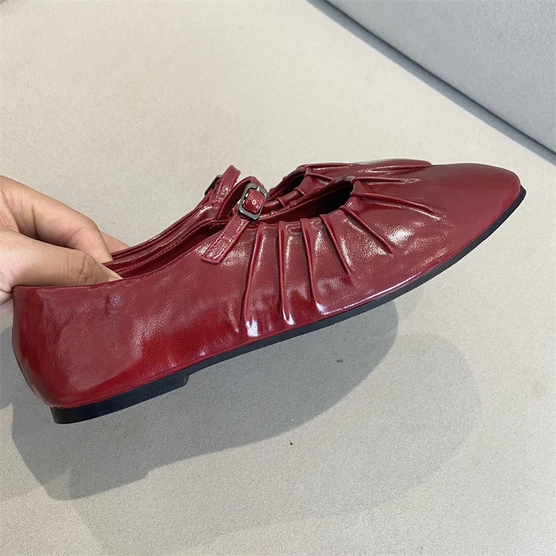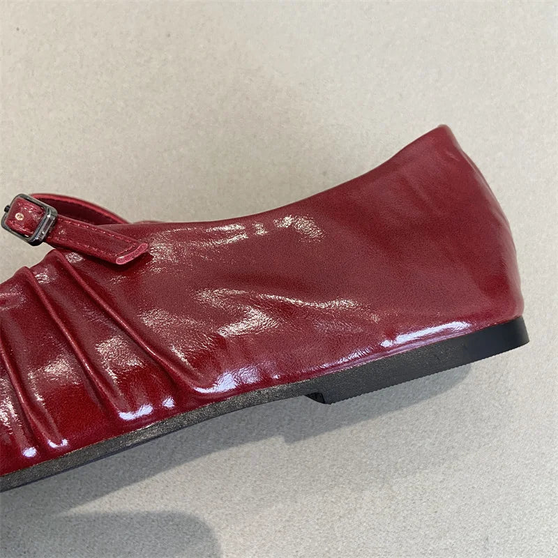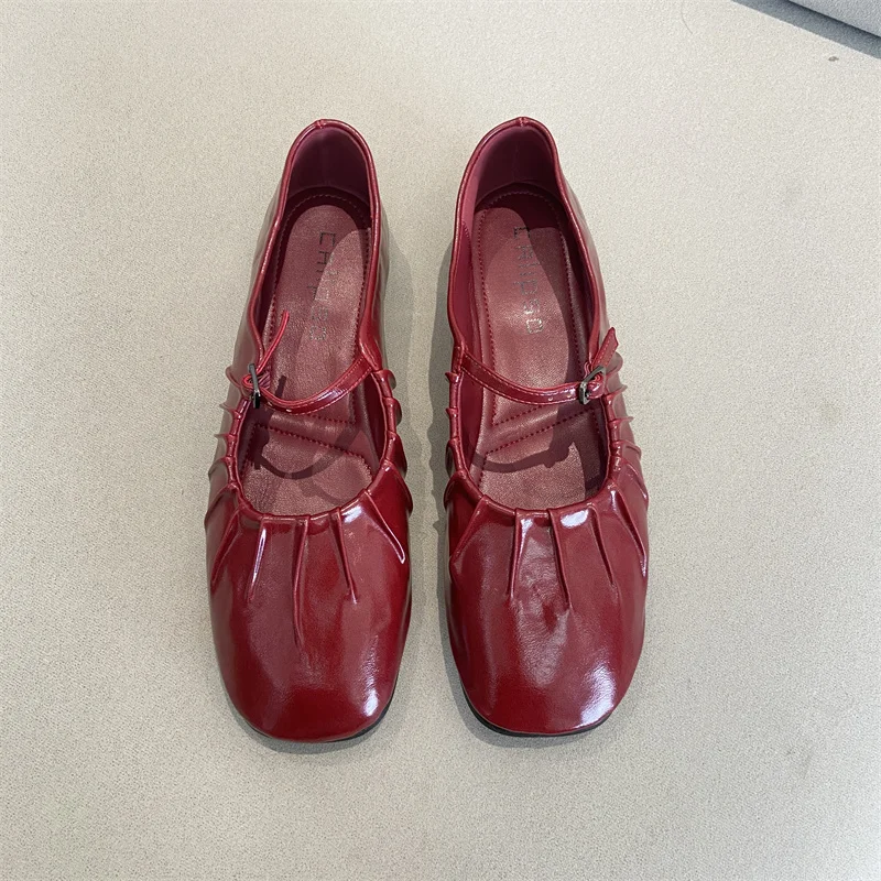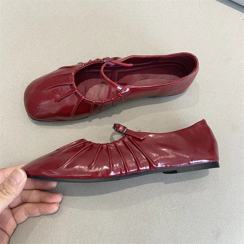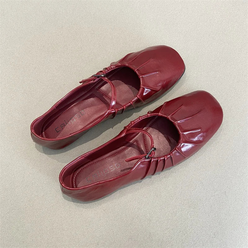 Cyflymder Pleated Mary Janes Flats Shoes Women Square Toe Pu Leather Comfortable Elegant Red Shoes Ladies Shallow Black Ballet Flats New