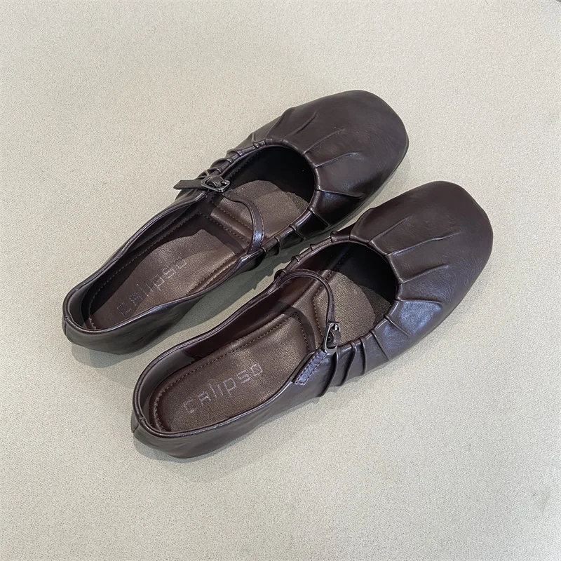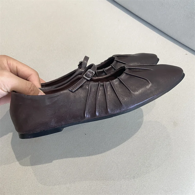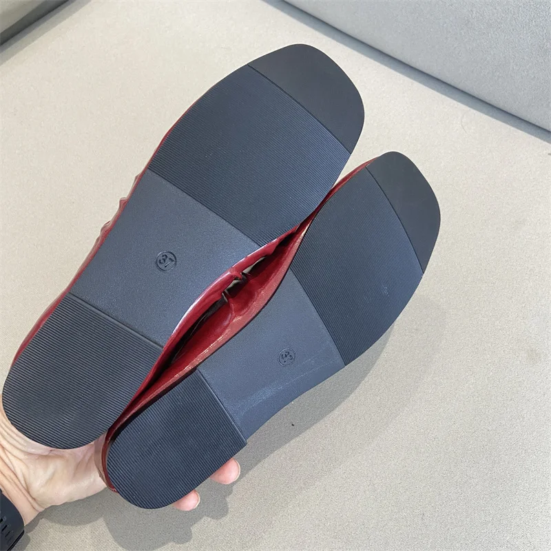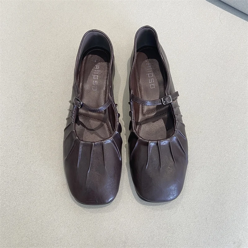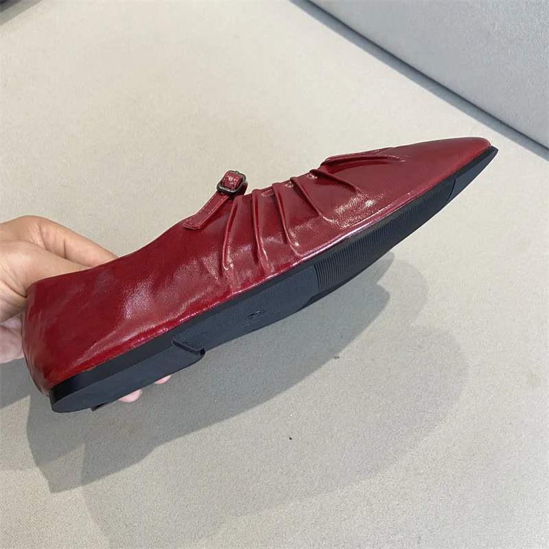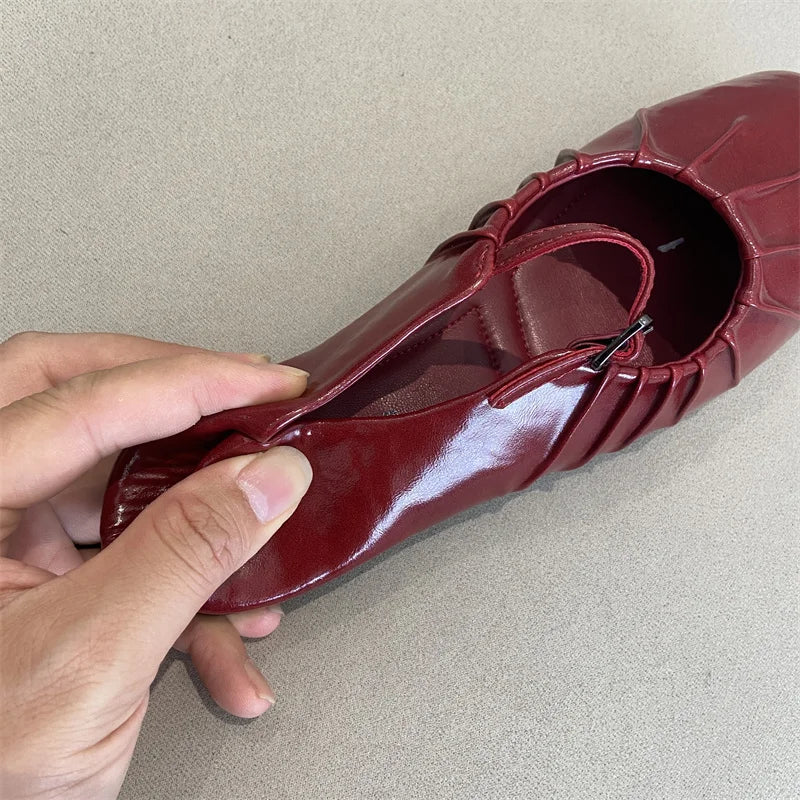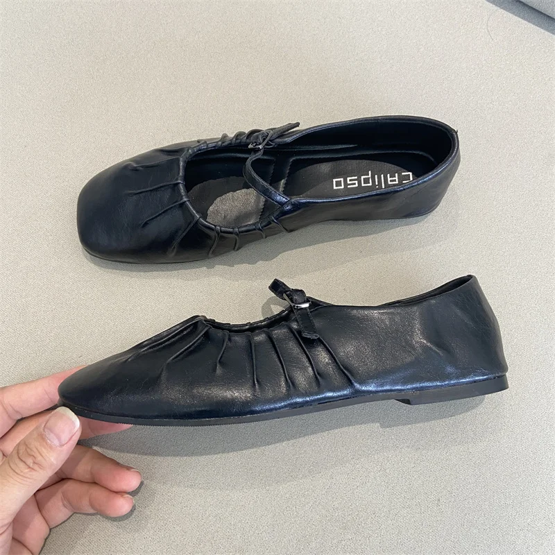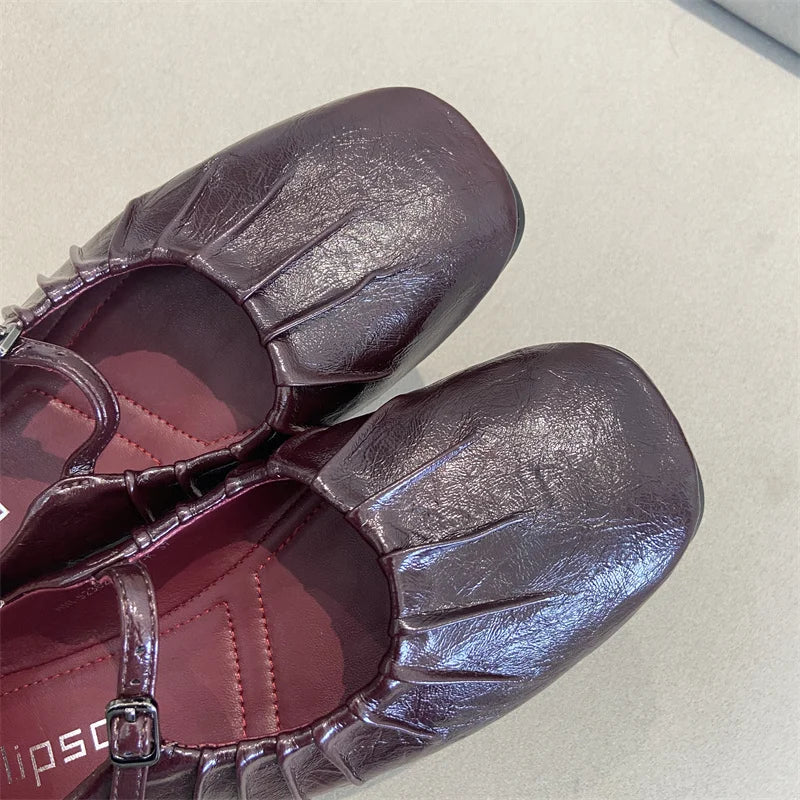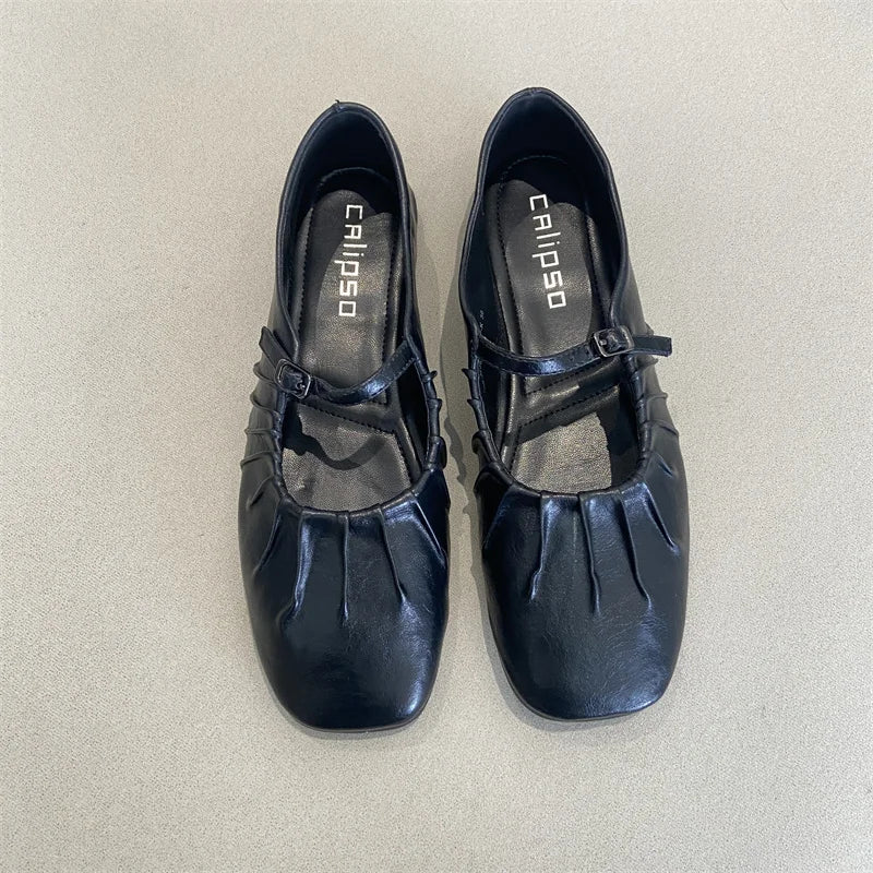 Cyflymder Pleated Mary Janes Flats Shoes Women Square Toe Pu Leather Comfortable Elegant Red Shoes Ladies Shallow Black Ballet Flats New