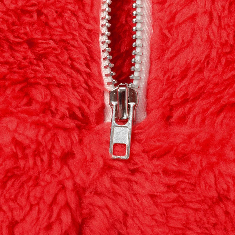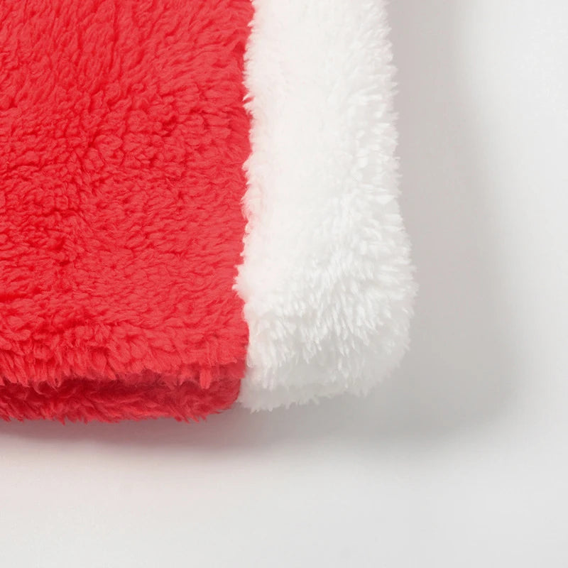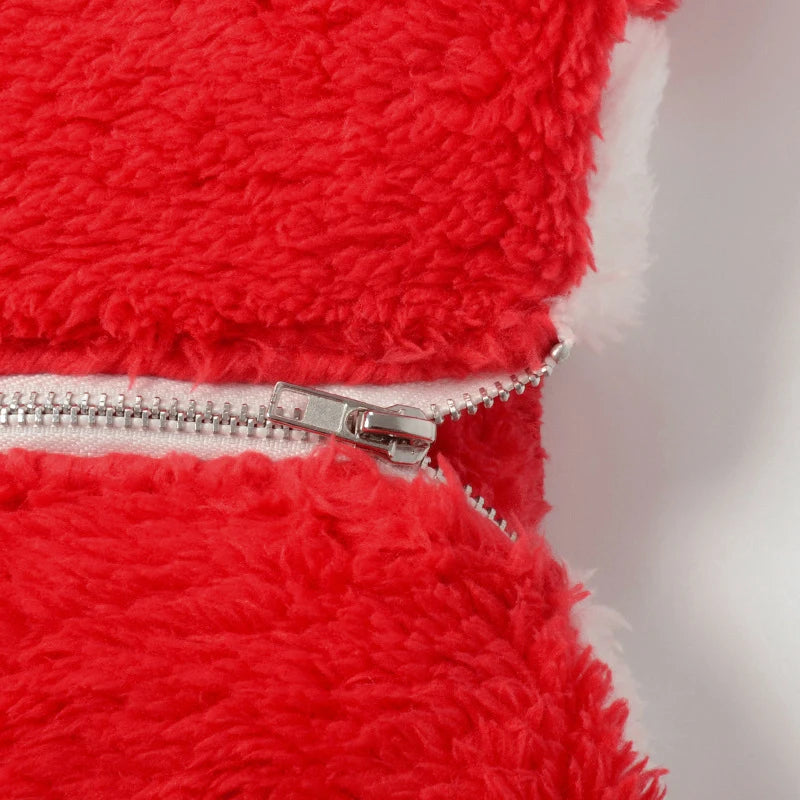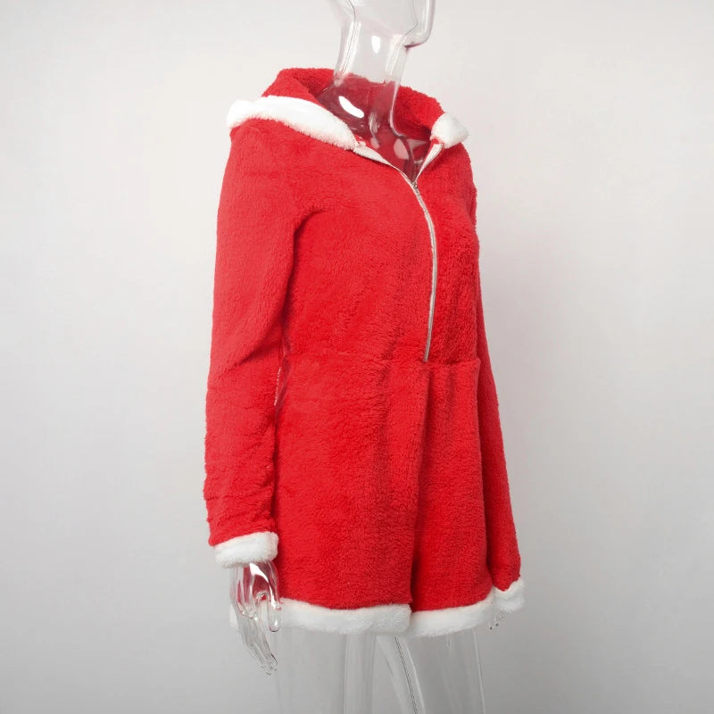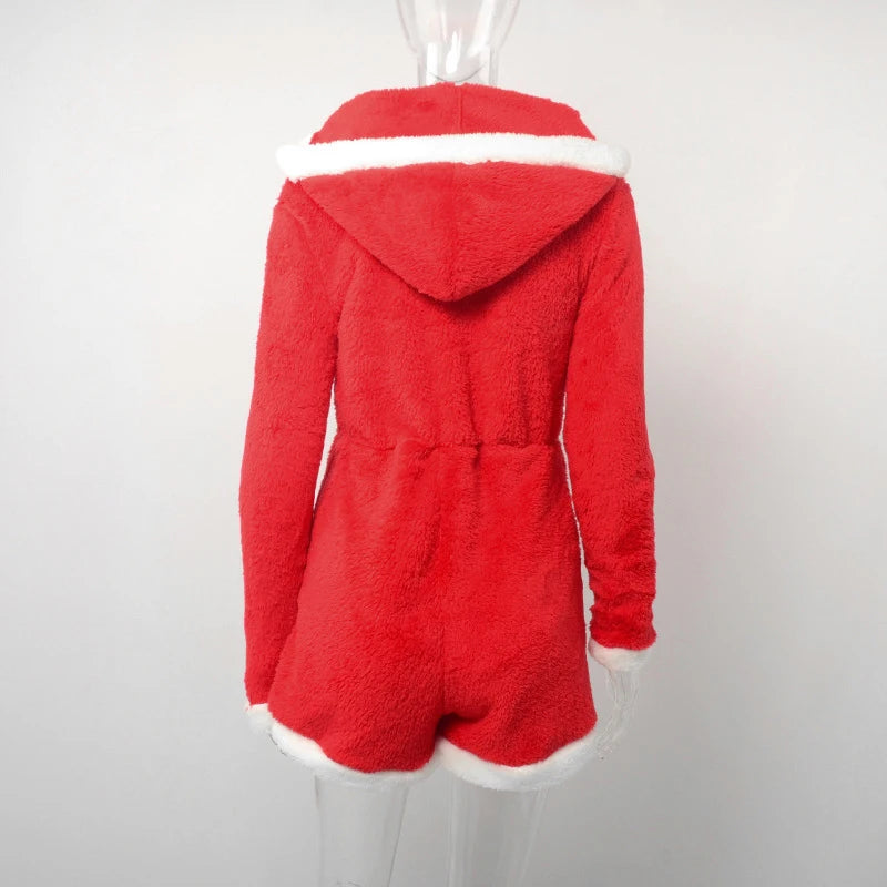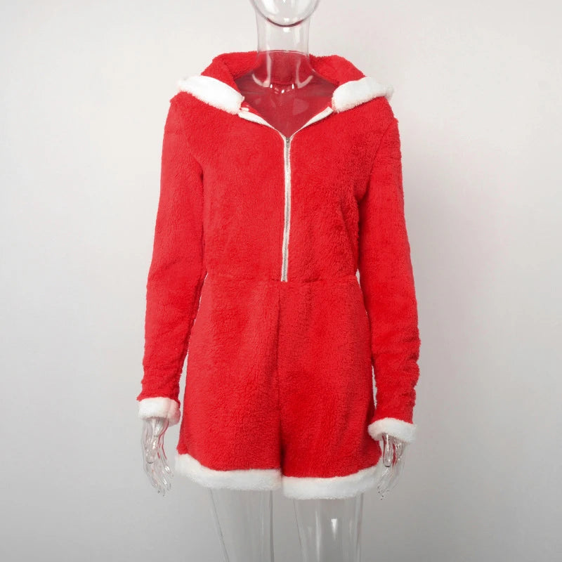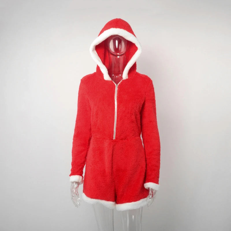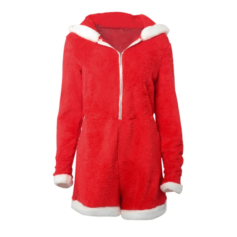Cyflymder Plush Color Patchwork Xmas Women's Sexy Hooded Playsuits Loose Fitting Front Zip High-waist Home Casual Comfort Romper Sleepwear